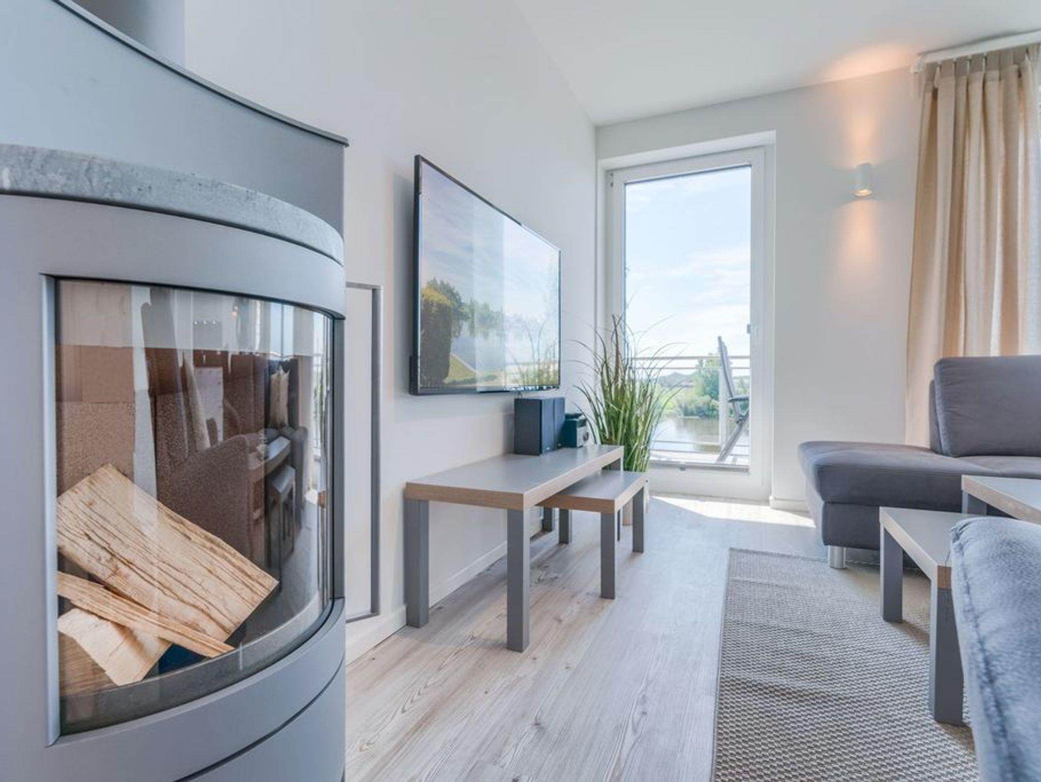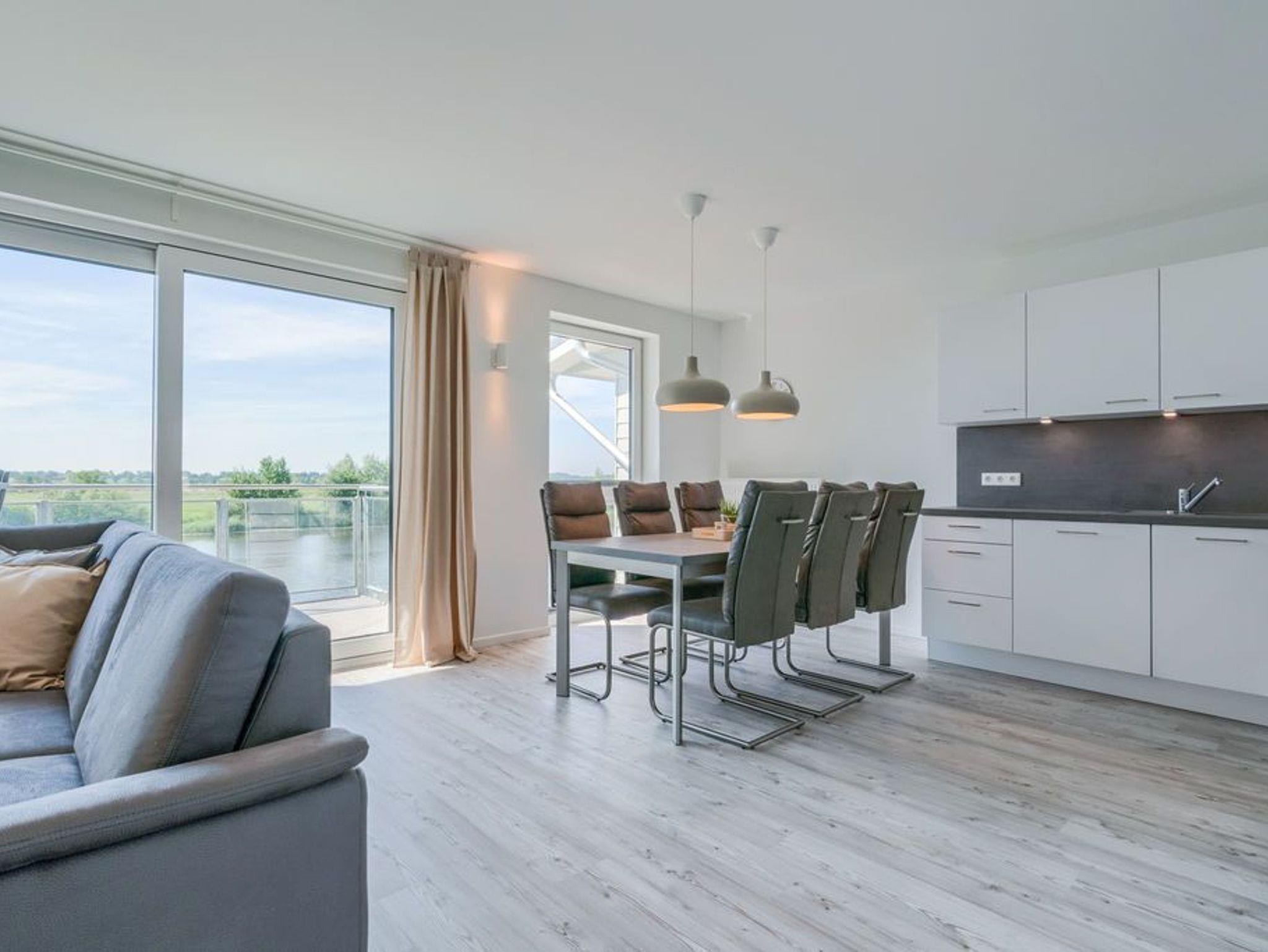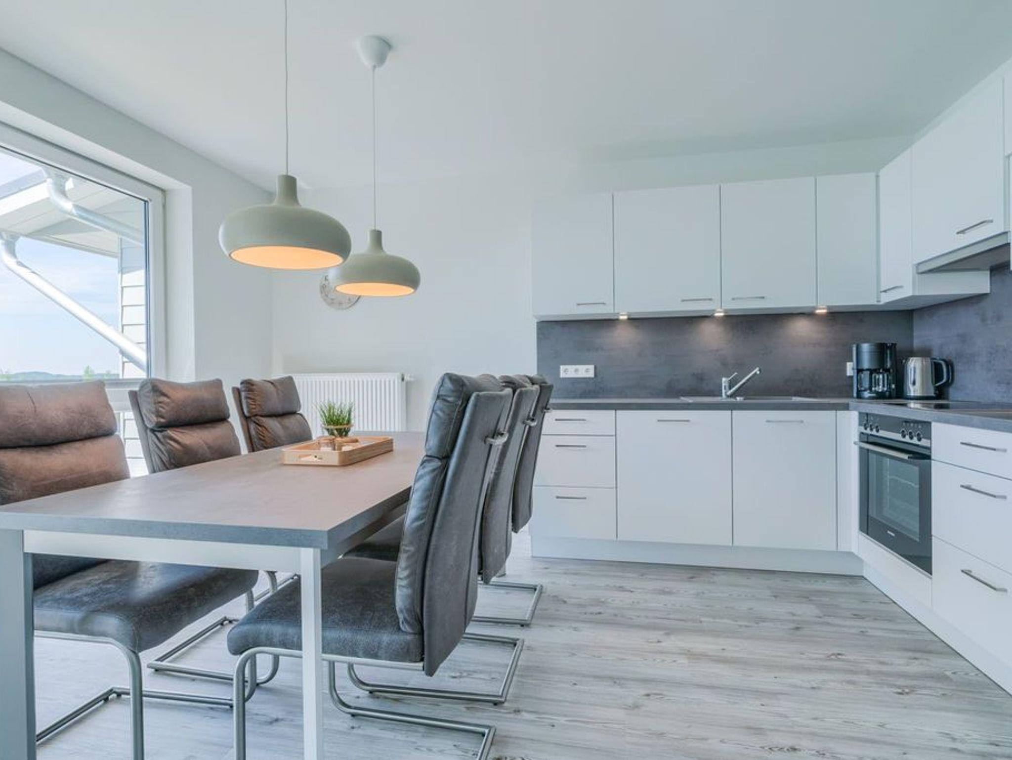 In der modernen Küchenecke bringt das Zubereiten der Speisen in der Gruppe Freude. Eine eingebaute Geschirrspülmaschine übernimmt anschließend den Abwasch, während Sie bei einem Wein auf dem Balkon den Tag Revue passieren lassen. Die Glasumrundung des Balkons schützt vor frischen Winden und lässt den Blick frei auf die wunderschöne Eider.