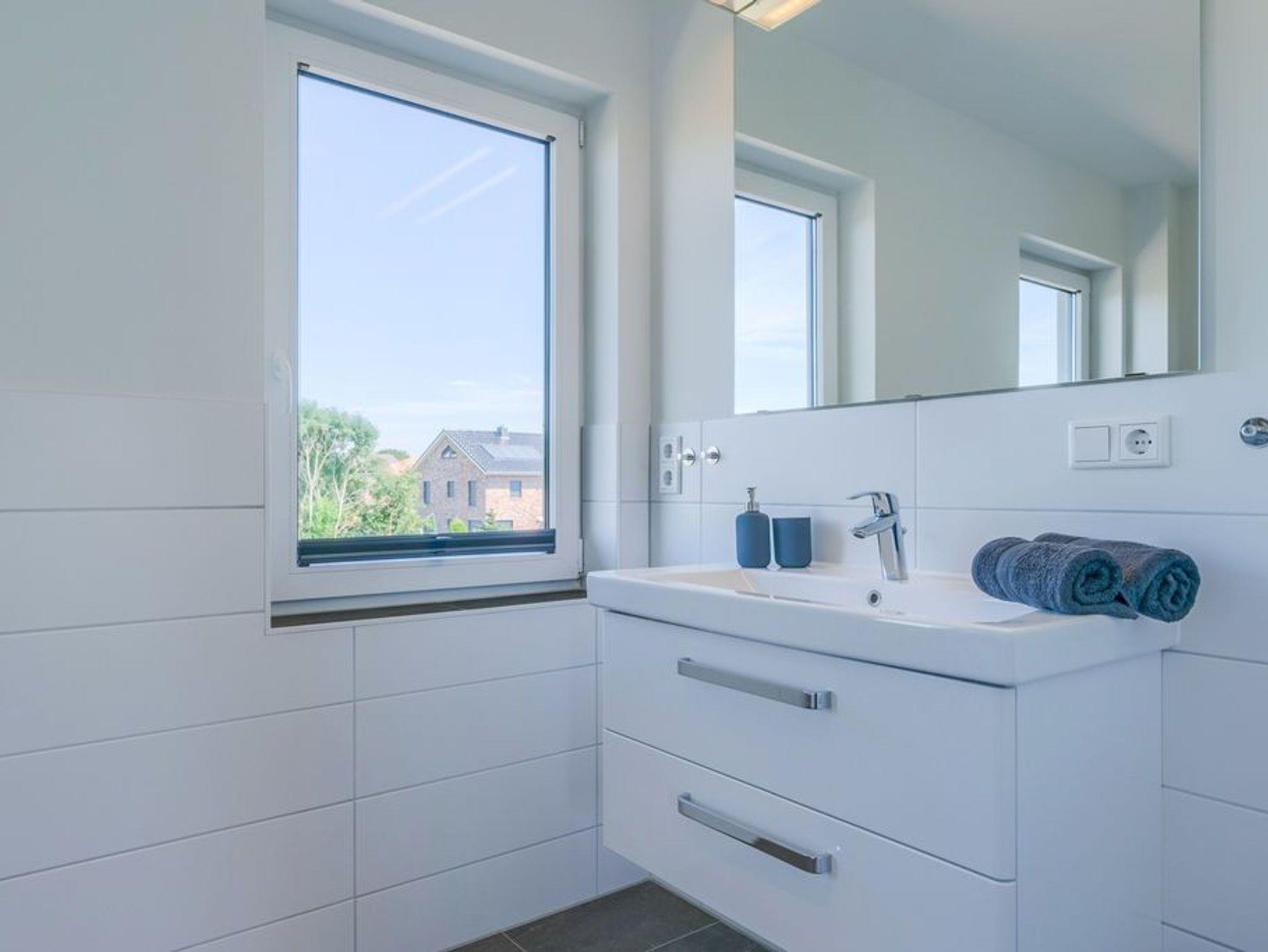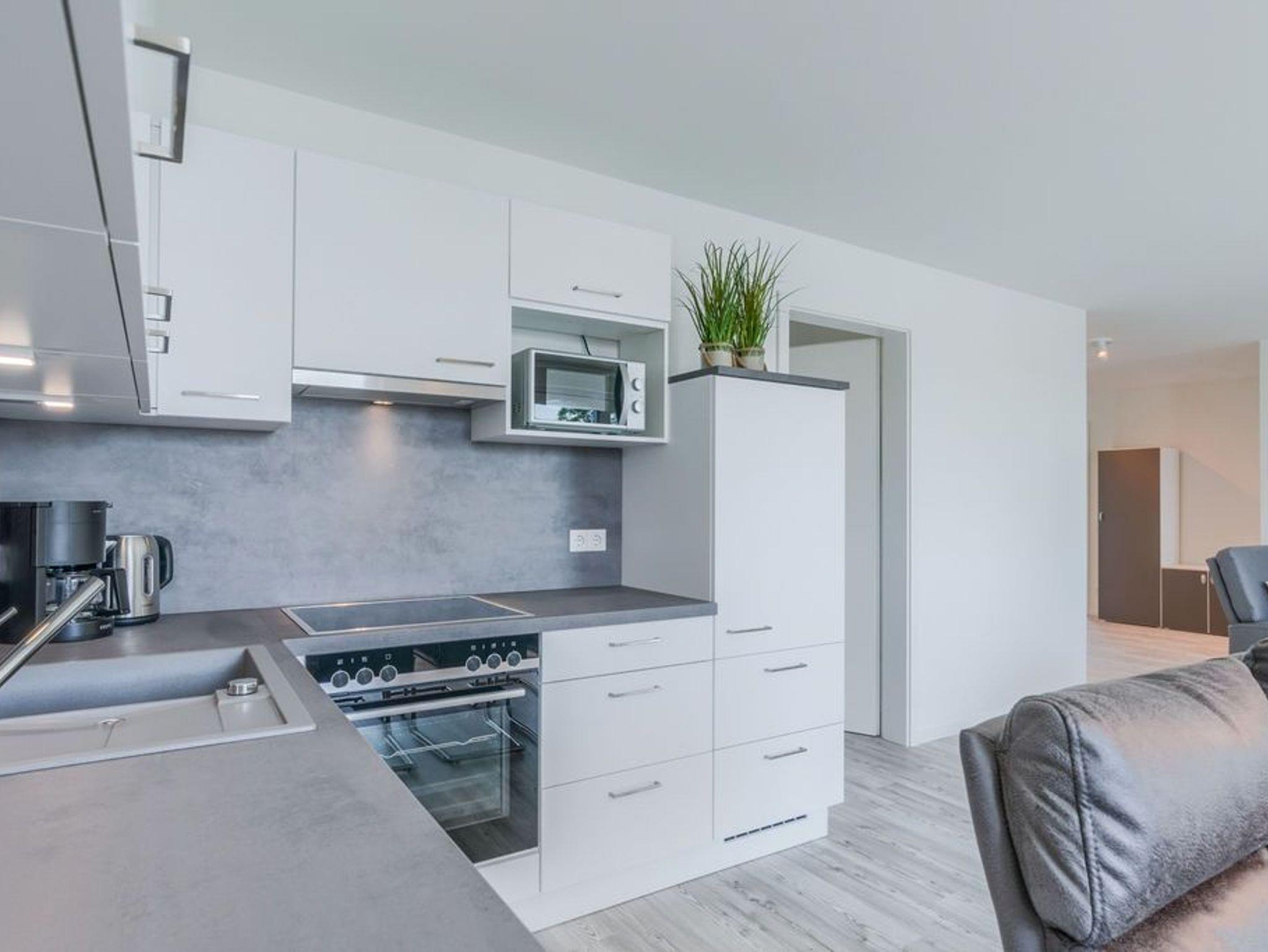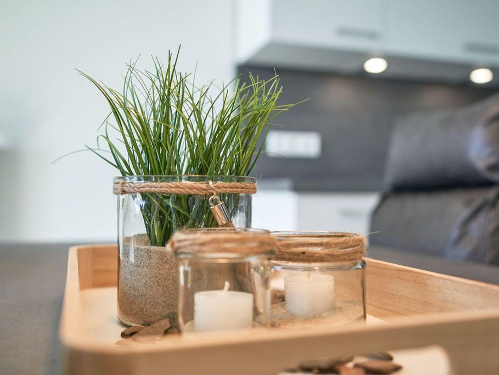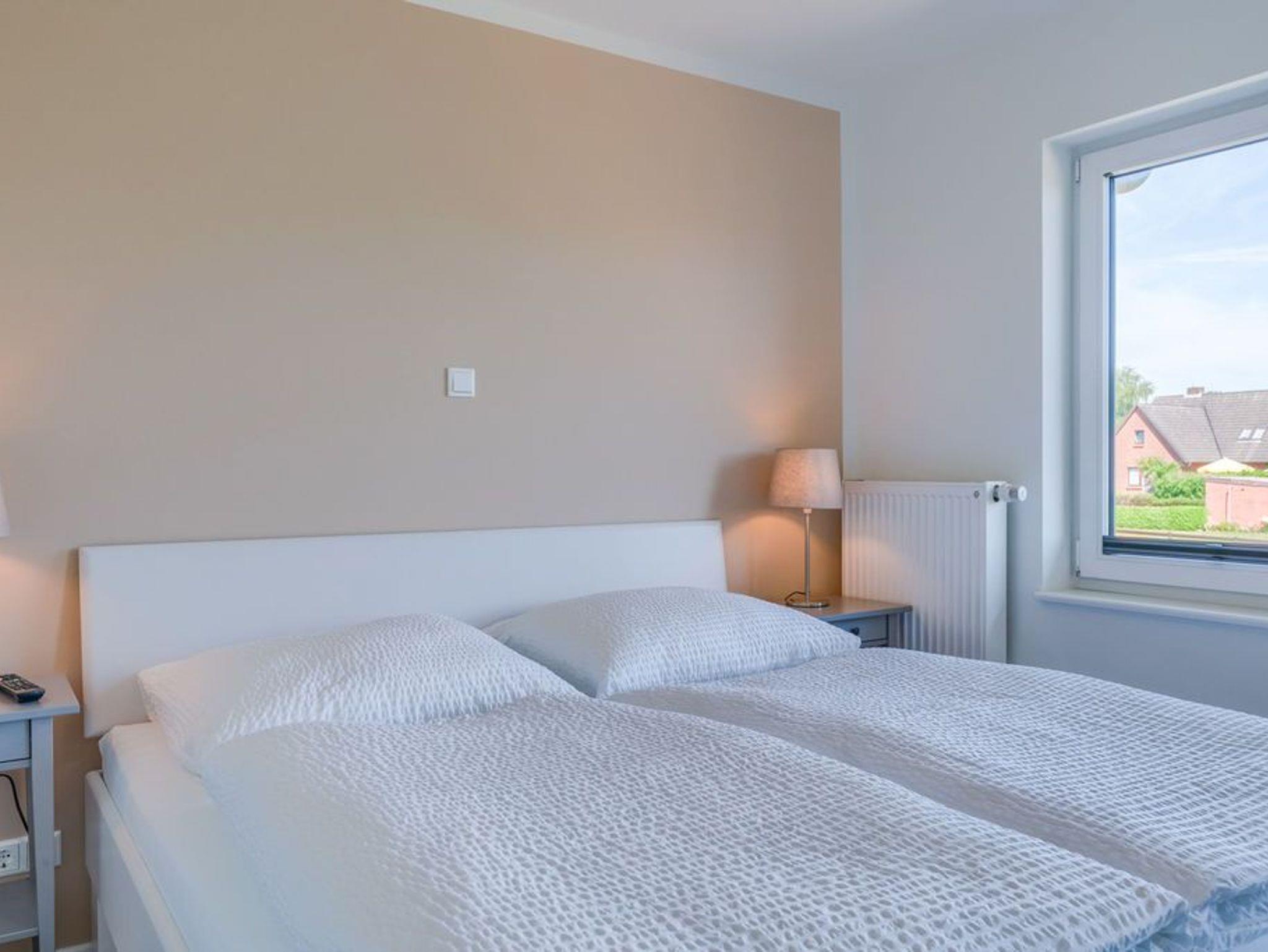 In der modernen Küchenecke bringt das Zubereiten der Speisen in der Gruppe Freude. Eine eingebaute Geschirrspülmaschine übernimmt anschließend den Abwasch, während Sie bei einem Wein auf dem Balkon den Tag Revue passieren lassen. Die Glasumrundung des Balkons schützt vor frischen Winden und lässt den Blick frei auf die wunderschöne Eider.