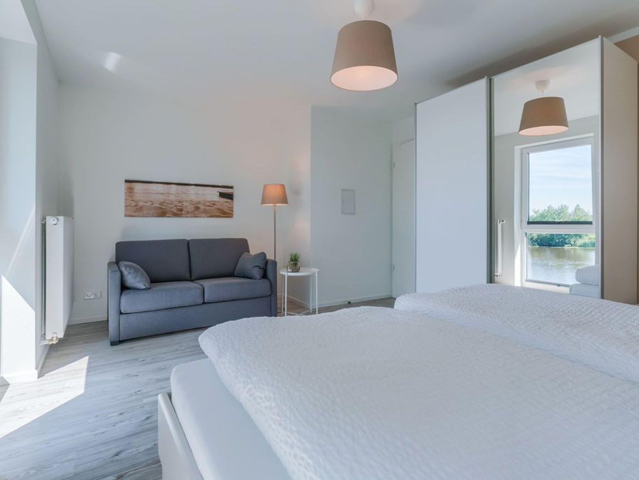 Das südlich ausgerichtete Schlafzimmer verfügt zusätzlich zum Komfortbett über ein Faltsofa mit hochwertigem Lattenrost und Schlafmatratze. Dieses steht, kombiniert mit einem kleinen Beistelltisch und einer Leselampe, in einer kleinen, gemütlichen Nische mit freiem Blick nach draußen. Hier können Sie sich zurückziehen, etwas Ruhe genießen und es sich gemütlich machen.