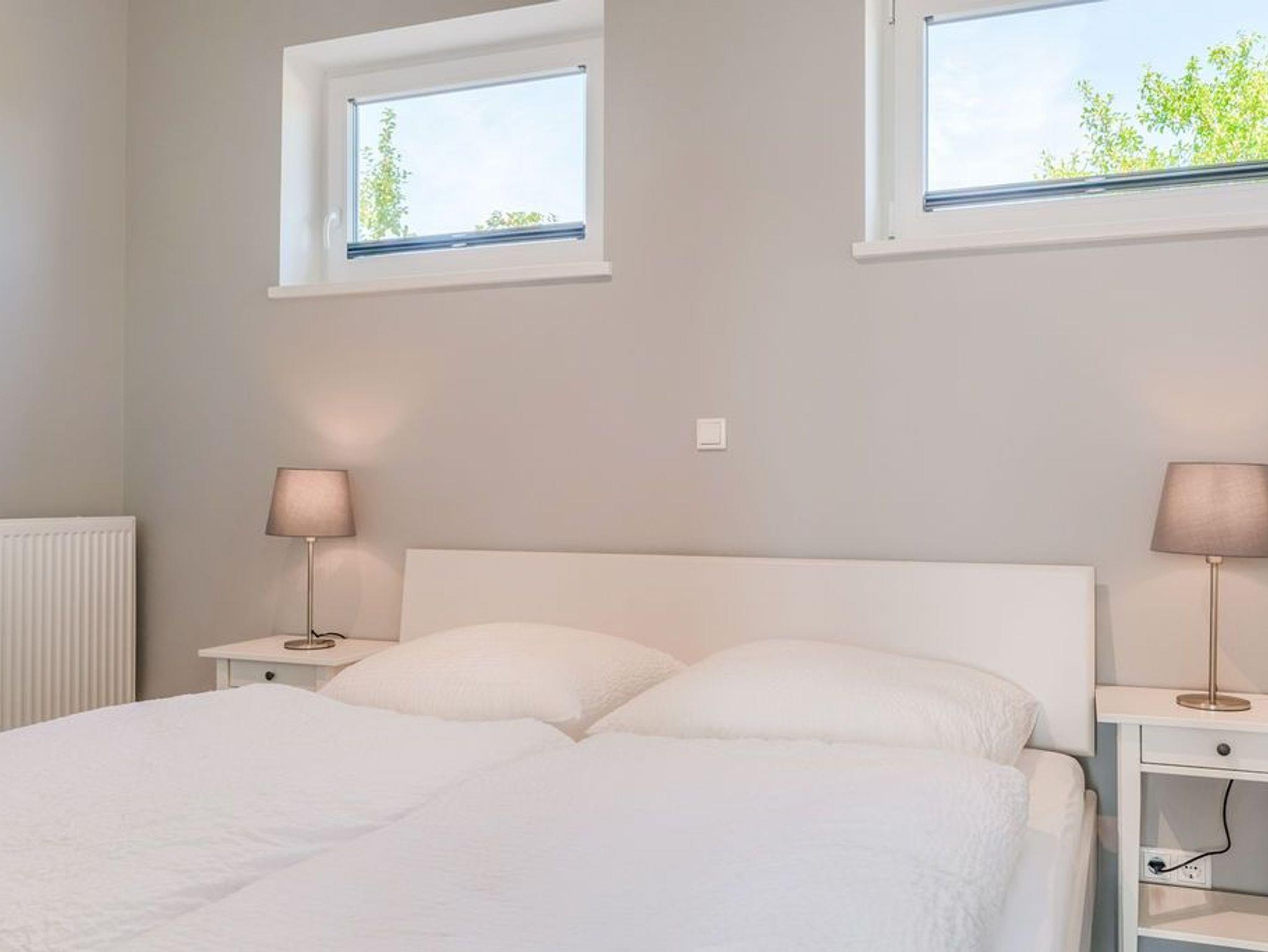 Im Schlafzimmer erwartet Sie ein frisch bezogenes Doppelkomfortbett. Das ruhige Grau der rückwärtigen Wände beruhigt die Sinne und lässt Sie entspannt in den Schlaf kommen.