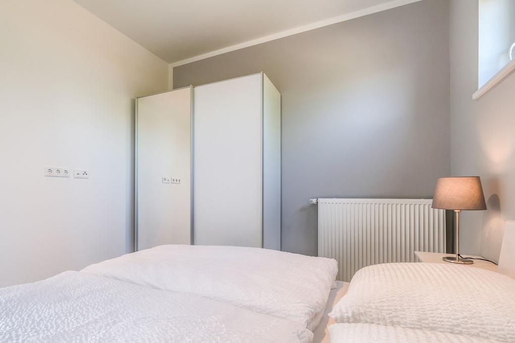 Im Schlafzimmer erwartet Sie ein frisch bezogenes Doppelkomfortbett. Das ruhige Grau der rückwärtigen Wände beruhigt die Sinne und lässt Sie entspannt in den Schlaf kommen.