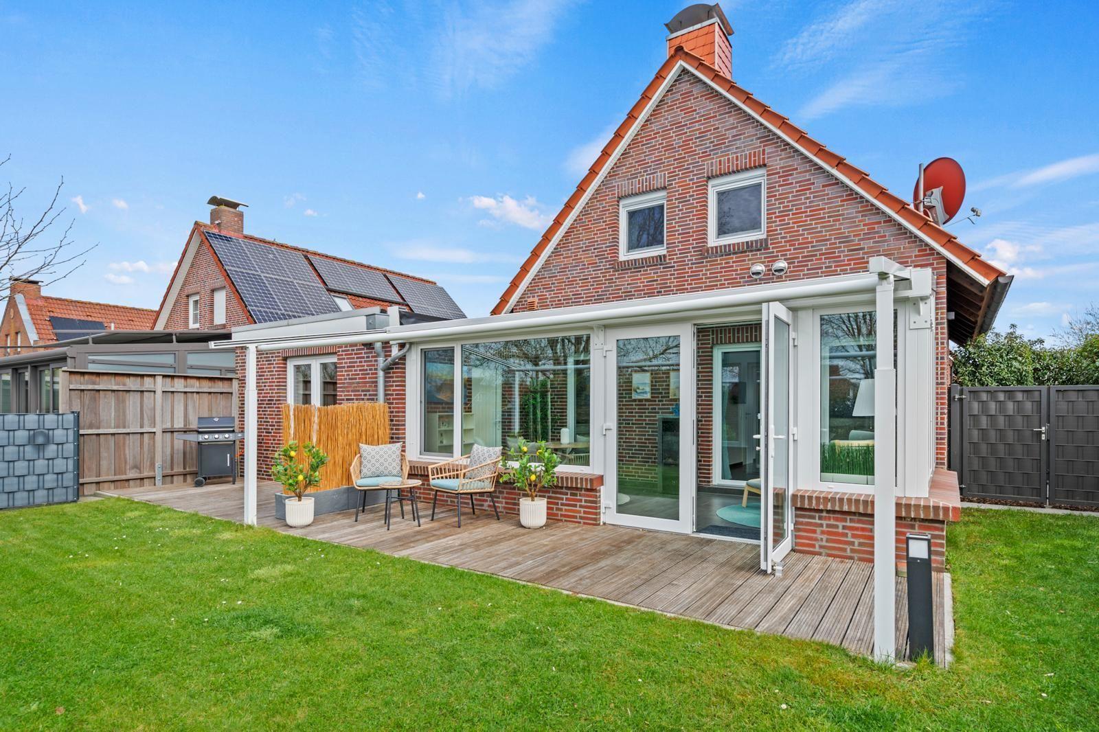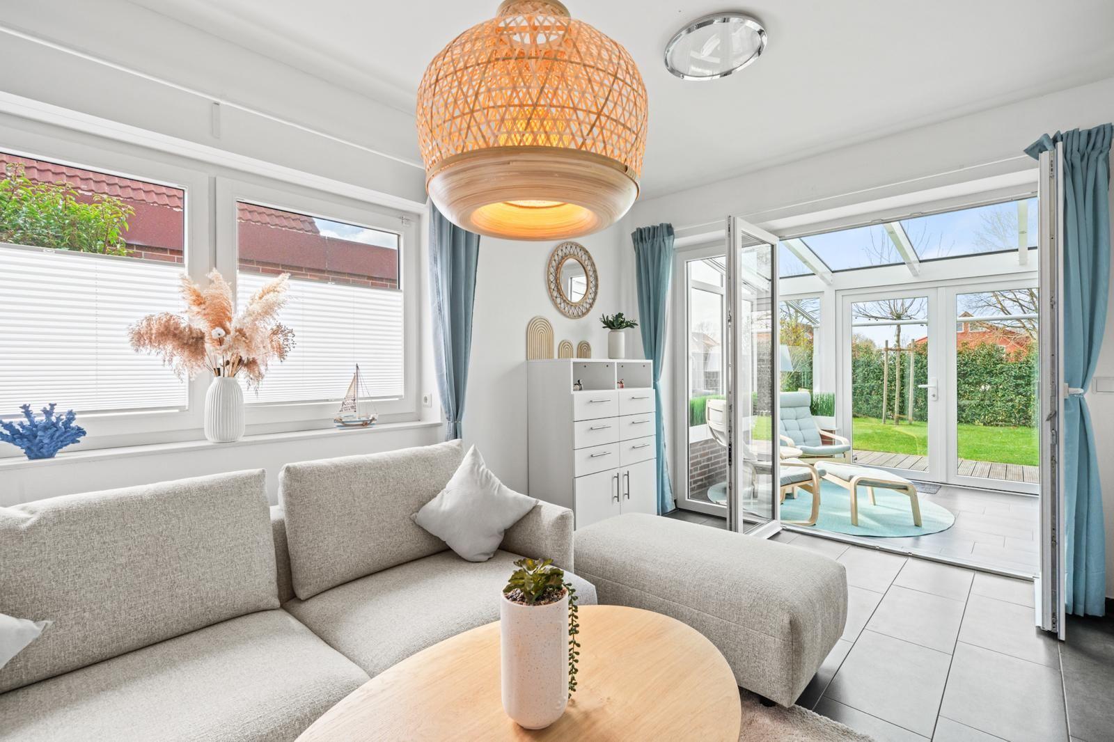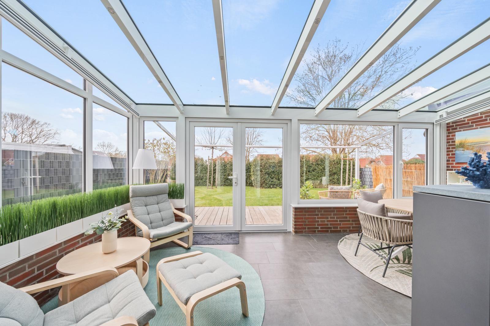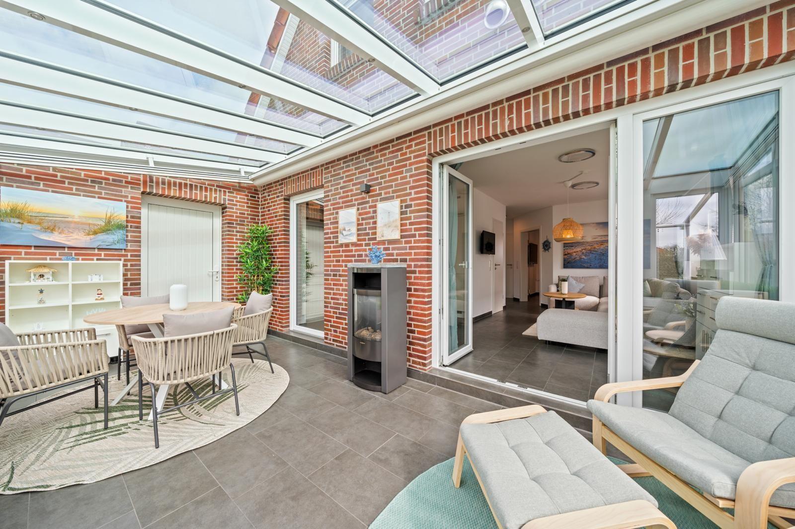 Das Innere des Ferienhauses bietet auf 105?m² ein modernes und gleichzeitig gemütliches Ambiente. Zwei Schlafzimmer und zwei Bäder sorgen für ausreichend Privatsphäre, während die hochwertig ausgestattete Küche keine Wünsche offenlässt. Ein besonderes Highlight ist der gemütliche Wohnbereich, der nahtlos in einen Wintergarten und die anliegende Terrasse übergeht, was einen einladenden Raum zum Entspannen und Zusammensein schafft.