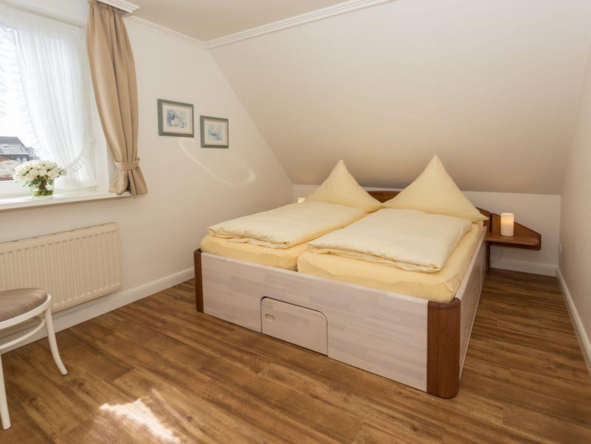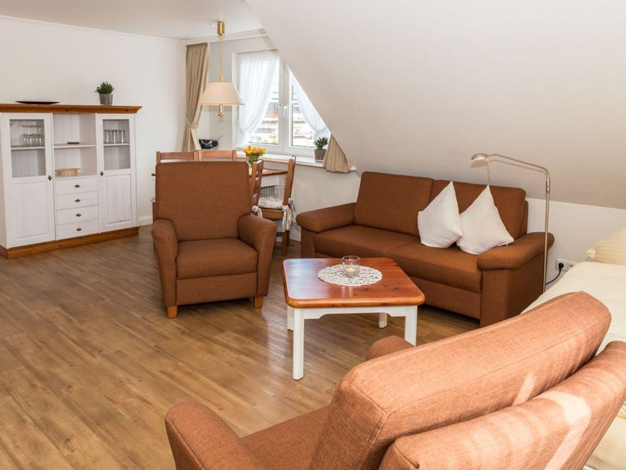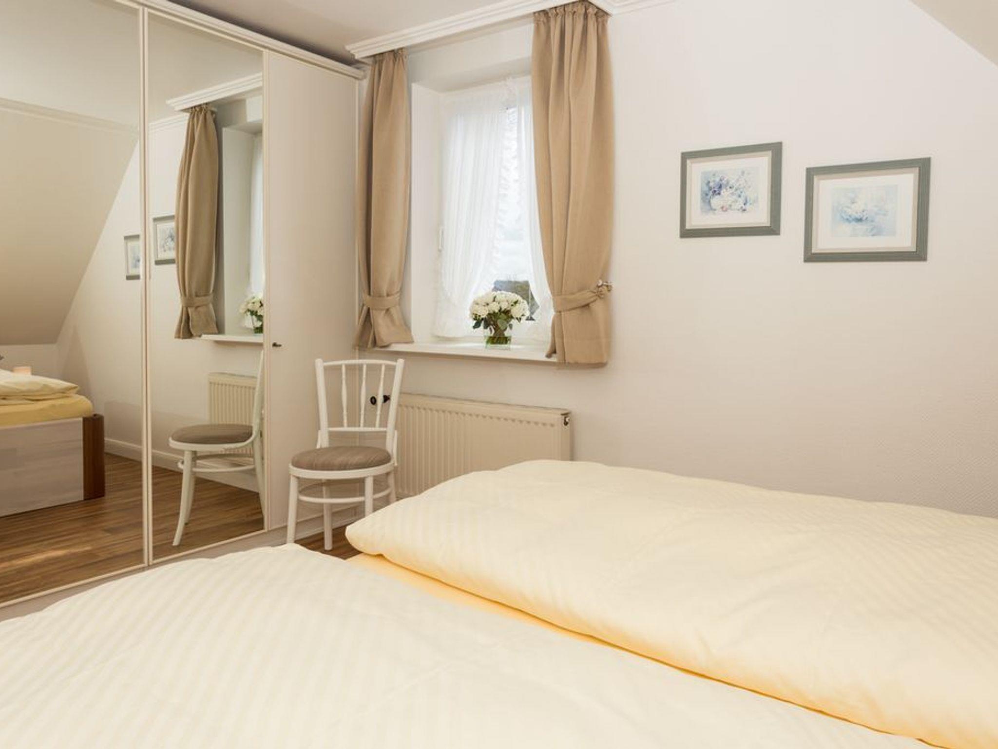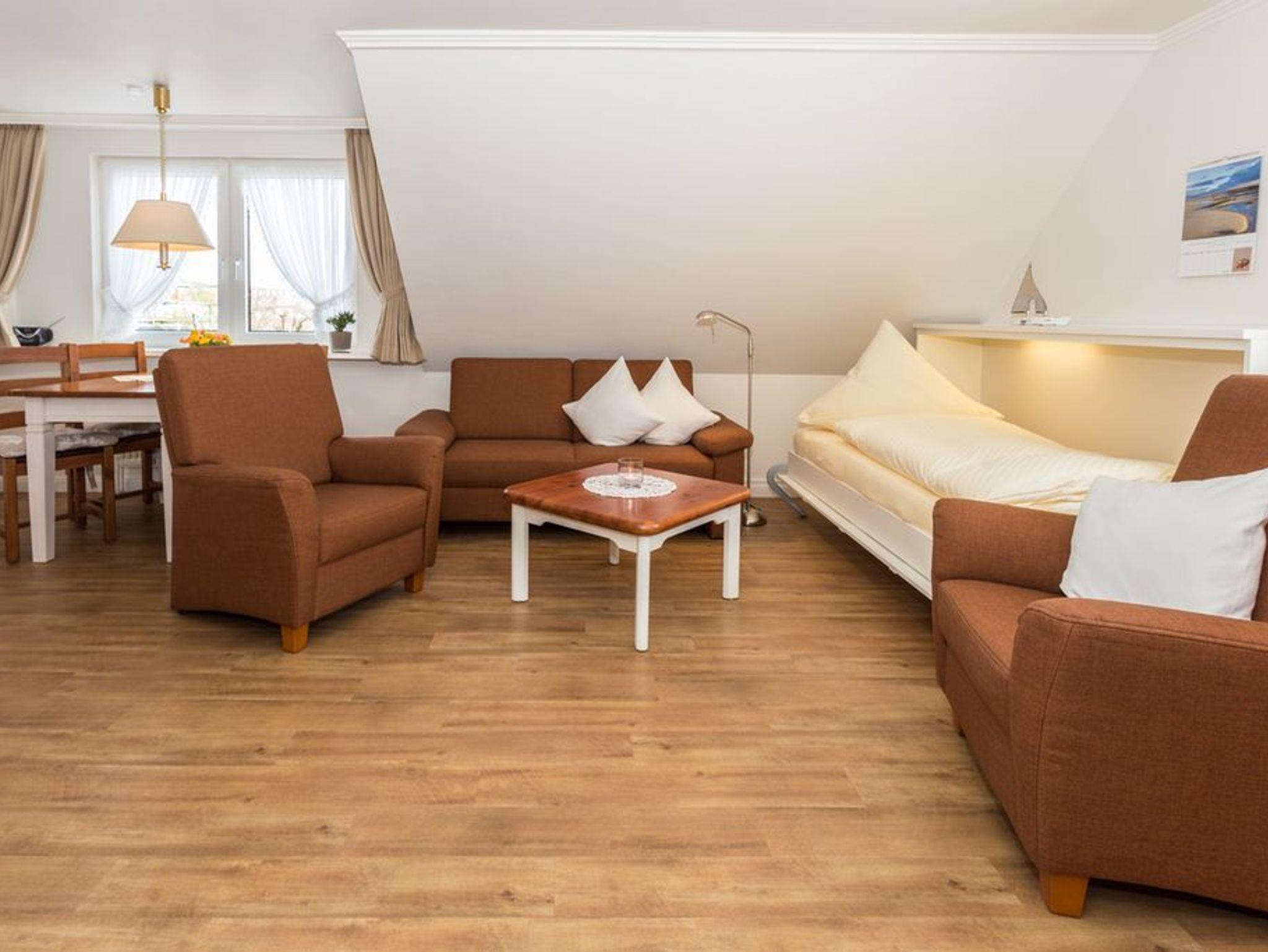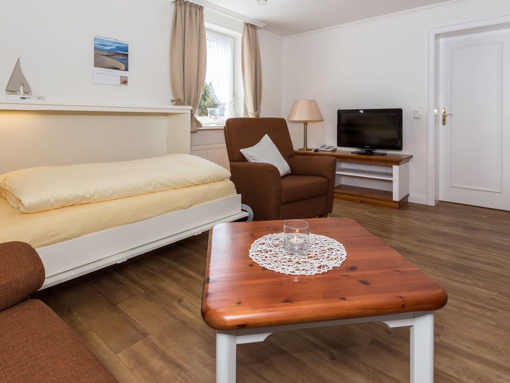 Die geräumige 2-Zimmer-Ferienwohnung für 2-3 Personen, ca. 45m², besteht aus einem separaten Schlafzimmer mit Doppelbett, Duschbad / WC, Wandklappbett im Wohnraum, Wohnzimmer mit Essplatz sowie Sitzgruppe, Flat-TV, Radio, Telefon und kostenfreiem W-Lan. Die Küchenzeile ist zum Wohnraum offen mit Geschirrspüler und Mikrowelle ausgestattet. Waschmaschine sowie Trockner sind gemeinschaftlich auf der gleichen Ebene im Obergeschoß nutzbar. Ein Pkw-Stellplatz befindet sich vor dem Haus. Der gemeinschaftliche Außenbereich bietet einen Terrassenplatz mit Strandkorb und Gartenmöbeln, einen überdachten Sitzbereich, einen großzügigen Fahrradunterstand sowie Schränke für Ihre Golfbags. Tierhaltung ist nicht gestattet. Bettwäsche und Handtücher sind zur Anreise aufgezogen.