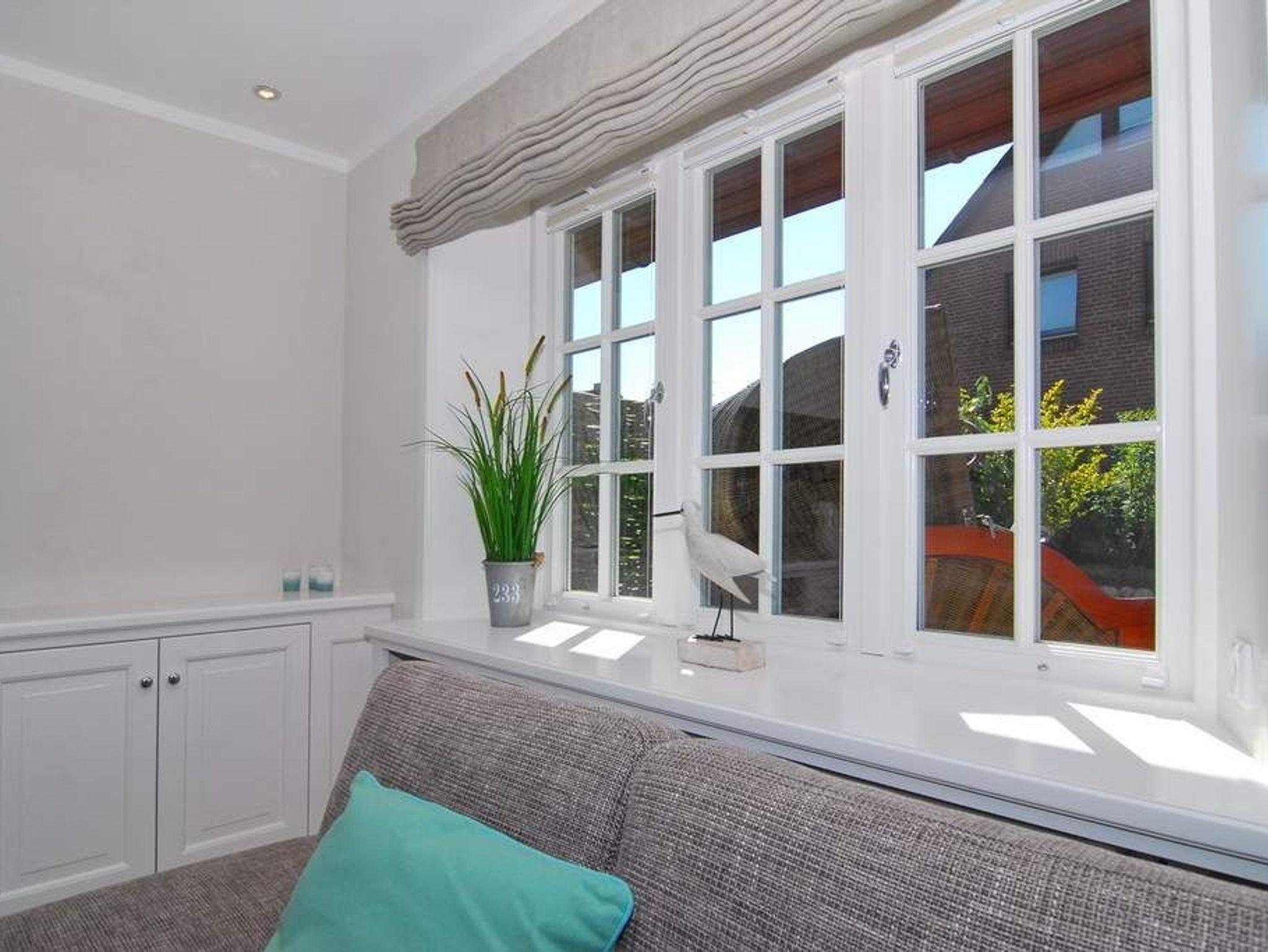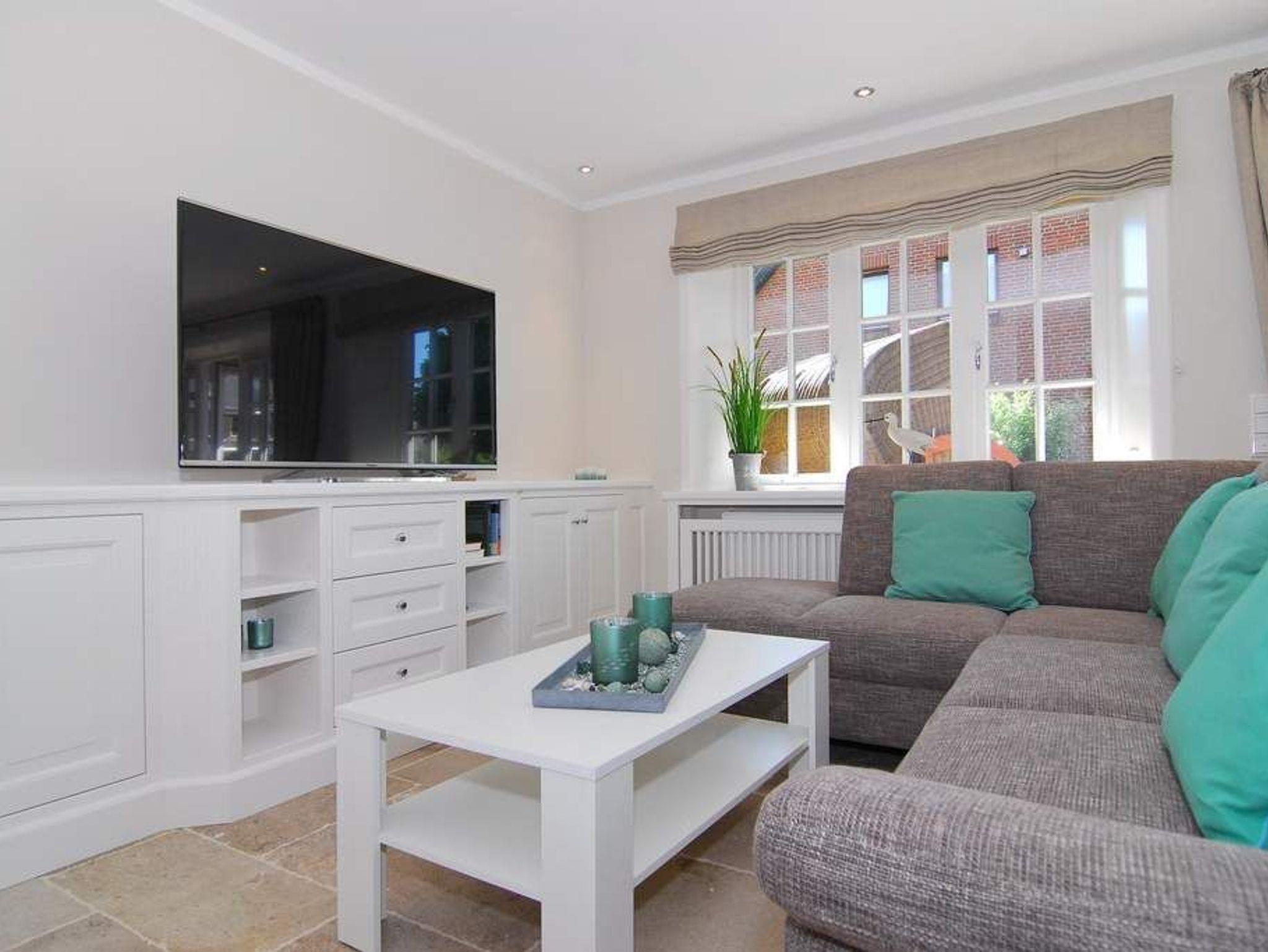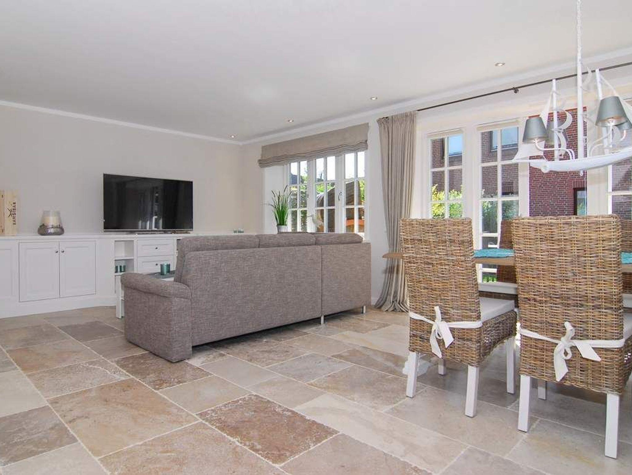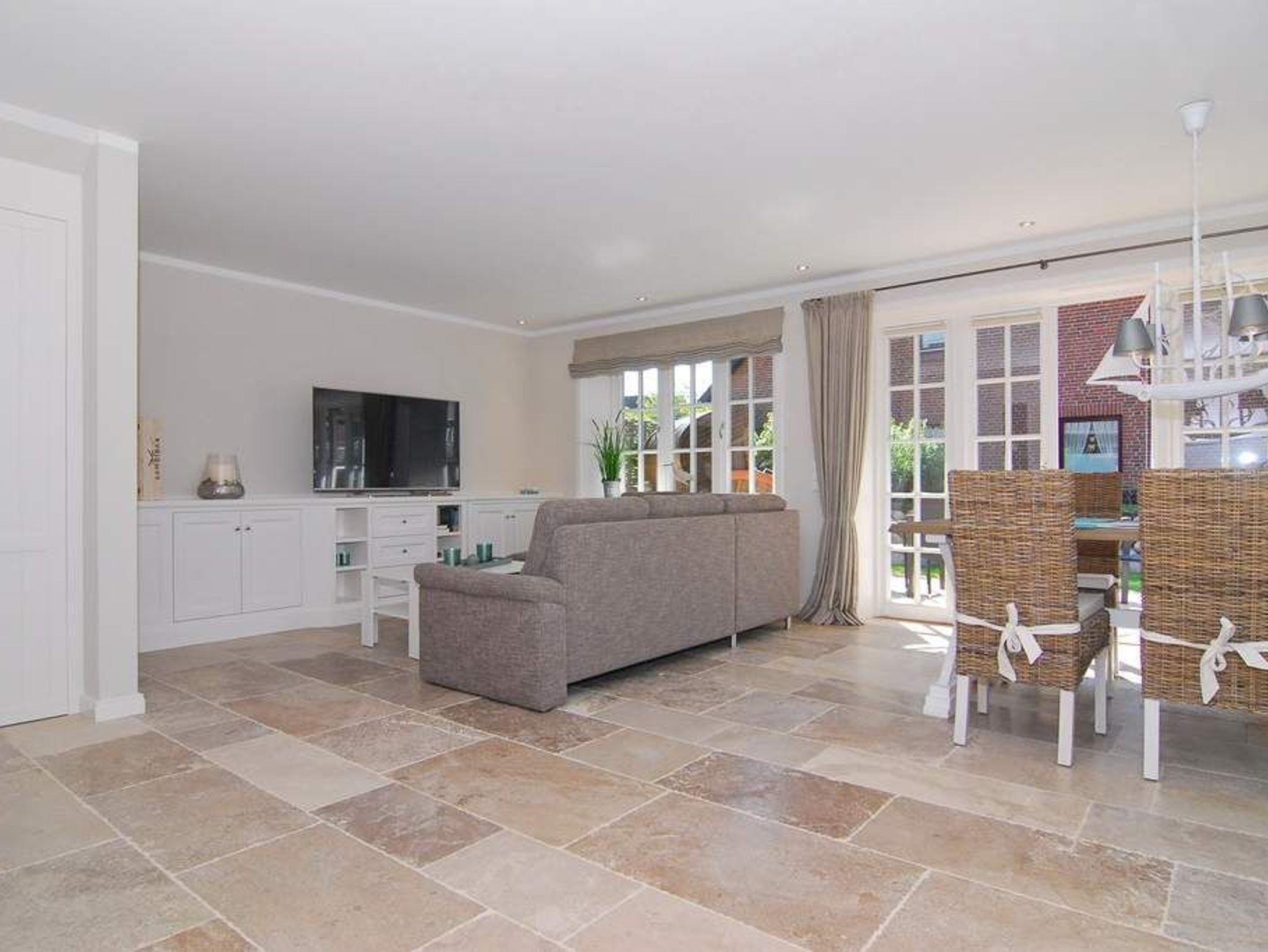Exklusives Ferienhaus (Haushälfte) im Friesenstil, ca. 115 m², Nichtraucher! EG: Wohnraum mit Sitz- und Essbereich, Flat-TV und Stereoanlage, Blue Ray Player, offene Einbauküche mit Geschirrspüler, Mikrowelle und Backofen, Westterrasse mit Gartenmöbeln, Gäste/WC. Abstellraum mit Waschmaschine / Trockner. OG: 1 Schlafzimmer mit Doppelbett und angrenzendes Duschbad/WC, 1 Schlafzimmer mit Doppelbett, Duschbad/WC. DG: 1 Schlafzimmer mit 2 Einzelbetten. PKW-Stellplatz am Haus. Tierhaltung gestattet (kostenpflichtig). Bettwäsche und Handtücher sind zur Anreise aufgezogen.