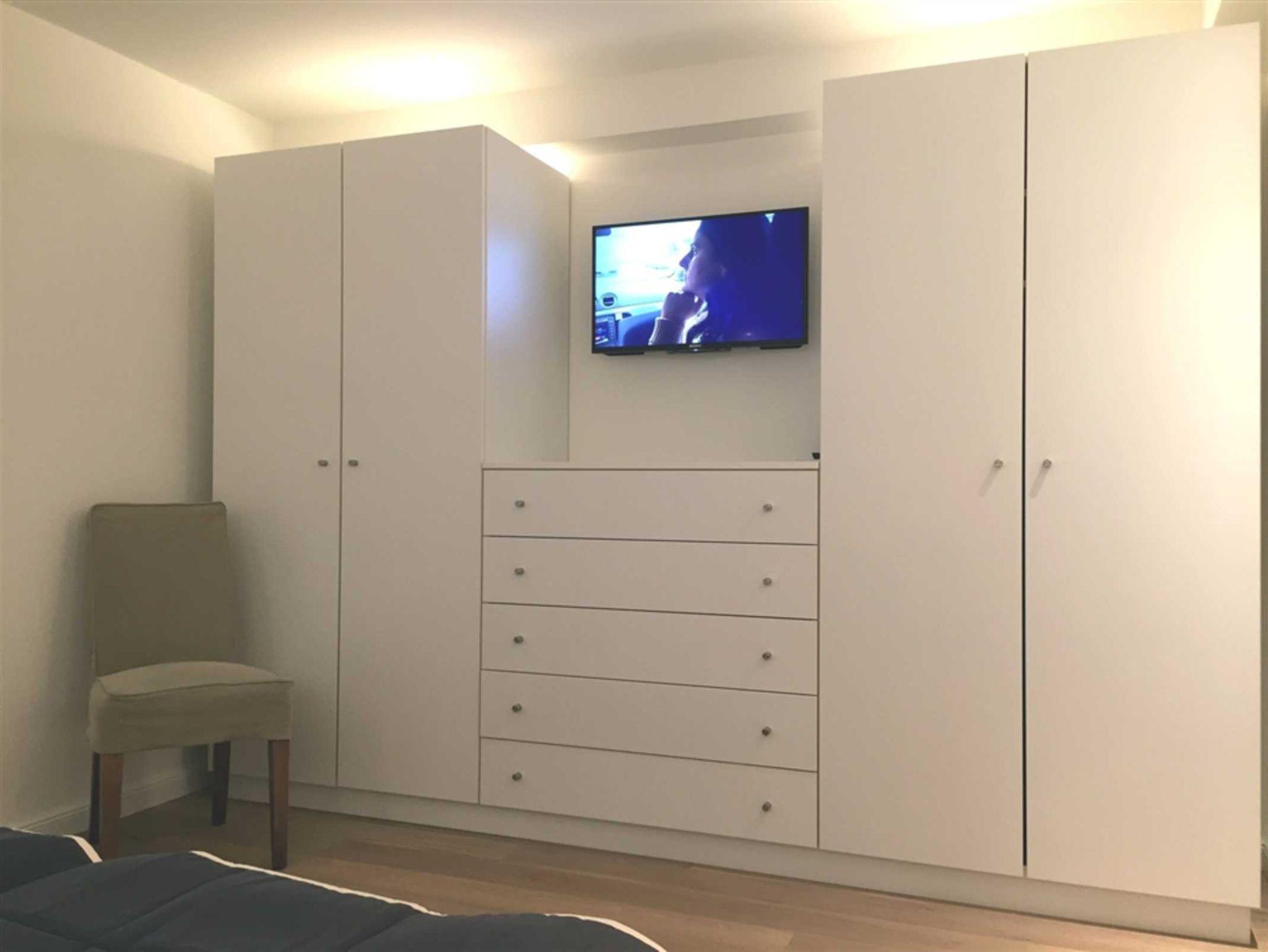 Das Haus verfügt insgesamt über vier Schlafzimmer. Im 1. Obergeschoss mit Dachschrägen sind ein größeres und ein sehr kleines Schlafzimmer vorzufinden. Die Betten haben die Größen 140x200cm (kleines Schlafzimmer) und 180x200cm (größeres Schlafzimmer). Das in Sandfarben gehaltene Bad im 1. OG verfügt über zwei Doppelwaschbecken, eine ebenerdige Dusche und eine Toilette. Im Untergeschoss finden Sie das dritte Schlafzimmer mit einem Doppelbett mit den Maßen 180x200cm, sowie ein weiteres Badezimmer.