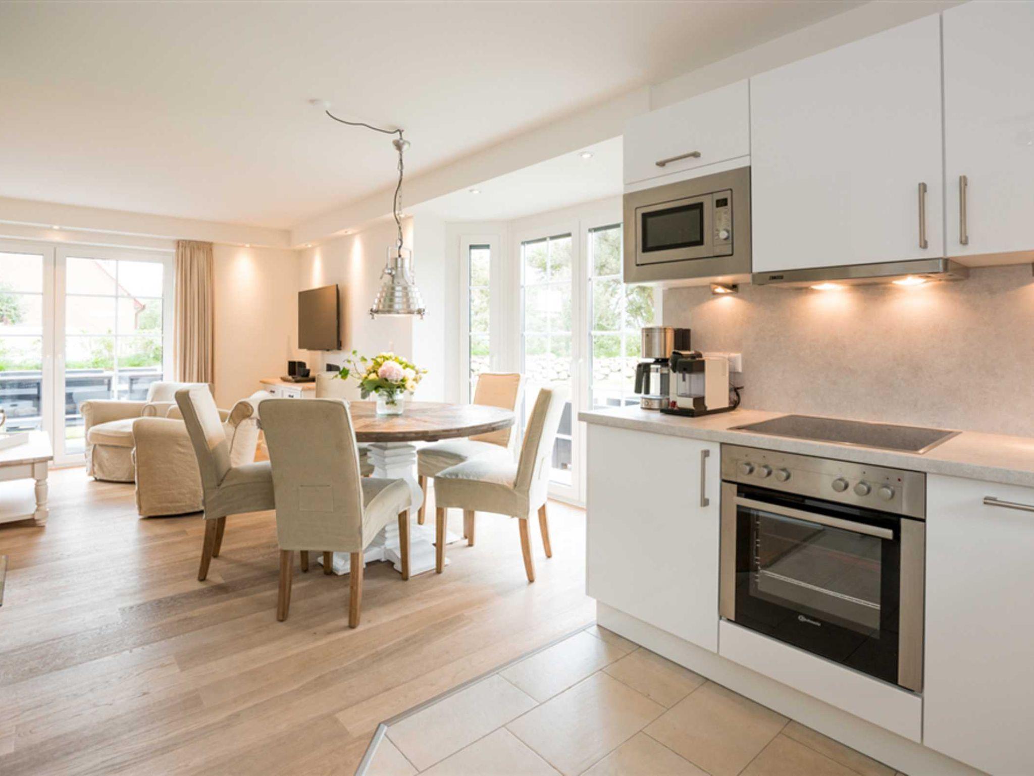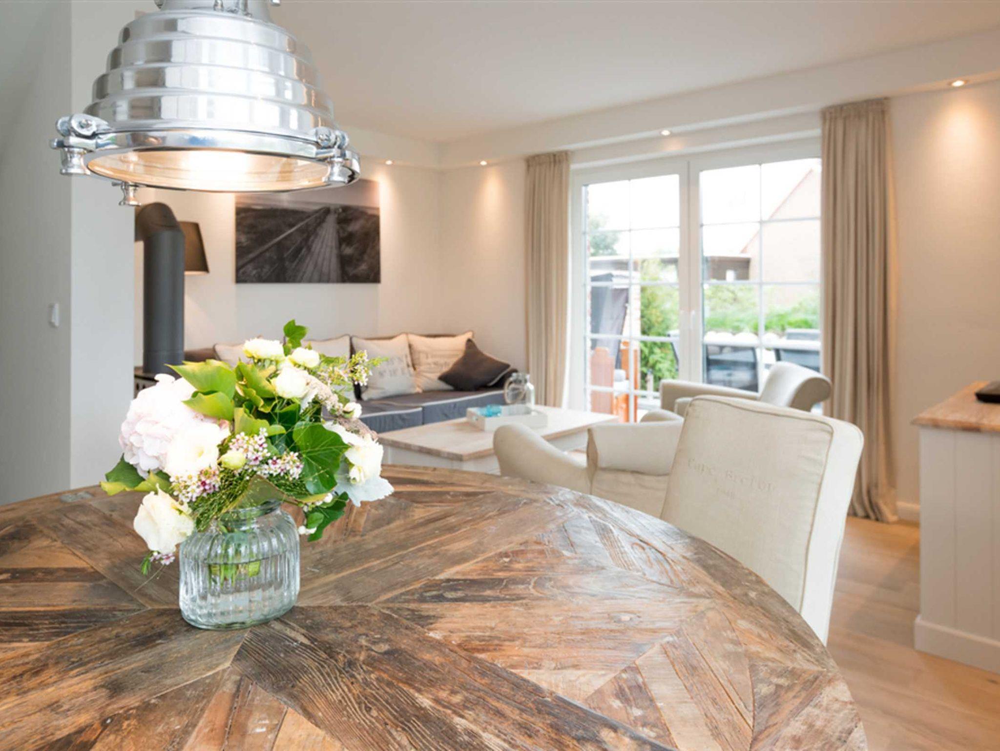Im Erdgeschoss des Hauses finden Sie das wunderschön eingerichtete Wohn/Esszimmer mit der daran angrenzenden, komplett in weiß gehaltenen, voll ausgestatteten Küche. Das Wohnzimmer verfügt über ein großes Sofa und zwei Sessel - das Highlight hier ist natürlich der Kaminofen mit Sichtfenster, der Wohlfühlatmosphäre garantiert.