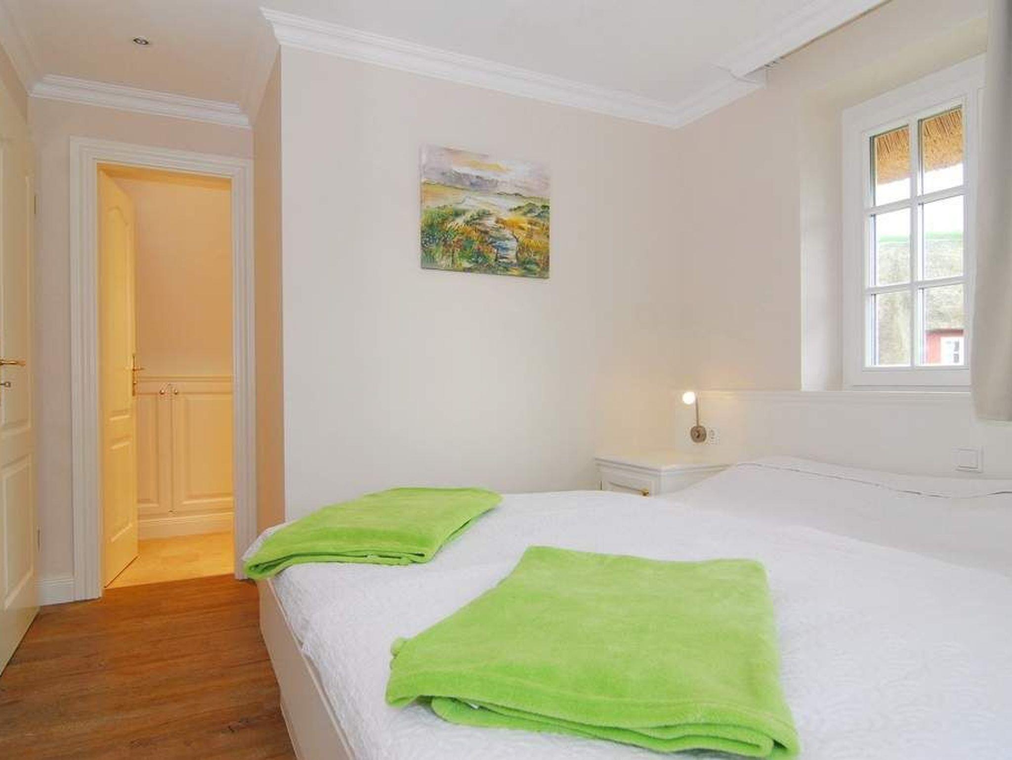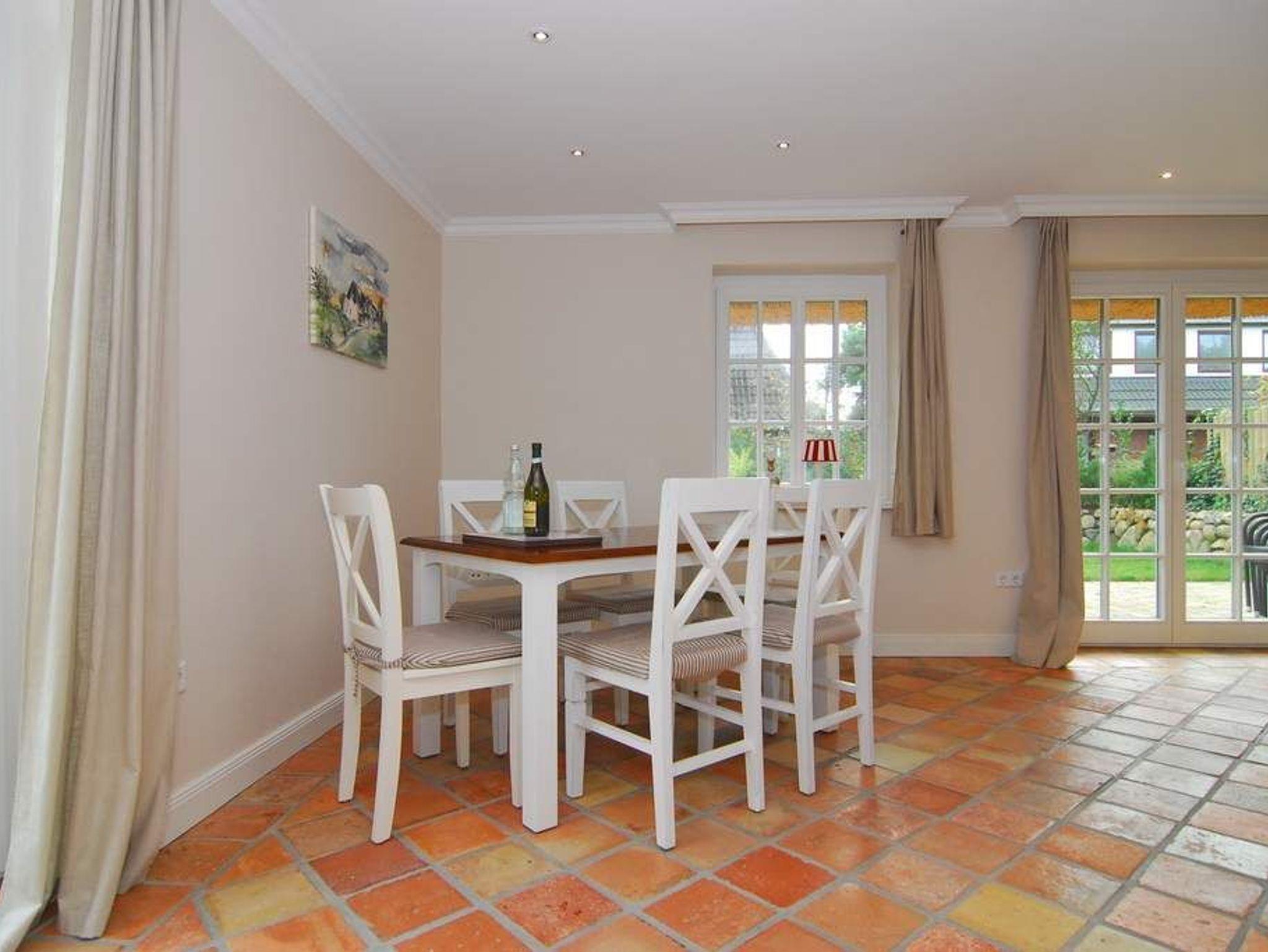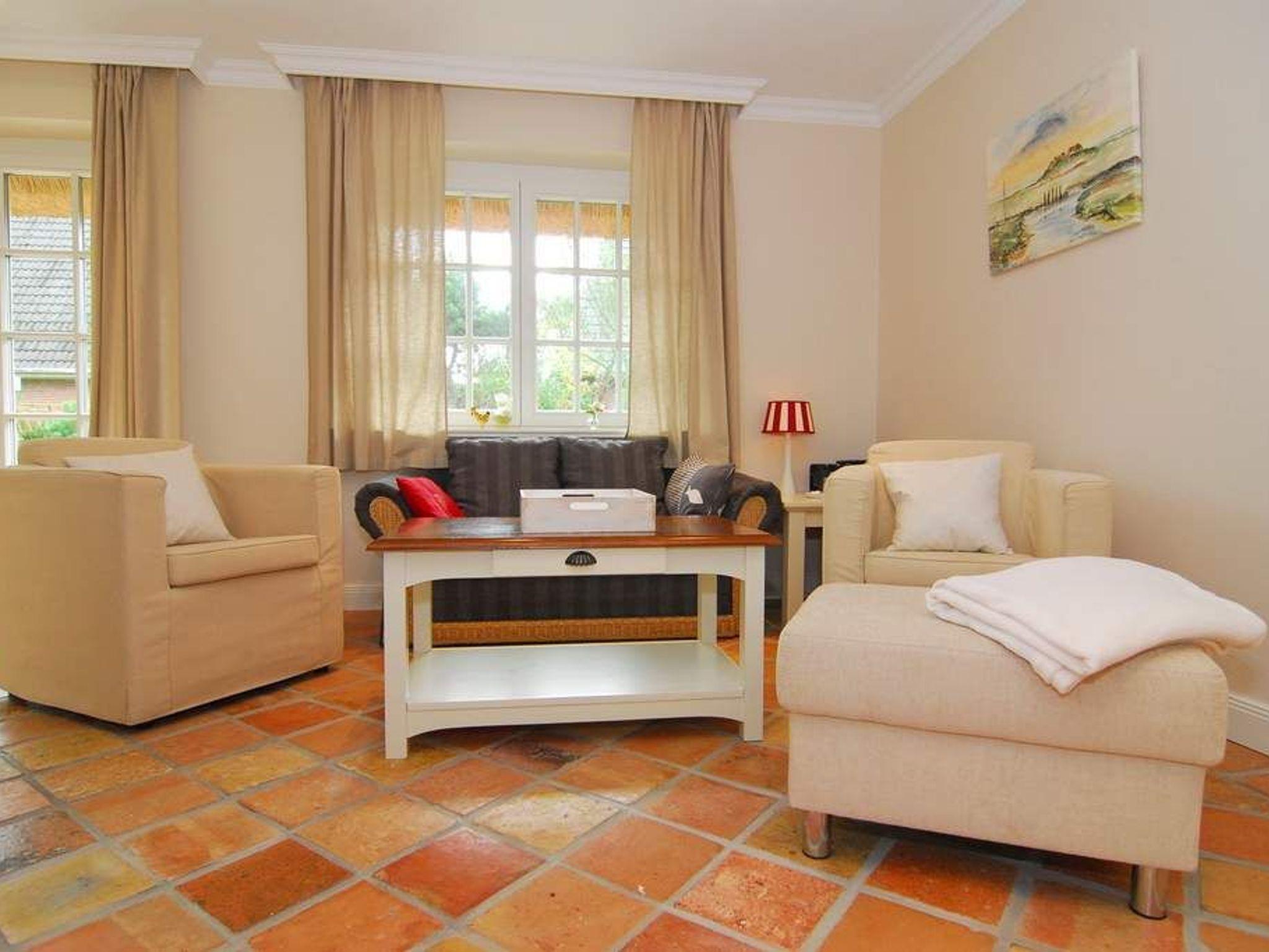 Schönes Ferienhaus / Doppelhaushälfte unter Reet auf sonnigem Südgrundstück. Ca. 113m². EG: gefliestes Wohn- und Esszimmer mit moderner Marken-Einbauküche (GS, Mikrowelle, etc.), schöner Essplatz am Fenster, Couchecke mit Doppelcouch, 2 Sesseln und Hocker, Kamin, WLan, Flat-Screen, Stereoanlage mit CD, Gäste-WC, HW-Raum mit WA/TR, Garderobe. OG: 1 Schlafzimmer mit Doppelbett, Flat-Screen und eigenem Duschbad/WC, 1 weiteres Schlafzimmer mit Doppelbett und Flatscreen sowie 1 Schlafzimmer mit 1,20x2m und Flat-Screen, 1 Vollbad/WC. Zusätzlicher Schrank-/Abstellraum im DG. Große Süd- und Ostterrasse mit Gartenmöbeln. Nichtraucher-Haus! Grillen verboten!!! Bettwäsche und Handtücher sind zur Anreise aufgezogen. Tierhaltung ist erlaubt, muss bitte angemeldet werden!