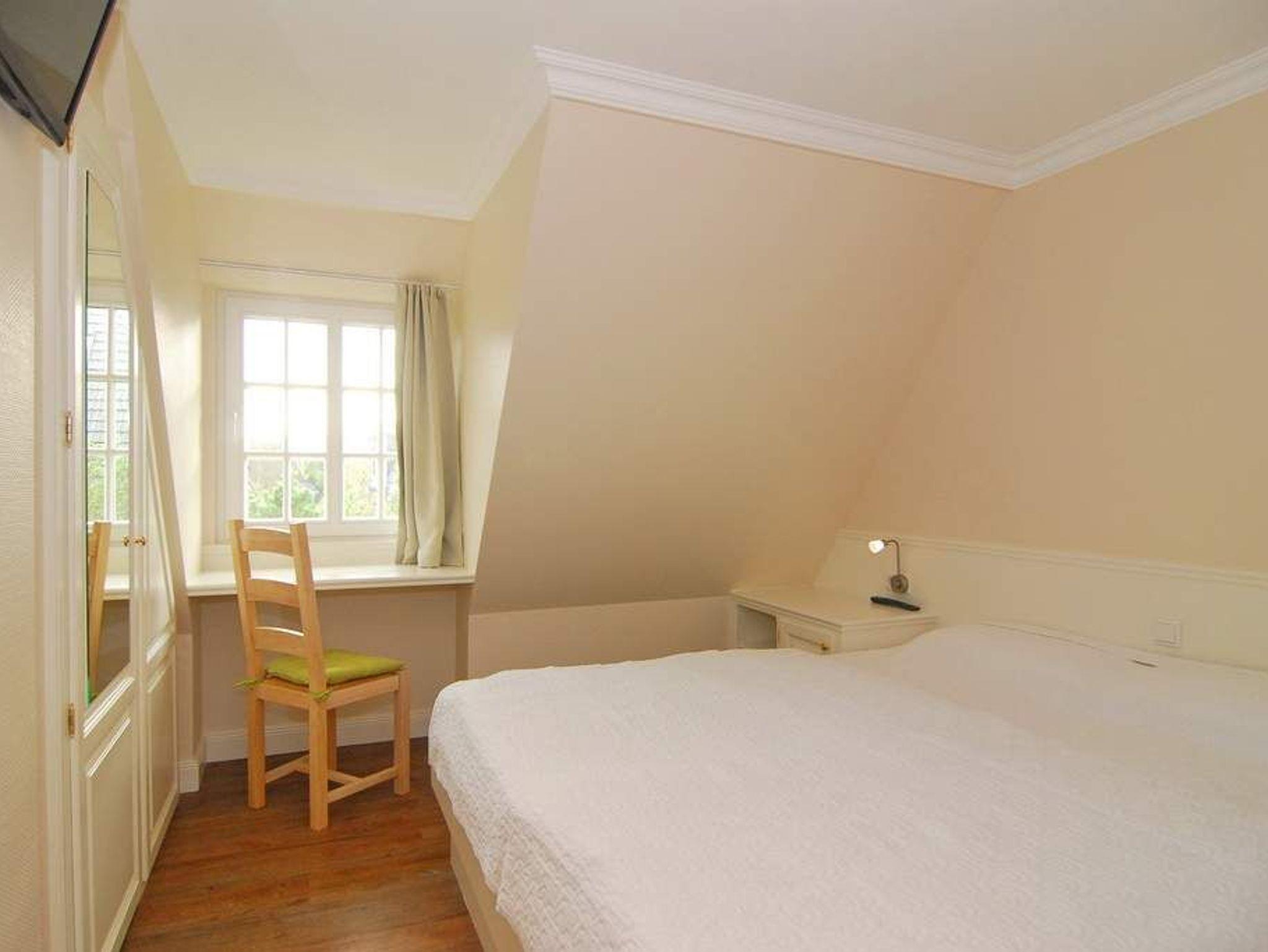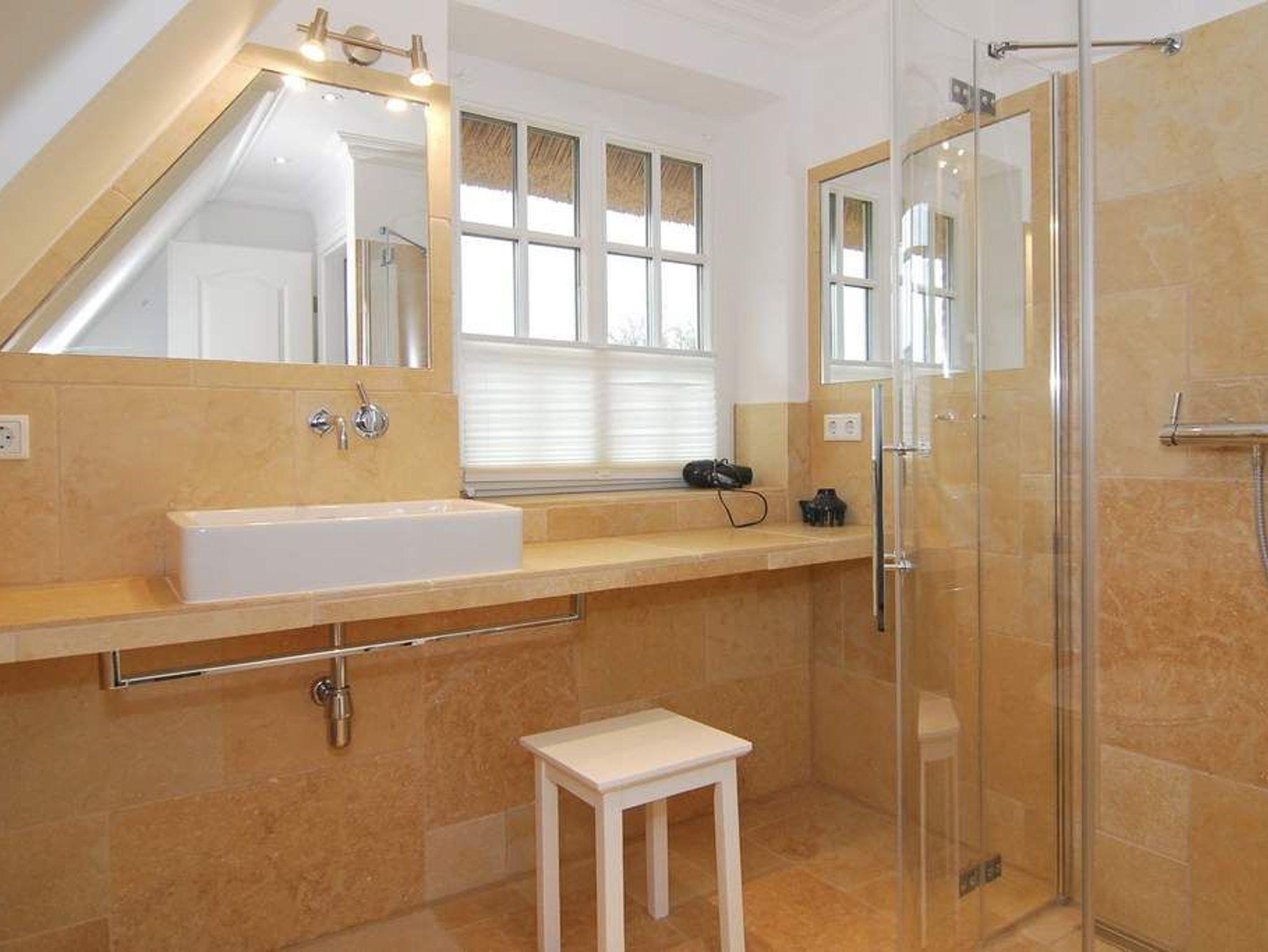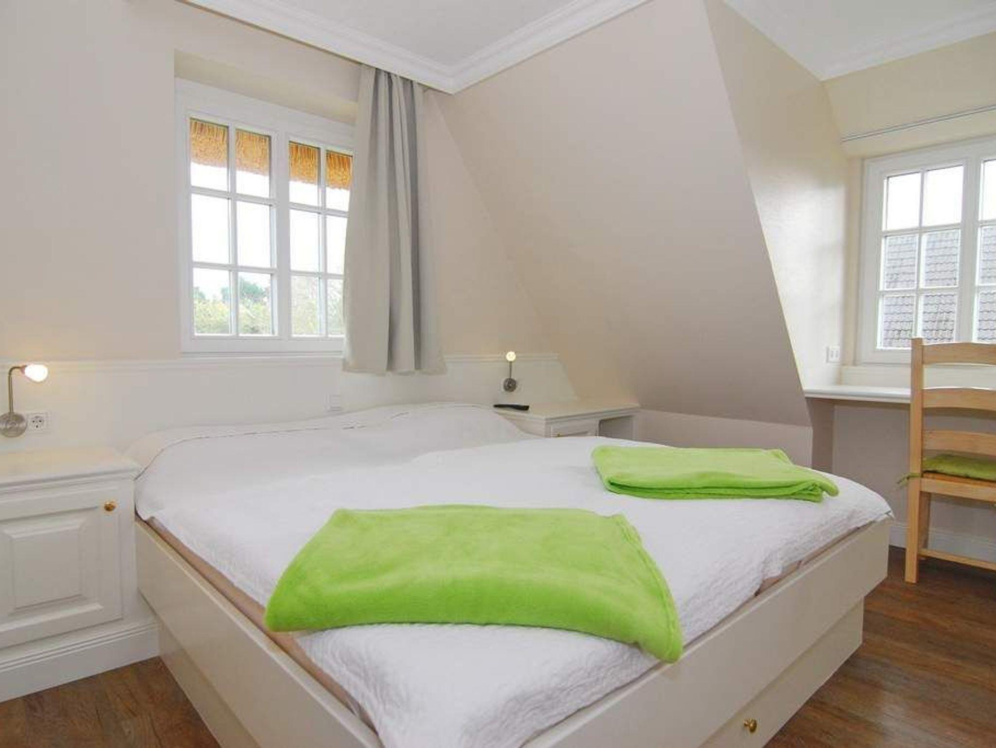 Schönes Ferienhaus / Doppelhaushälfte unter Reet auf sonnigem Südgrundstück. Ca. 113m². EG: gefliestes Wohn- und Esszimmer mit moderner Marken-Einbauküche (GS, Mikrowelle, etc.), schöner Essplatz am Fenster, Couchecke mit Doppelcouch, 2 Sesseln und Hocker, Kamin, WLan, Flat-Screen, Stereoanlage mit CD, Gäste-WC, HW-Raum mit WA/TR, Garderobe. OG: 1 Schlafzimmer mit Doppelbett, Flat-Screen und eigenem Duschbad/WC, 1 weiteres Schlafzimmer mit Doppelbett und Flatscreen sowie 1 Schlafzimmer mit 1,20x2m und Flat-Screen, 1 Vollbad/WC. Zusätzlicher Schrank-/Abstellraum im DG. Große Süd- und Ostterrasse mit Gartenmöbeln. Nichtraucher-Haus! Grillen verboten!!! Bettwäsche und Handtücher sind zur Anreise aufgezogen. Tierhaltung ist erlaubt, muss bitte angemeldet werden!