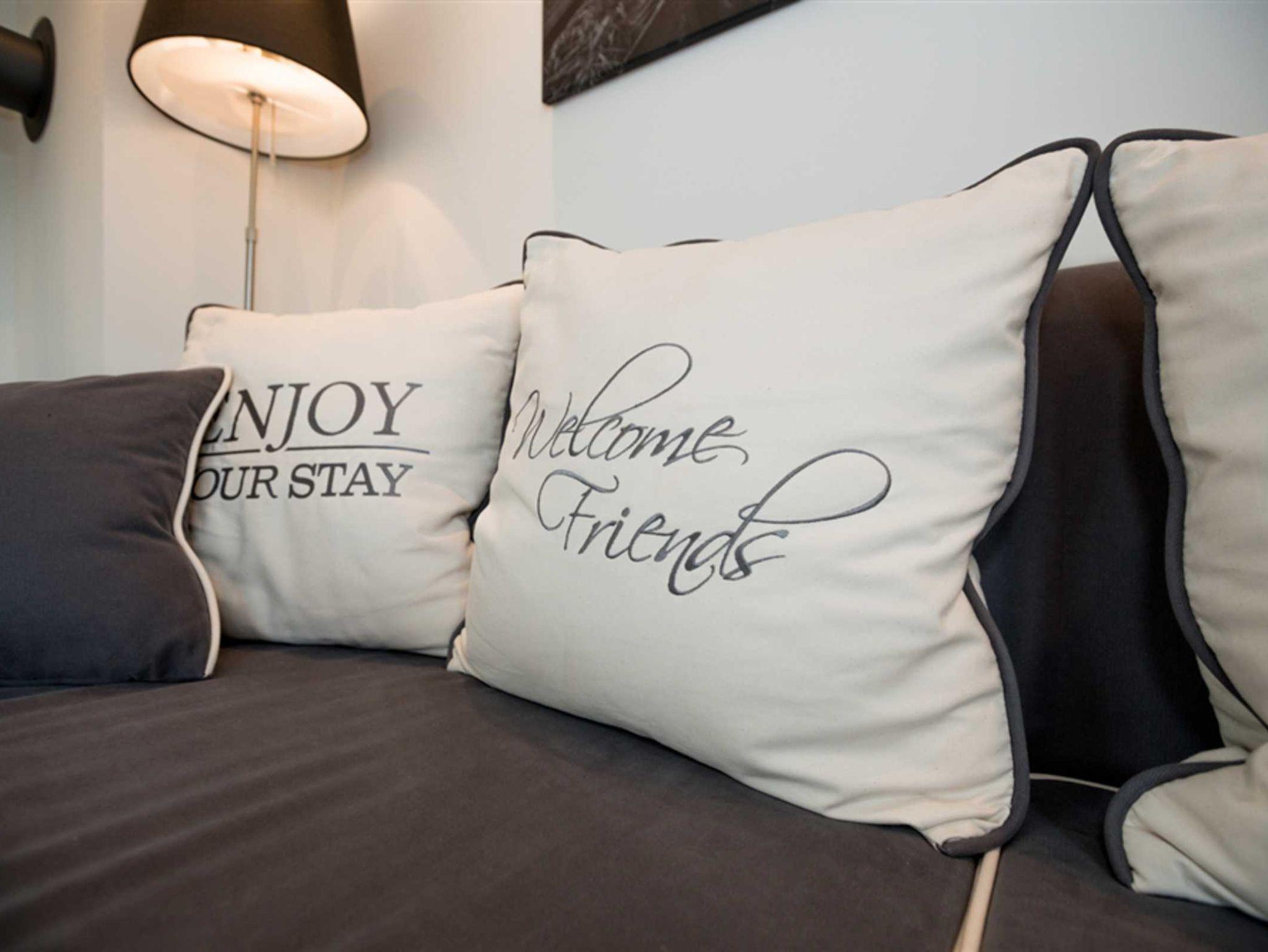 Im Erdgeschoss des Hauses finden Sie das wunderschön eingerichtete Wohn/Esszimmer mit der daran angrenzenden, komplett in weiß gehaltenen, voll ausgestatteten Küche. Das Wohnzimmer verfügt über ein großes Sofa und zwei Sessel - das Highlight hier ist natürlich der Kaminofen mit Sichtfenster, der Wohlfühlatmosphäre garantiert.
