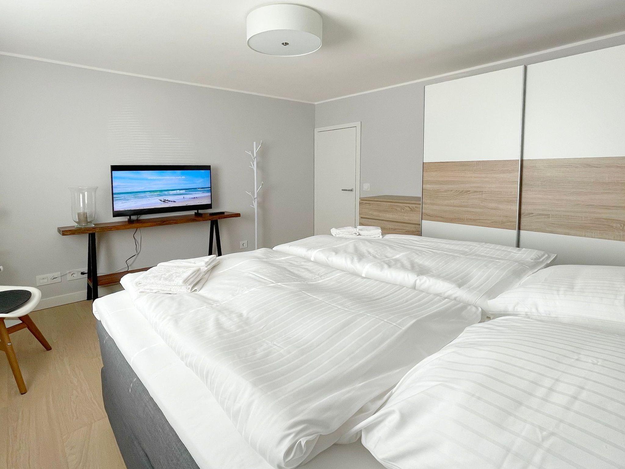 2 große Schlafzimmer mit Doppelbetten jeweils mit TV, 2 kleine Schlafzimmer für jeweils eine Person.