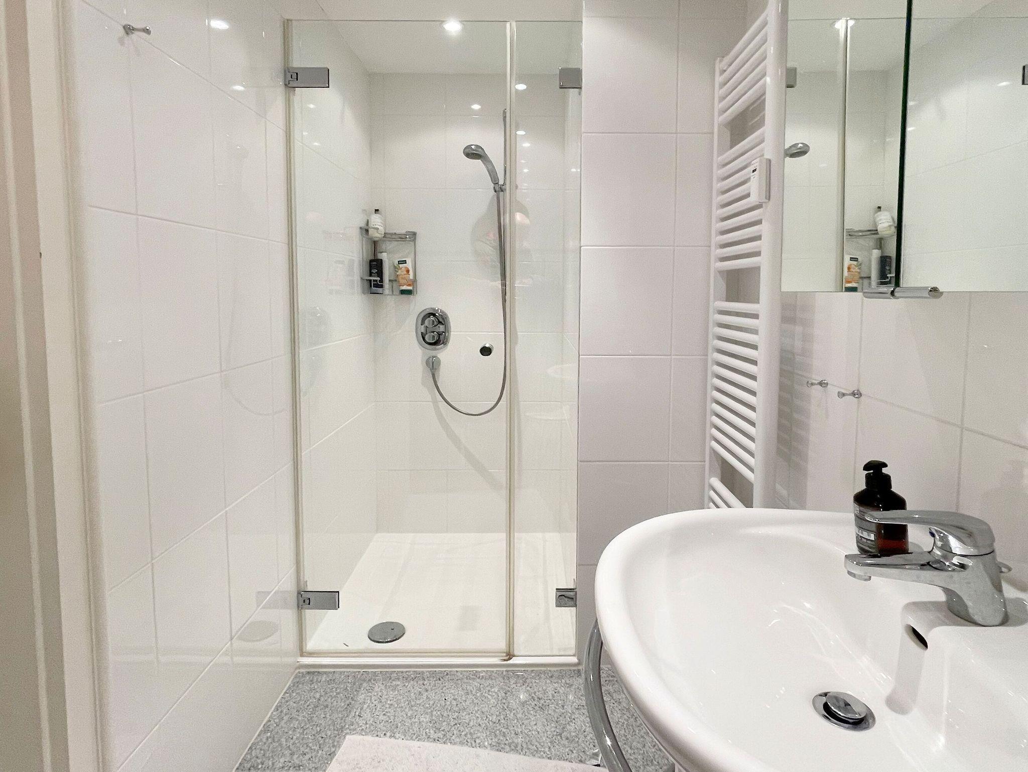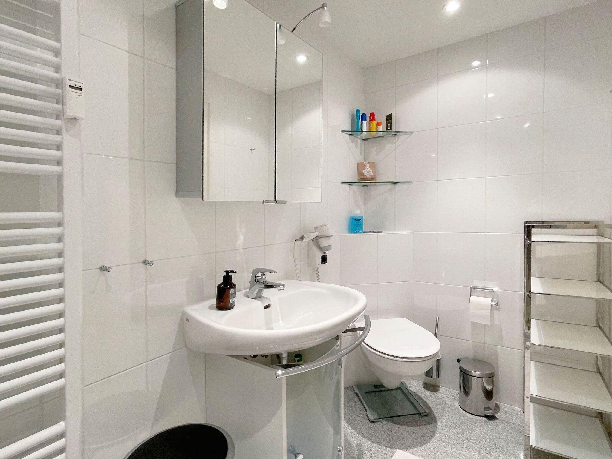 Schlafzimmer mit Doppelbett, Einbauschränken und eigenem TV. Moderne Küche mit Geschirrspüler, Mikrowelle mit Grillfunktion, Wasch-Trockenautomat-Kombigerät. Badezimmer mit Dusche ( begehbar ), Waschbecken, Fön und WC