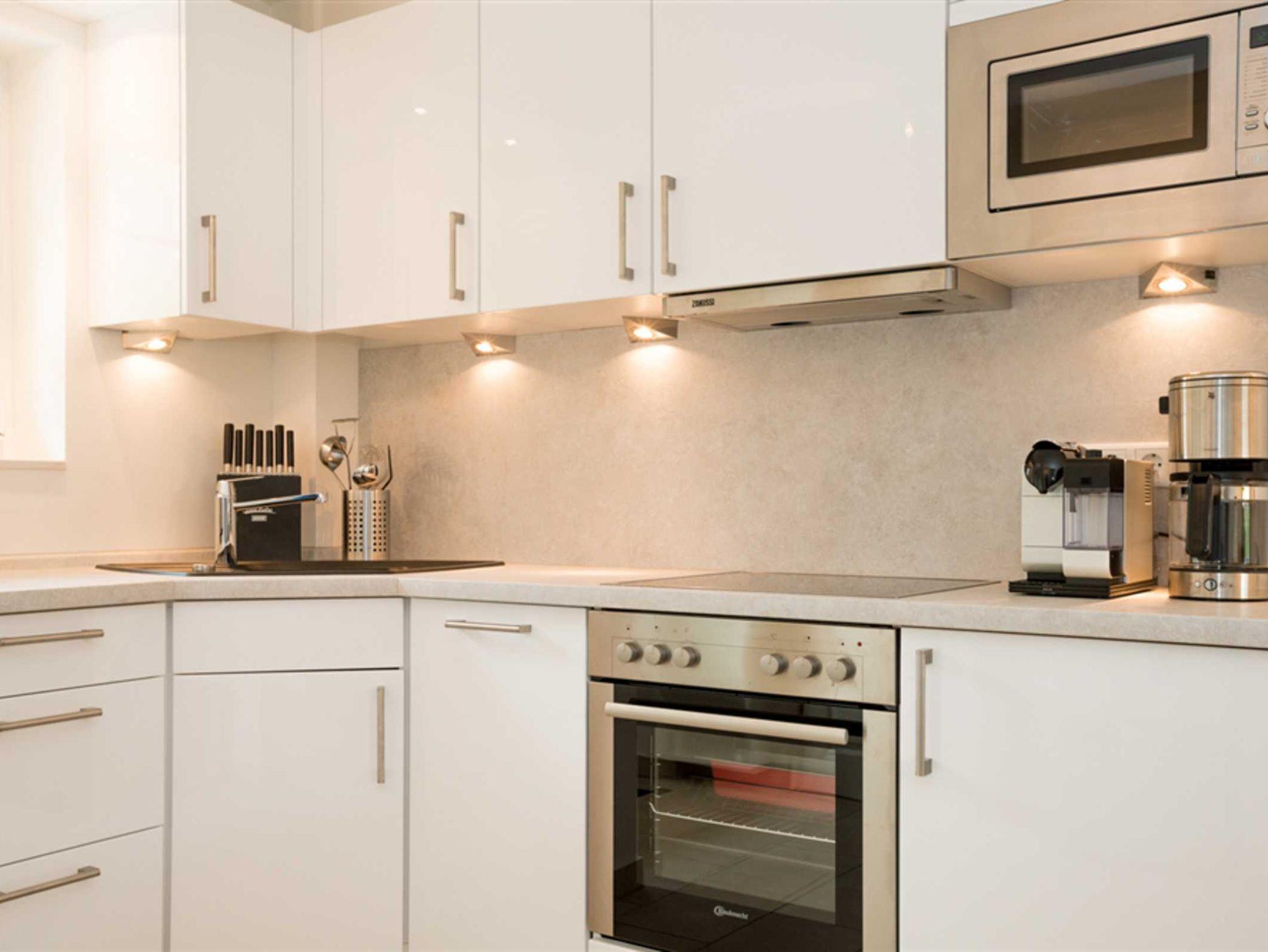 Im Erdgeschoss des Hauses finden Sie das wunderschön eingerichtete Wohn/Esszimmer mit der daran angrenzenden, komplett in weiß gehaltenen, voll ausgestatteten Küche. Das Wohnzimmer verfügt über ein großes Sofa und zwei Sessel - das Highlight hier ist natürlich der Kaminofen mit Sichtfenster, der Wohlfühlatmosphäre garantiert.