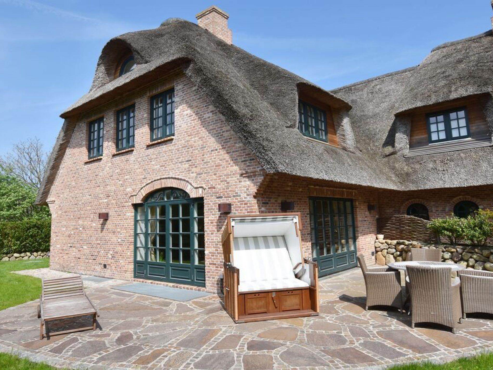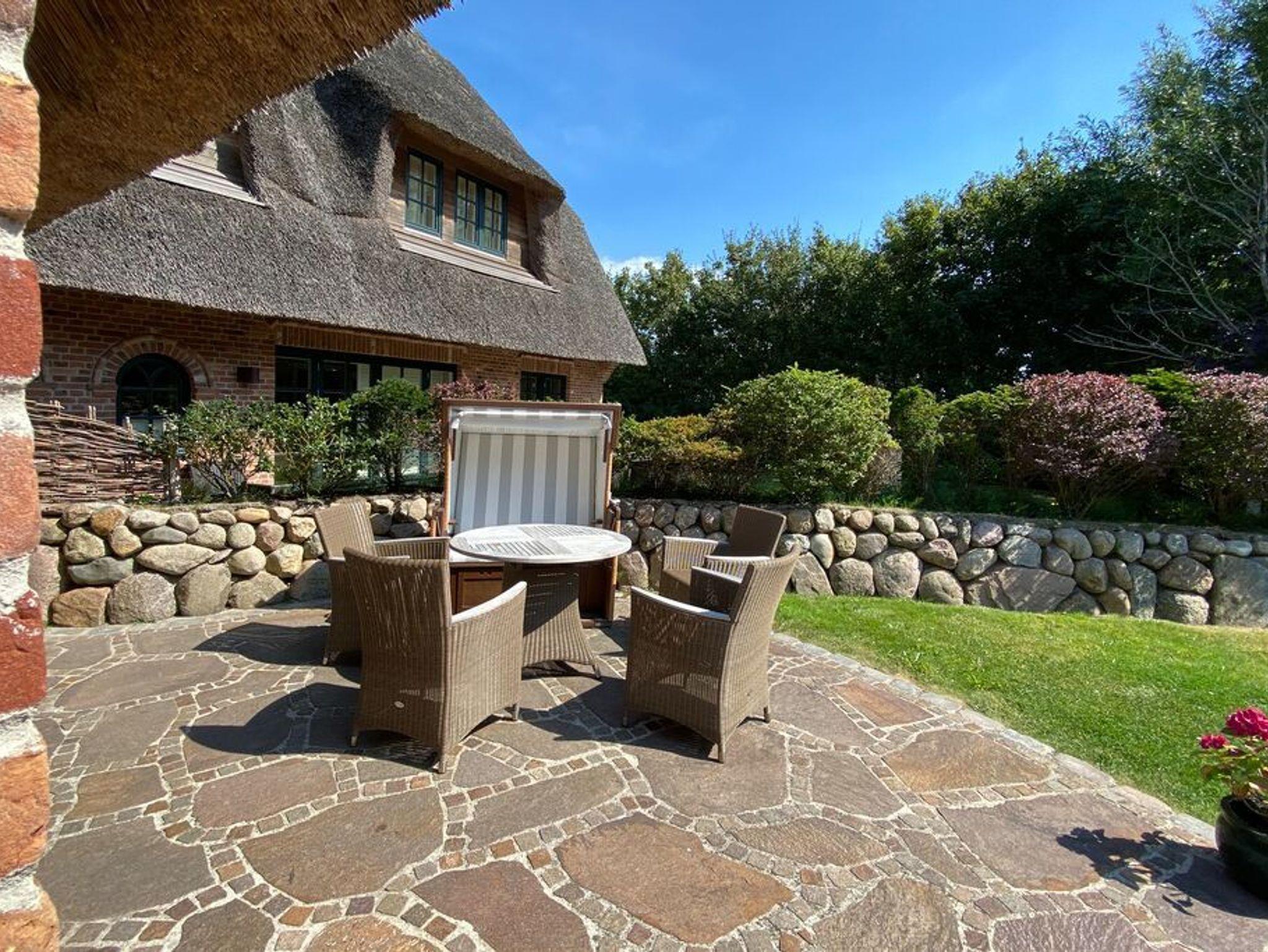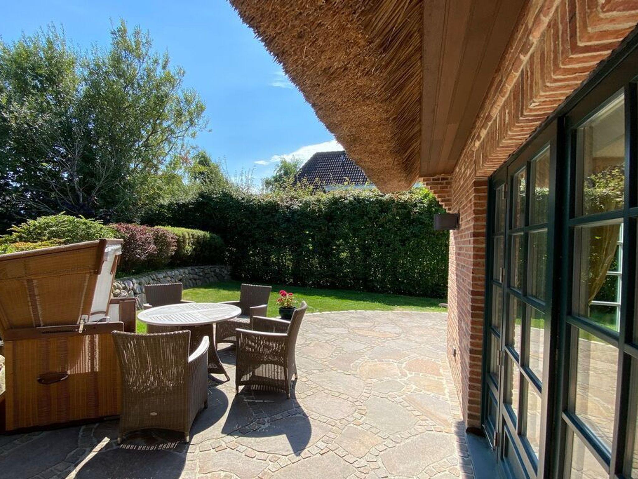 Exklusive Reetdach-Haushälfte in Tinnum auf Sylt mit Garten, Terrasse und privatem Strandkorb für erholsamen Urlaub.