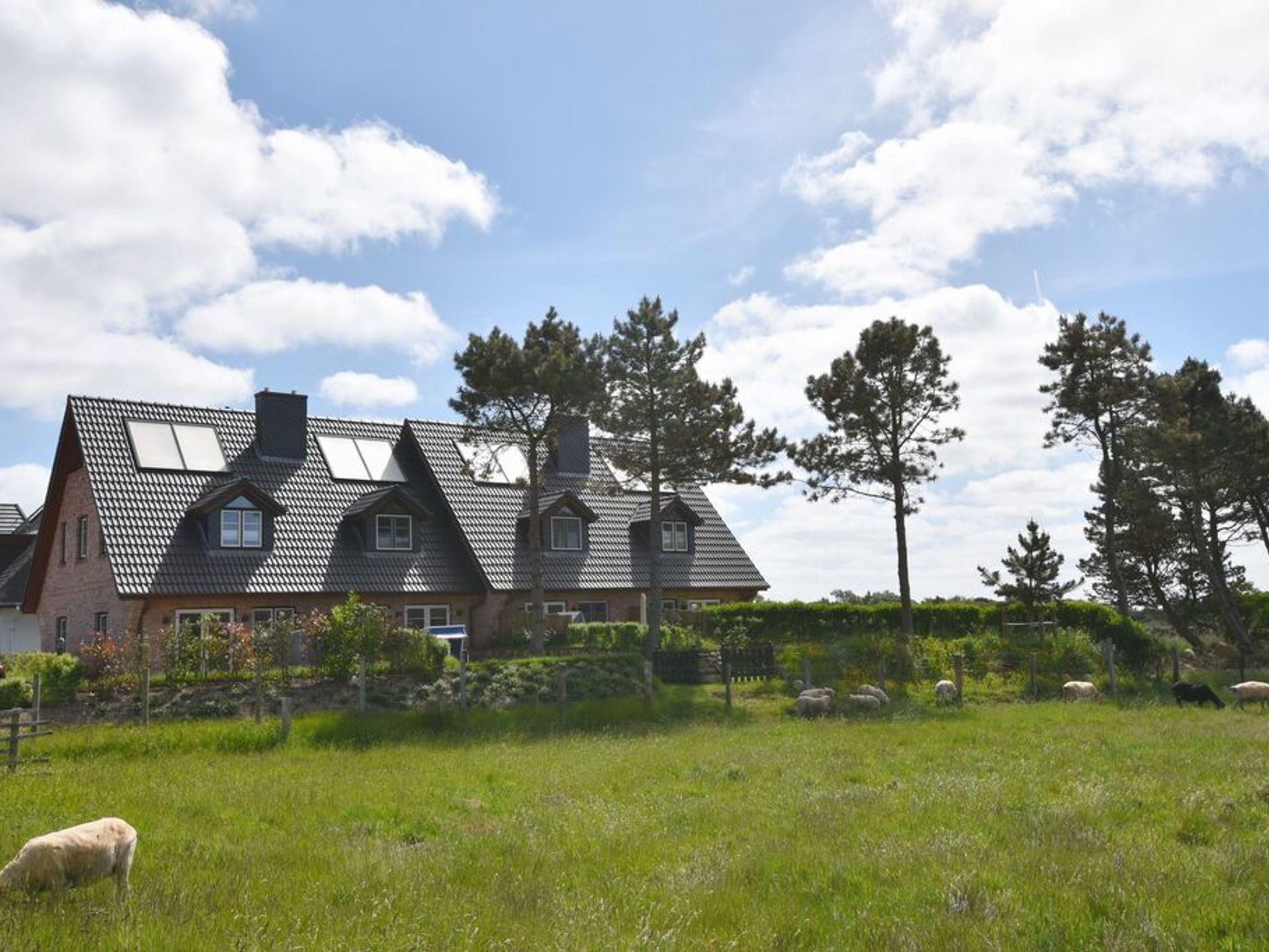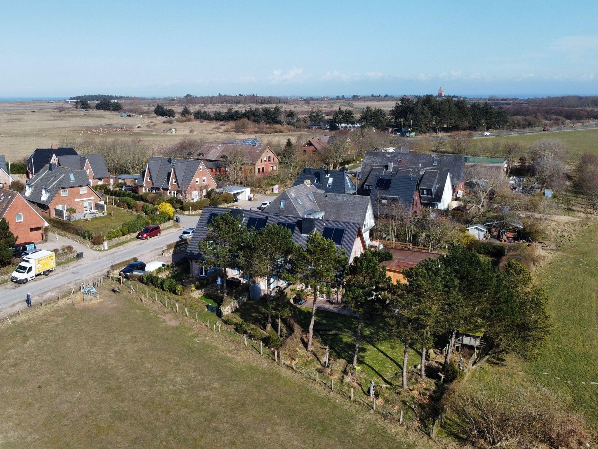 Modernes Ferienhaus mit Feldblick und exklusiver Ausstattung auf Sylt, ideal für Familien und Haustierbesitzer.