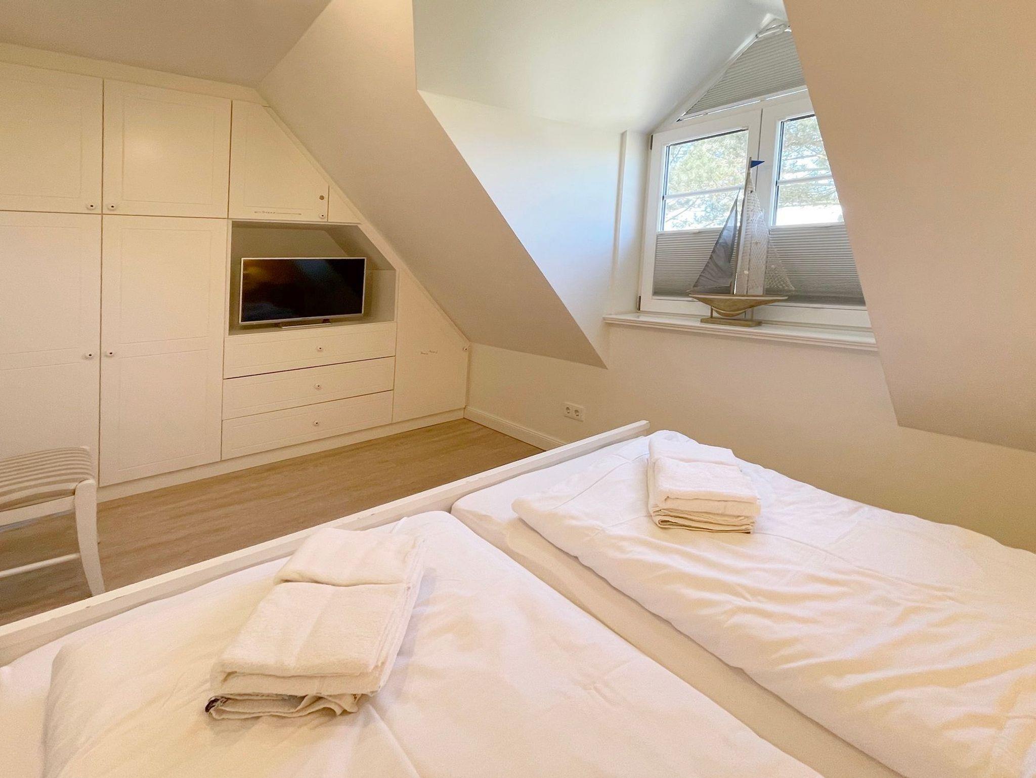 Im OG finden Sie 2 Schlafzimmer mit Doppelbetten und ein zweites Duschbad. Im Spitzboden befindet sich ein weiterer Raum mit einer zusätzlichen Schlafmöglichkeit.
