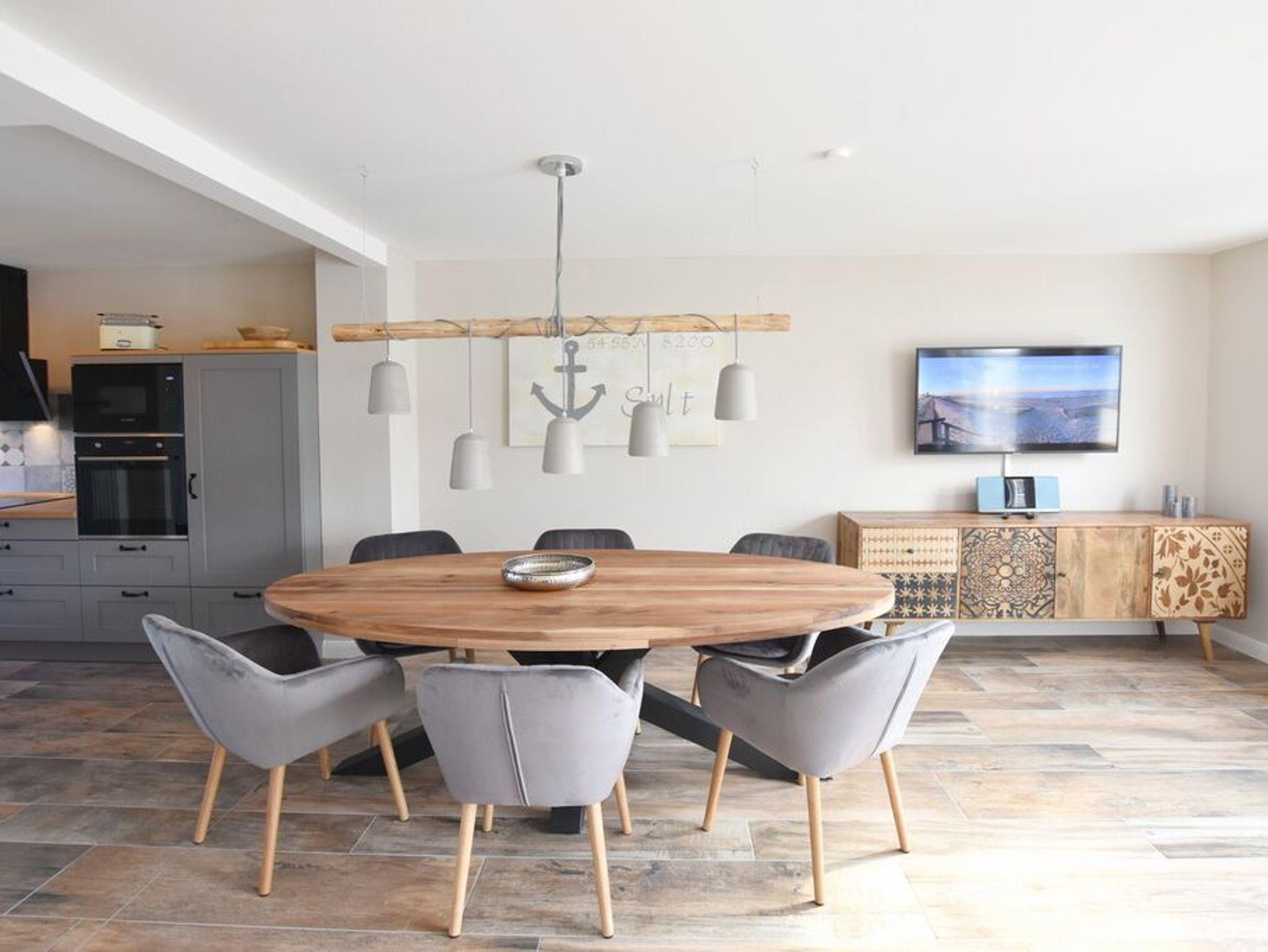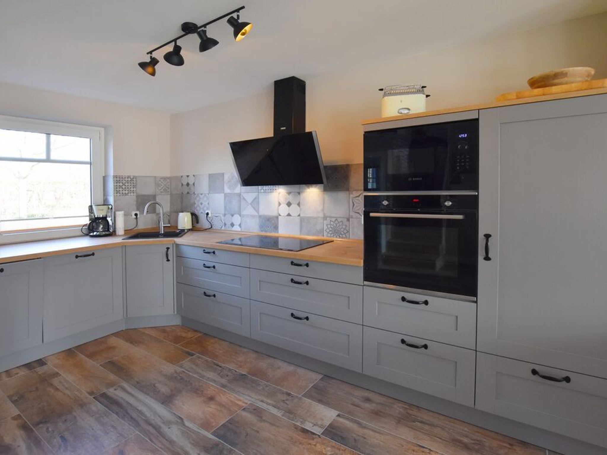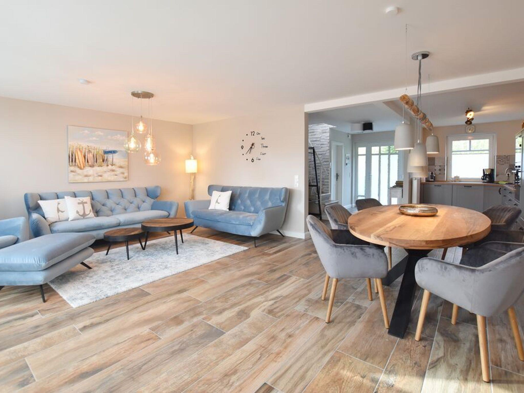 Im Wohnbereich wurden rustikale Holzfliesen verlegt, die das positive Gesamtbild des Ferienhauses abrunden. Die moderne Landhaus-Küche verfügt über ein großes 5 Platten, Induktionskochfeld, eine Microwelle, Geschirrspüler, Nespresso-Kapselmaschine und viele weitere Extras. Die Essecke, 2 Sofas, ein Schaukelsessel mit Fußhocker zum Relaxen und ein großes 50 Zoll Smart TV mit Kabel HD bieten bis zu 6 Personen genug Platz für einen erholsamen Urlaub im Ferienhaus Erika.[nbsp][nbsp]Ein modernes Duschbad ( Regendusche und Handbrause ) mit Fussbodenheizung, Waschbecken WC und ein kleiner Abstellraum gehören ebenfalls zur Ausstattung.