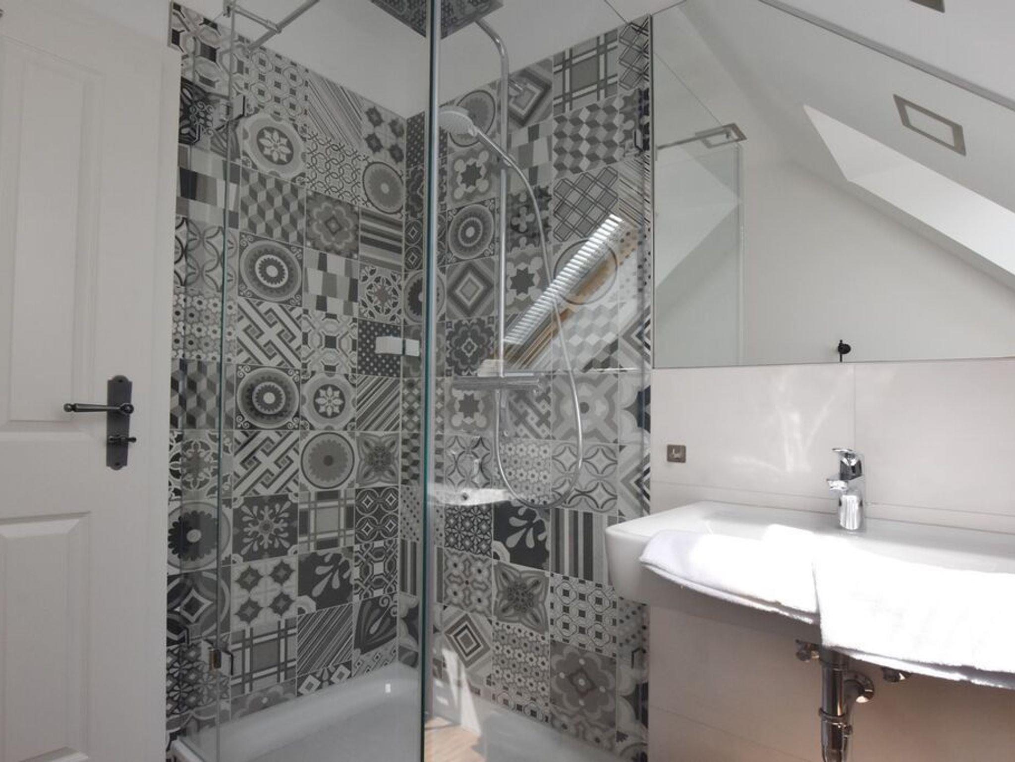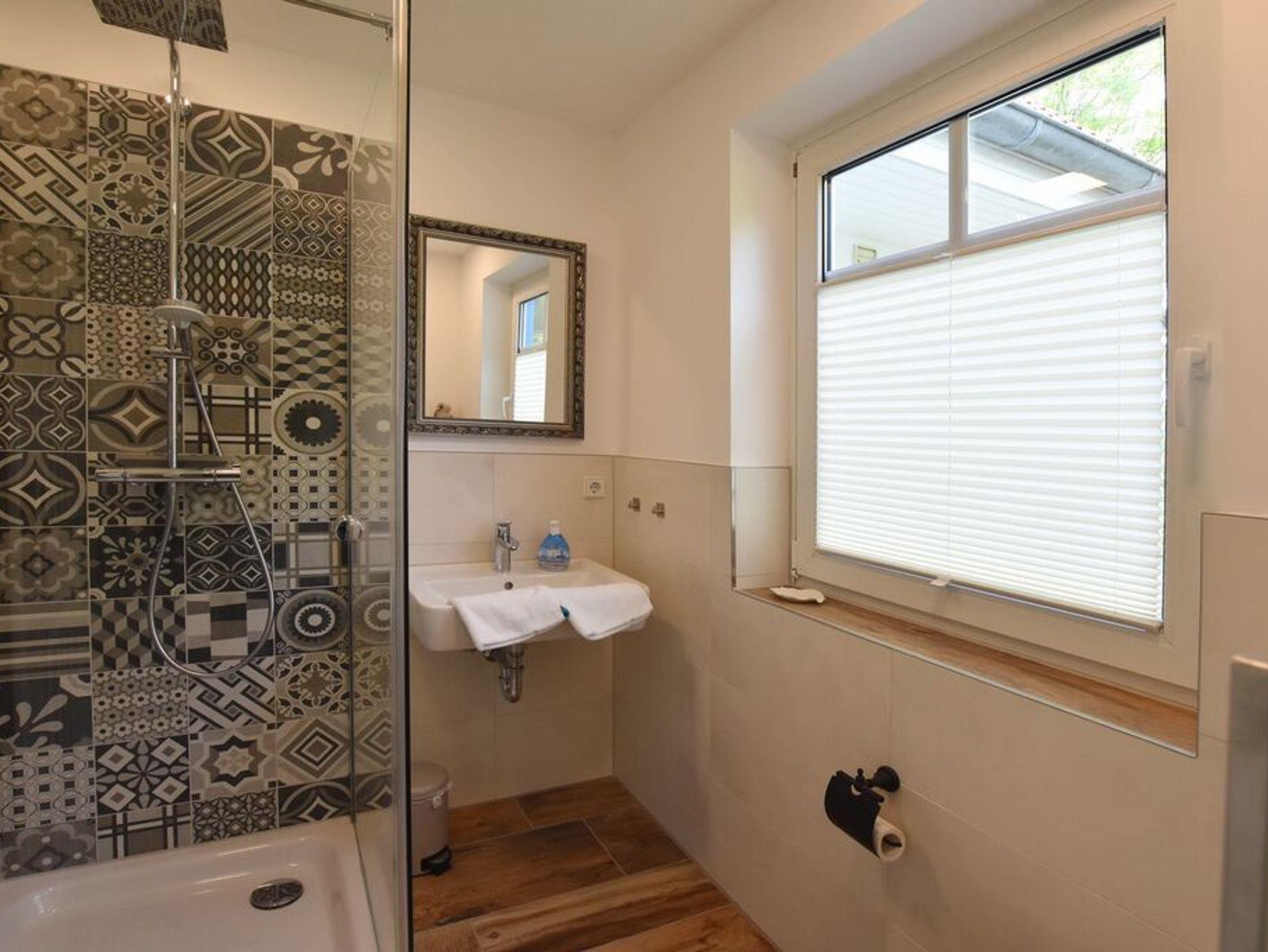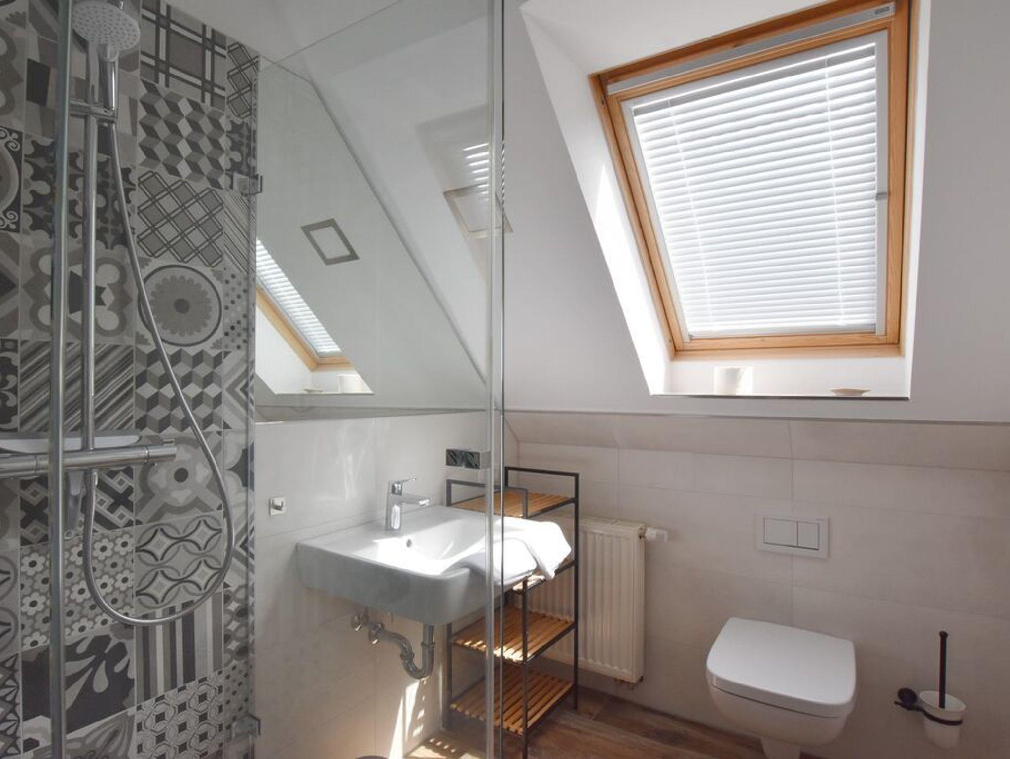 Zweites Badezimmer mit Regendusche und Handbrause , Waschbecken WC und kleiner Abstellraum.