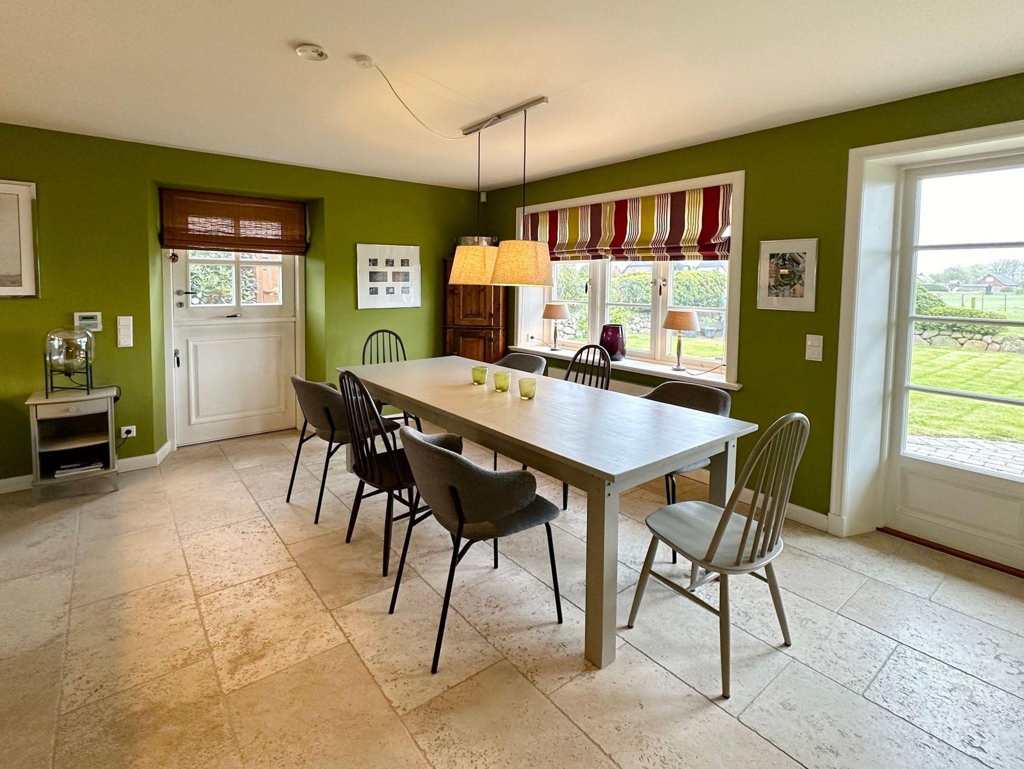 Es bietet Platz für bis zu 8 Personen und ist eine ideale Unterkunft für Ihren Urlaub in Tinnum. Das Haus verfügt über eine gemütliche Terrasse und einen Garten mit Blick auf Wiesen und Felder. Hier können Sie die Sonne und frische Luft genießen. An kühleren Tagen lädt der Kamin im Wohnzimmer zum Entspannen ein. Für Ihren Komfort stehen außerdem eine Waschmaschine und ein WLAN-Anschluss zur Verfügung.