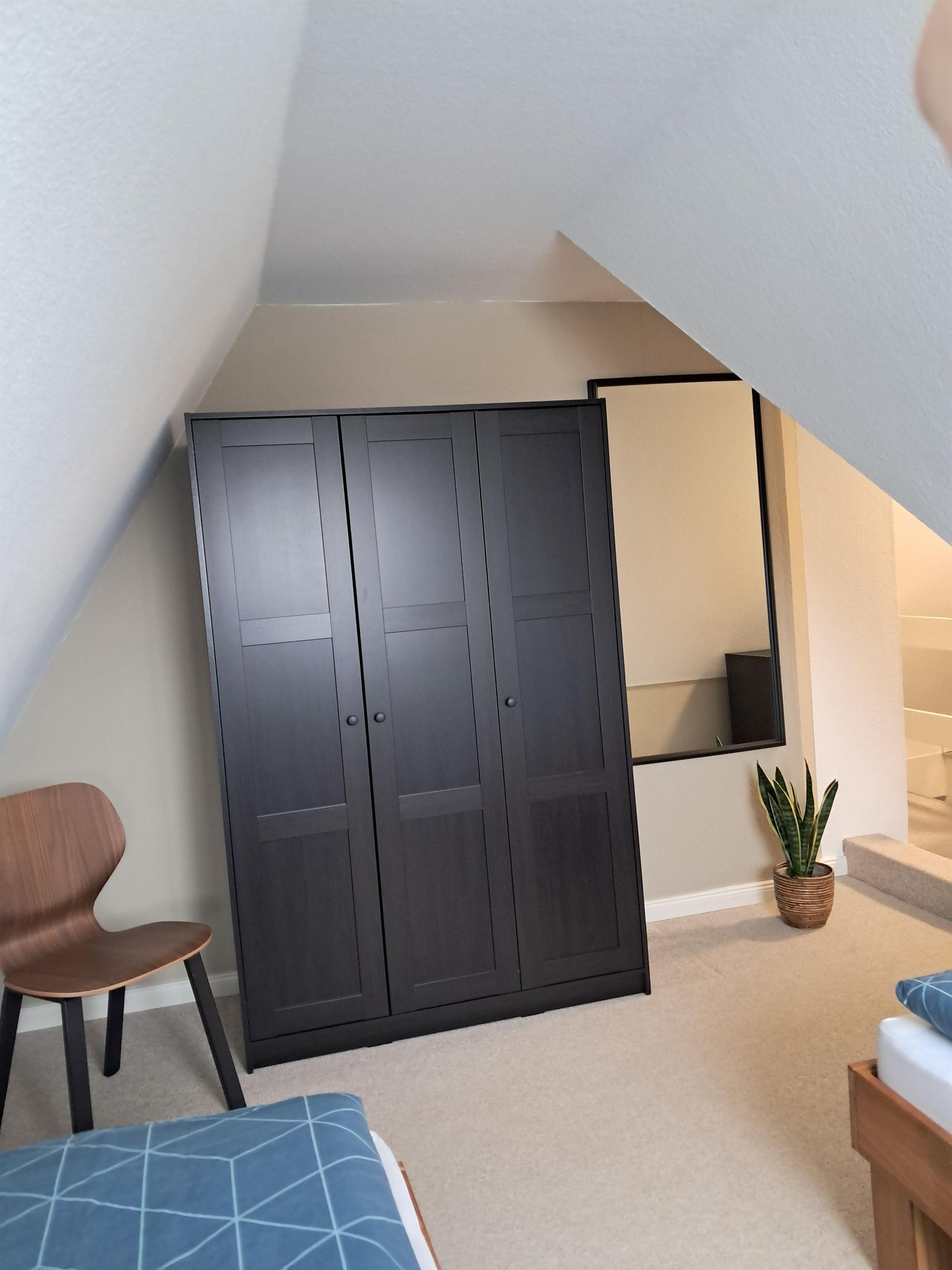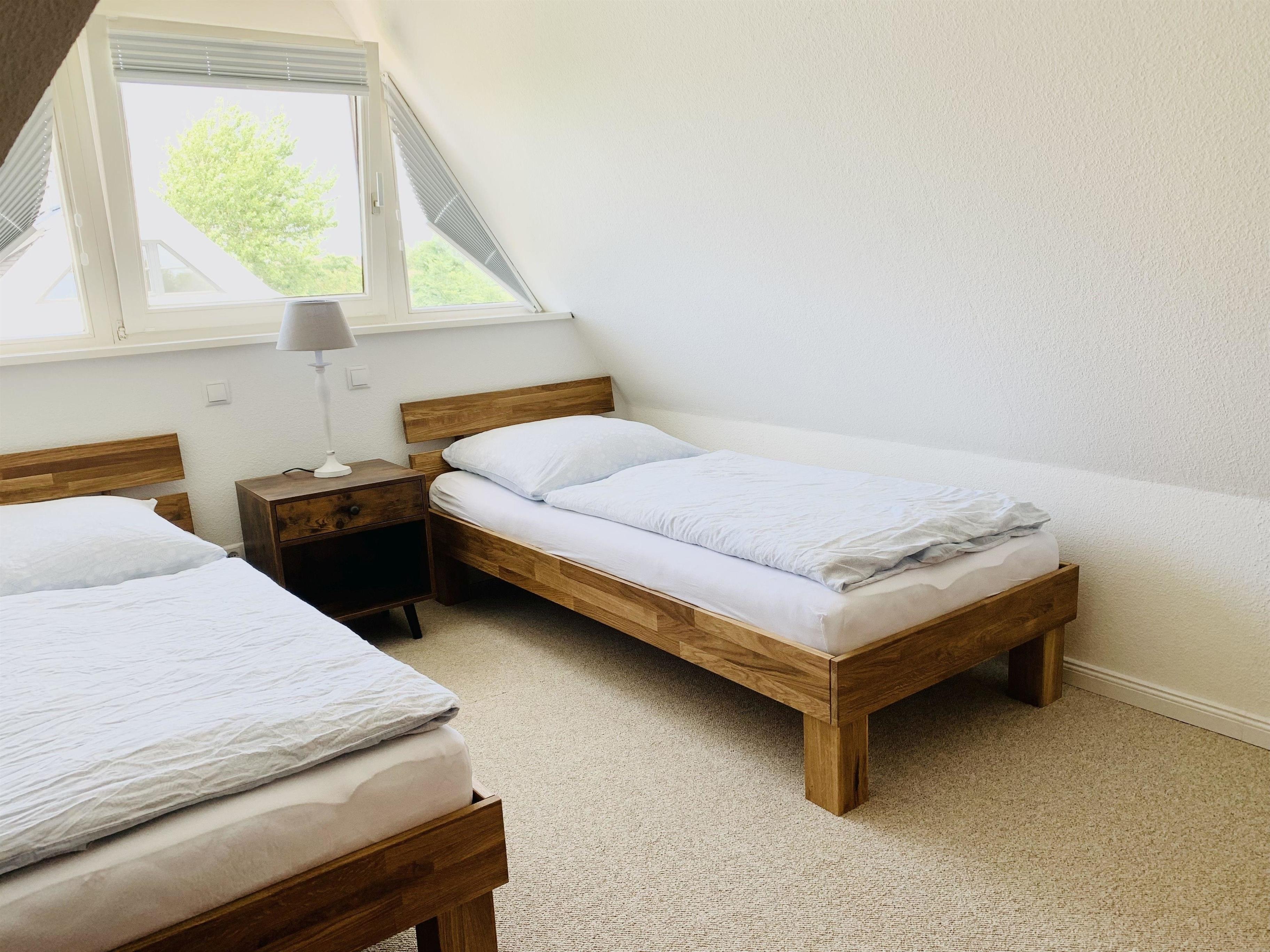 Die Betten im großen Schlafraum dürfen gerne zusammengestellt werden. Die Betten im kleinen Schlafraum sind Kojenbetten. Die Größe beträgt 200cm x 90cm. Durch die Schrägen ist die Beweglichkeit in die Höhe jedoch eingeschränkt.