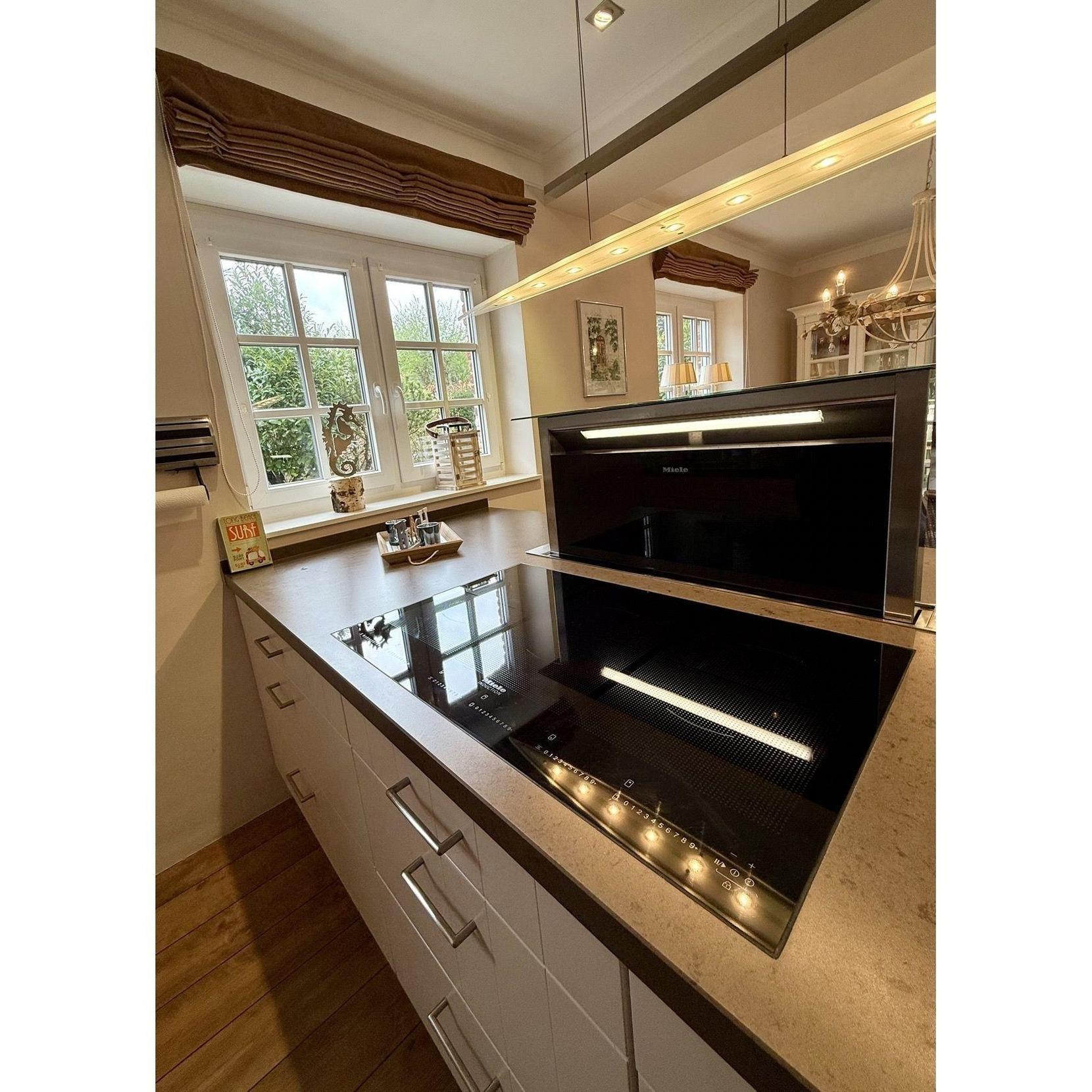 Ein modernes Badezimmer mit Dusche sorgt für Komfort, während das Herzstück dieser Etage das großzügige Wohn- und Esszimmer ist. Dieser Raum ist offen gestaltet und bietet eine behagliche Atmosphäre, die durch die angrenzende, hochwertig ausgestattete Küche der Marke Miele unterstützt wird. Hier können Sie kulinarische Genüsse zaubern und Ihre Zeit in vollen Zügen genießen.