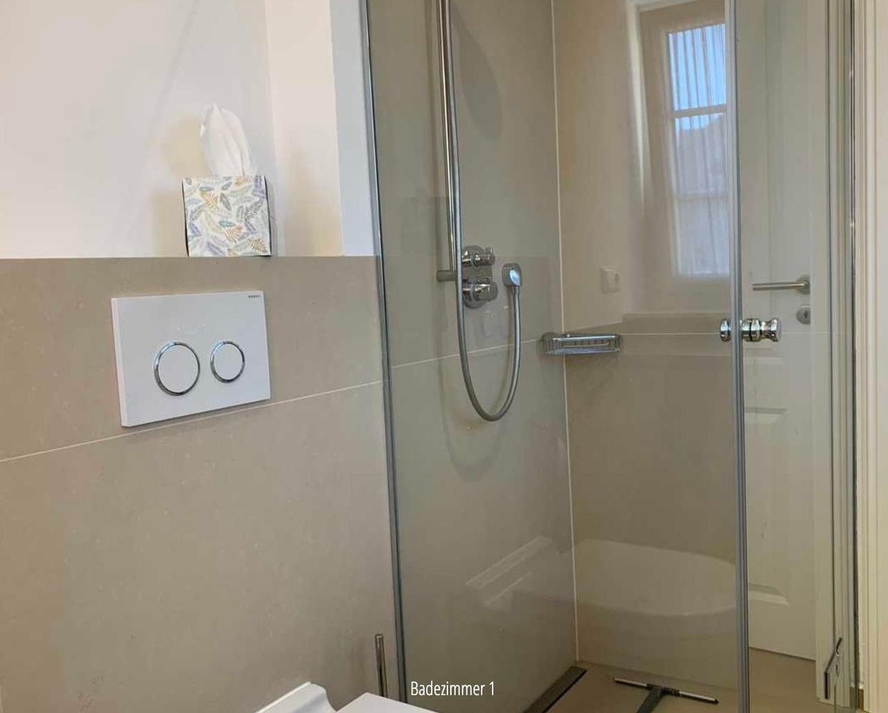 Ein weiteres Badezimmer mit Dusche rundet das Obergeschoss ab und ist zusätzlich mit einer Waschmaschine und einem Trockner der Marke Miele ausgestattet, die Ihnen den Alltag erleichtern.