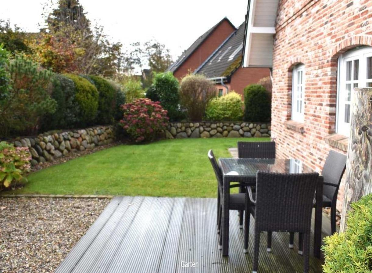Das Haus liegt auf einem liebevoll eingefriedeten Grundstück mit einem gemütlichen, von einem Friesenwall umgebenen und uneinsehbaren Garten. Zwei großzügige Terrassen laden dazu ein, die frische Nordseeluft zu genießen, sei es in bequemen Sitzgruppen oder im bereitstehenden Strandkorb.