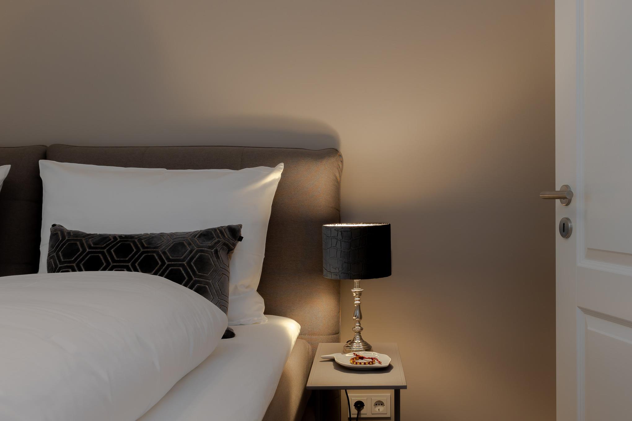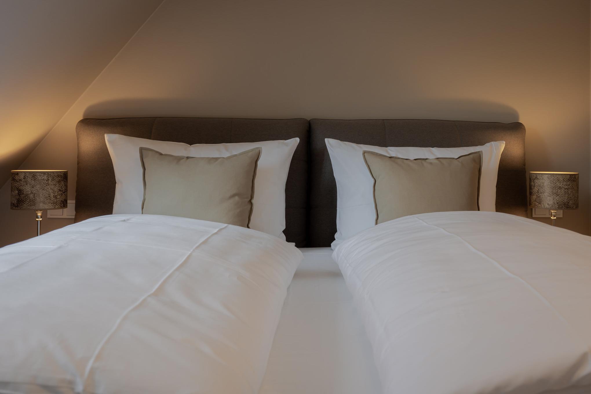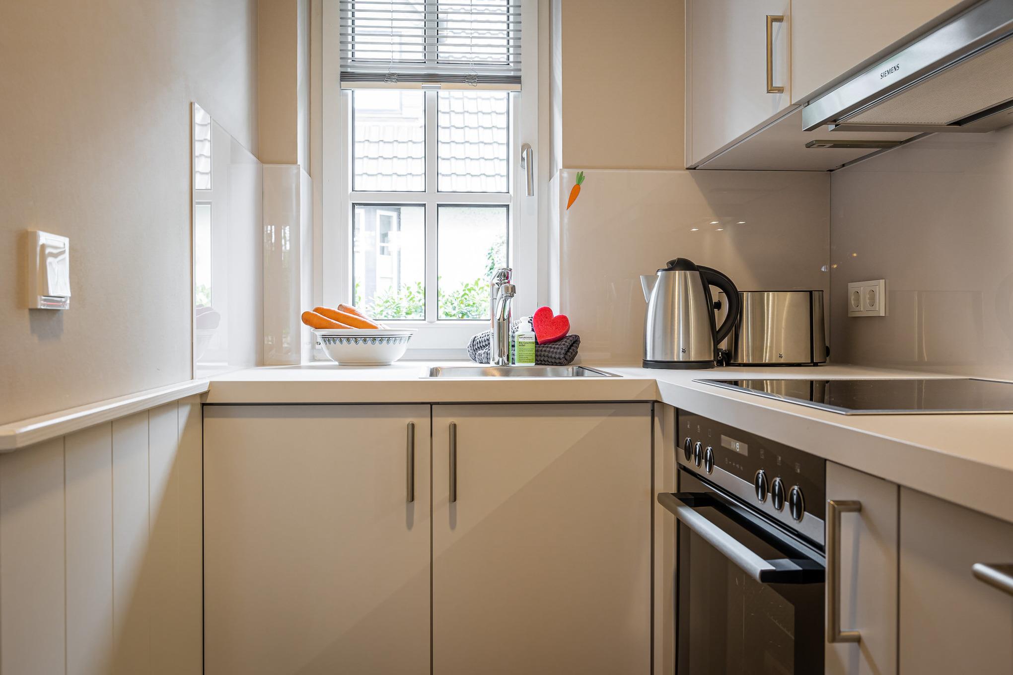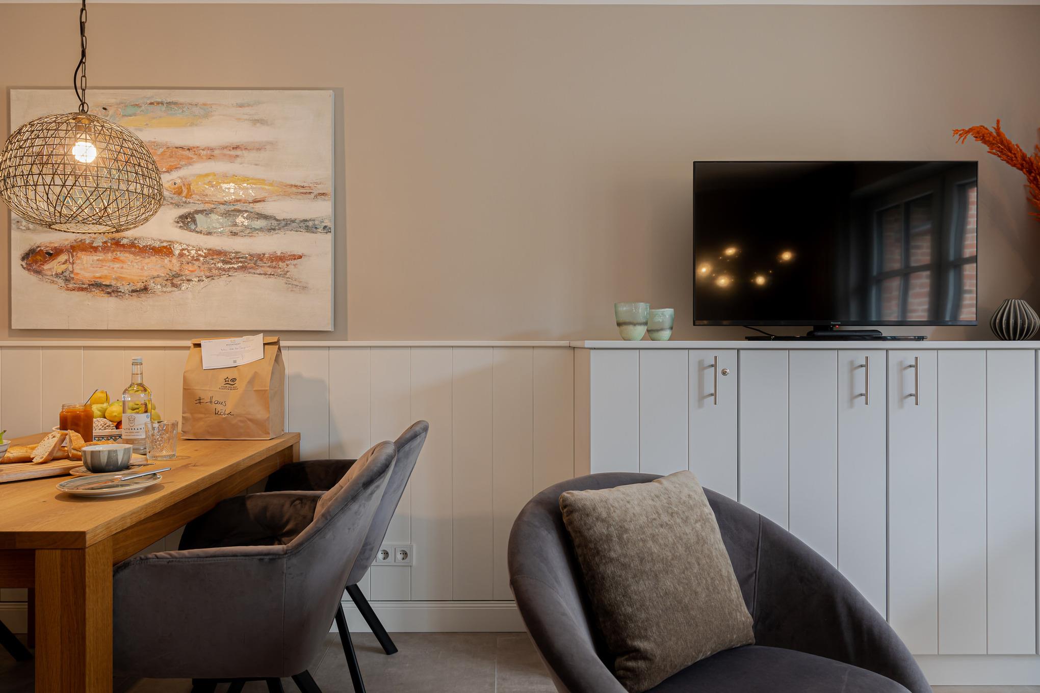 Zwei Schlafzimmer sind jeweils mit komfortablen Boxspringbetten und maßgefertigten Einbauschränken ausgestattet. Im großzügigen Wohn- und Essbereich befindet sich ein vollwertiges Schlafsofa für zwei weitere Gäste sowie eine moderne, hochwertig ausgestattete Küche mit Markengeräten (u. a. Miele) und allem, was man auch von zuhause kennt.