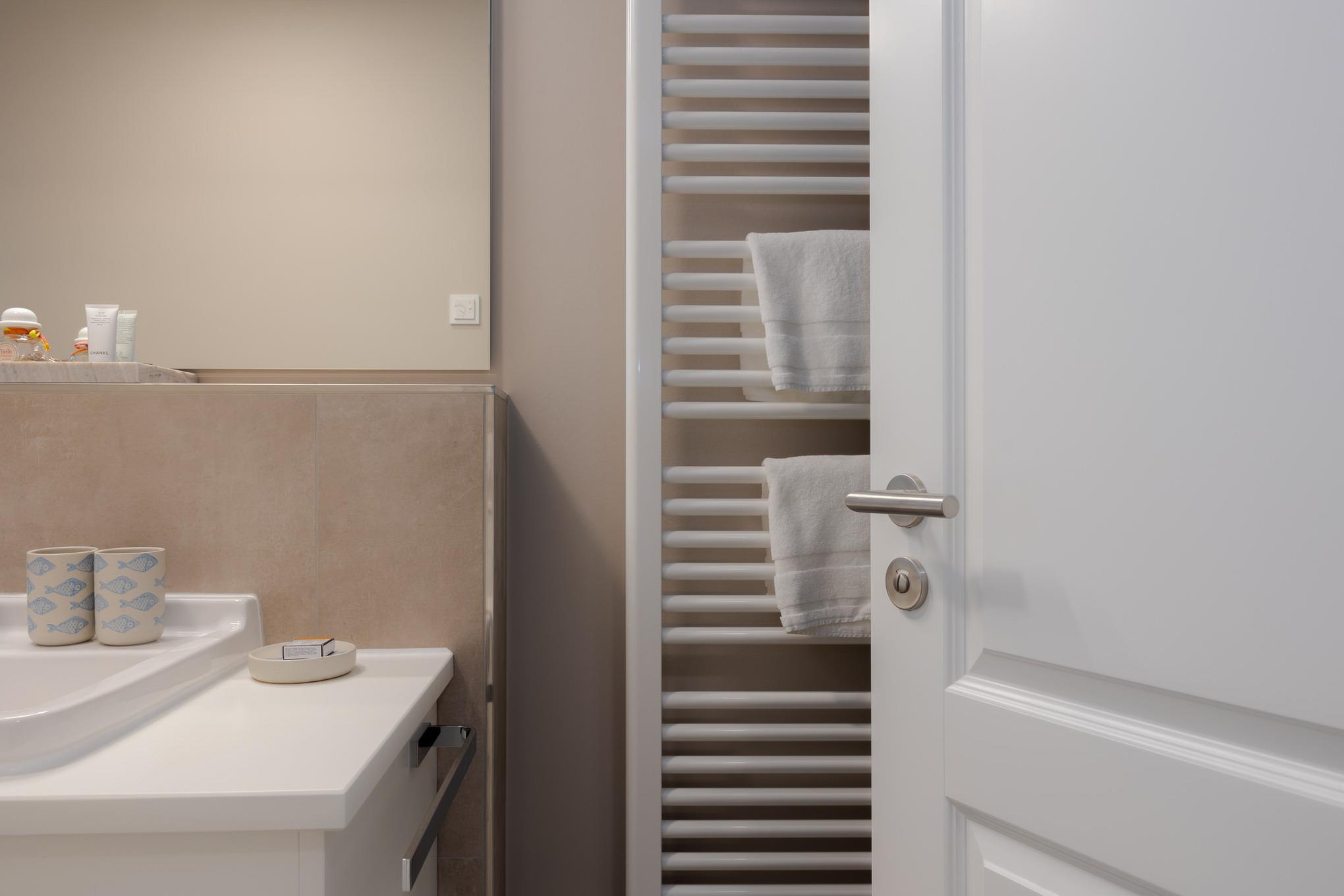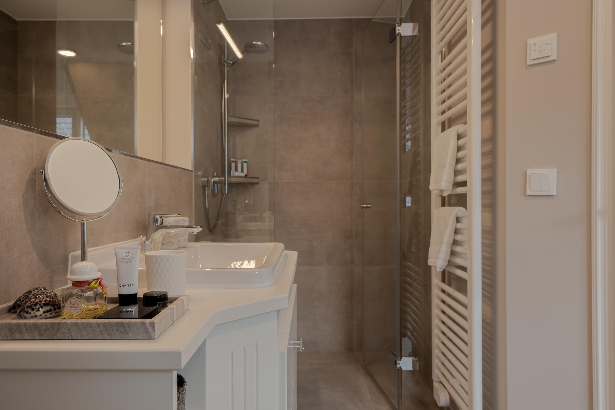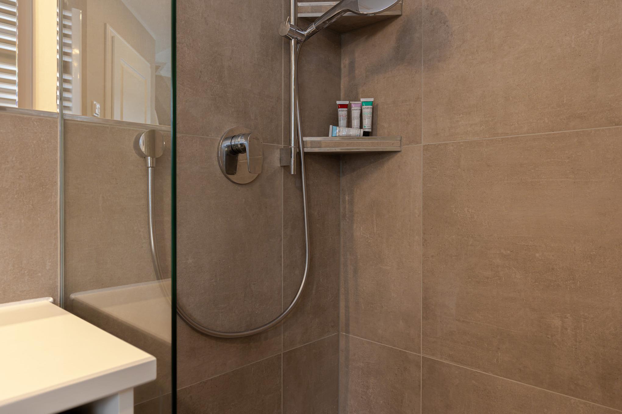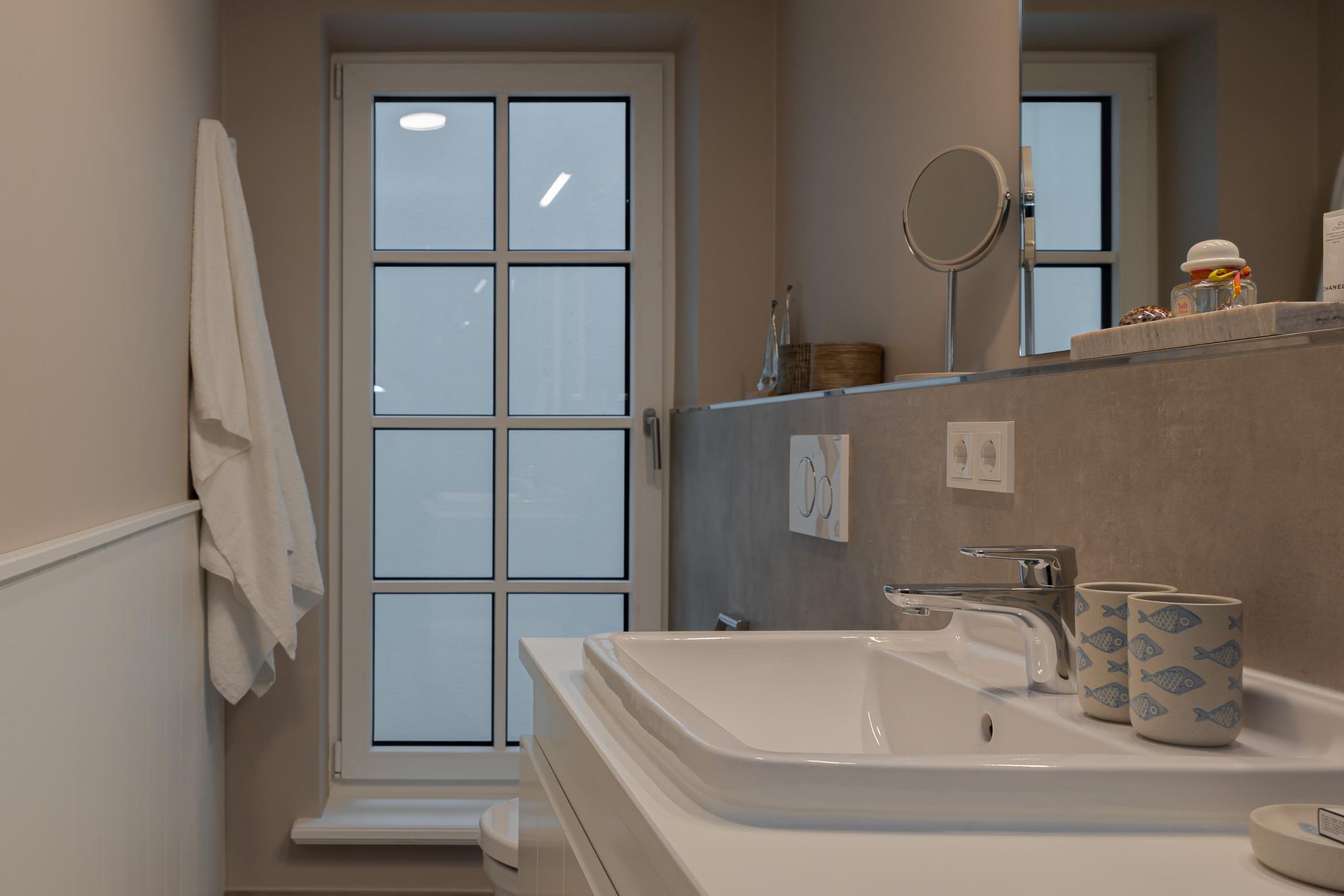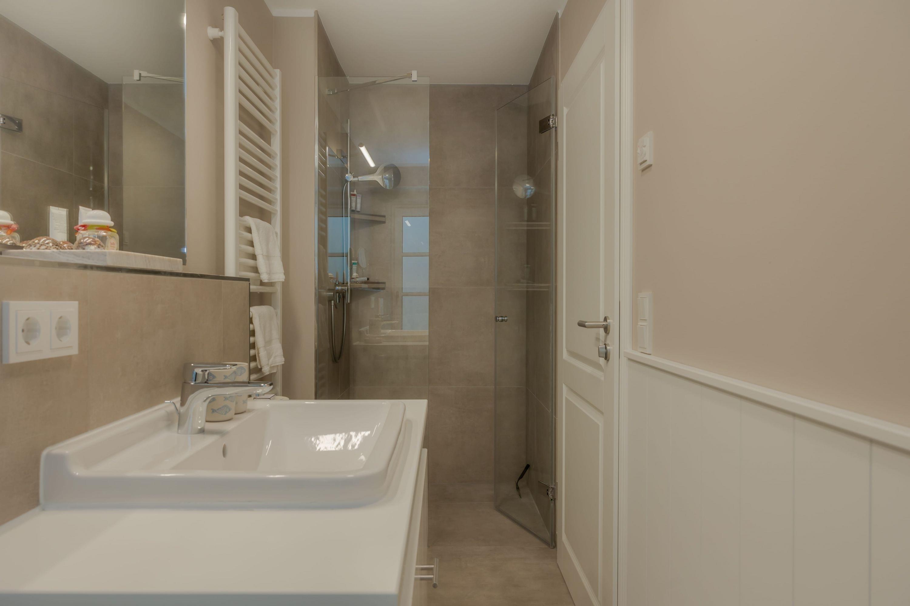 Das Badezimmer überzeugt mit maritimem Farbkonzept, Regendusche und Fußbodenheizung – Ihre private kleine Wellness-Oase, auch an kühleren Tagen.