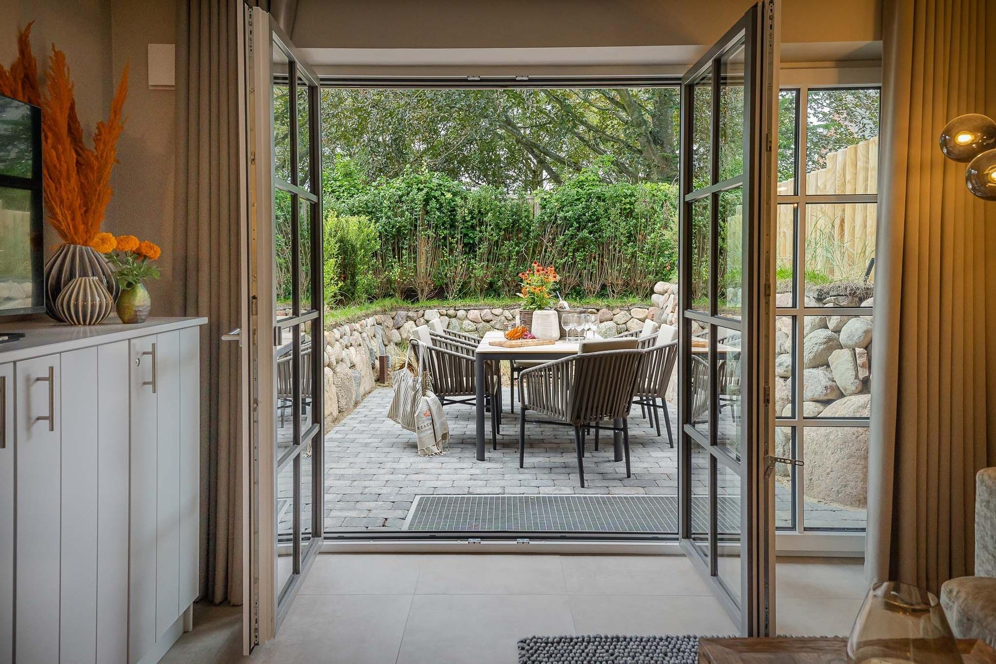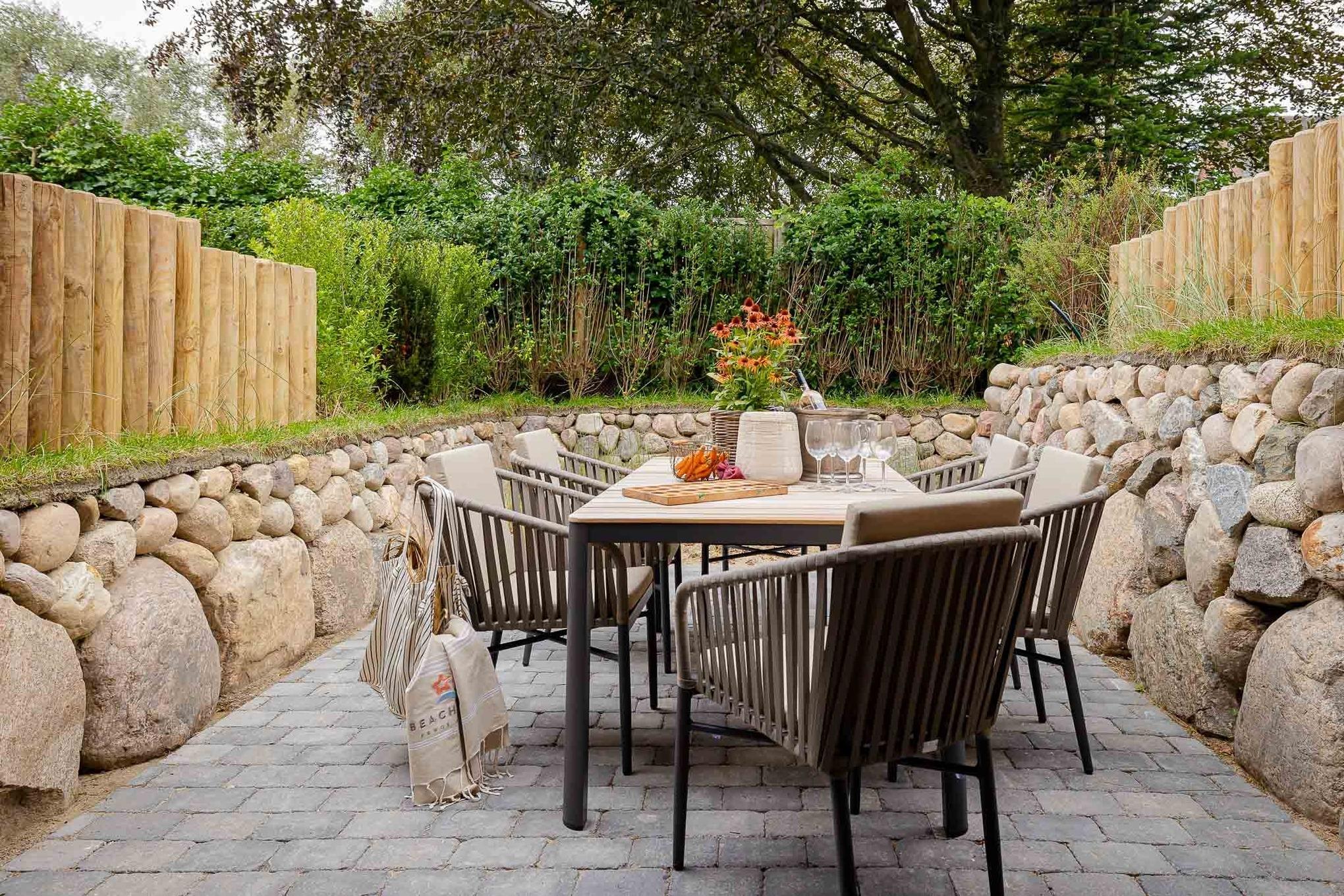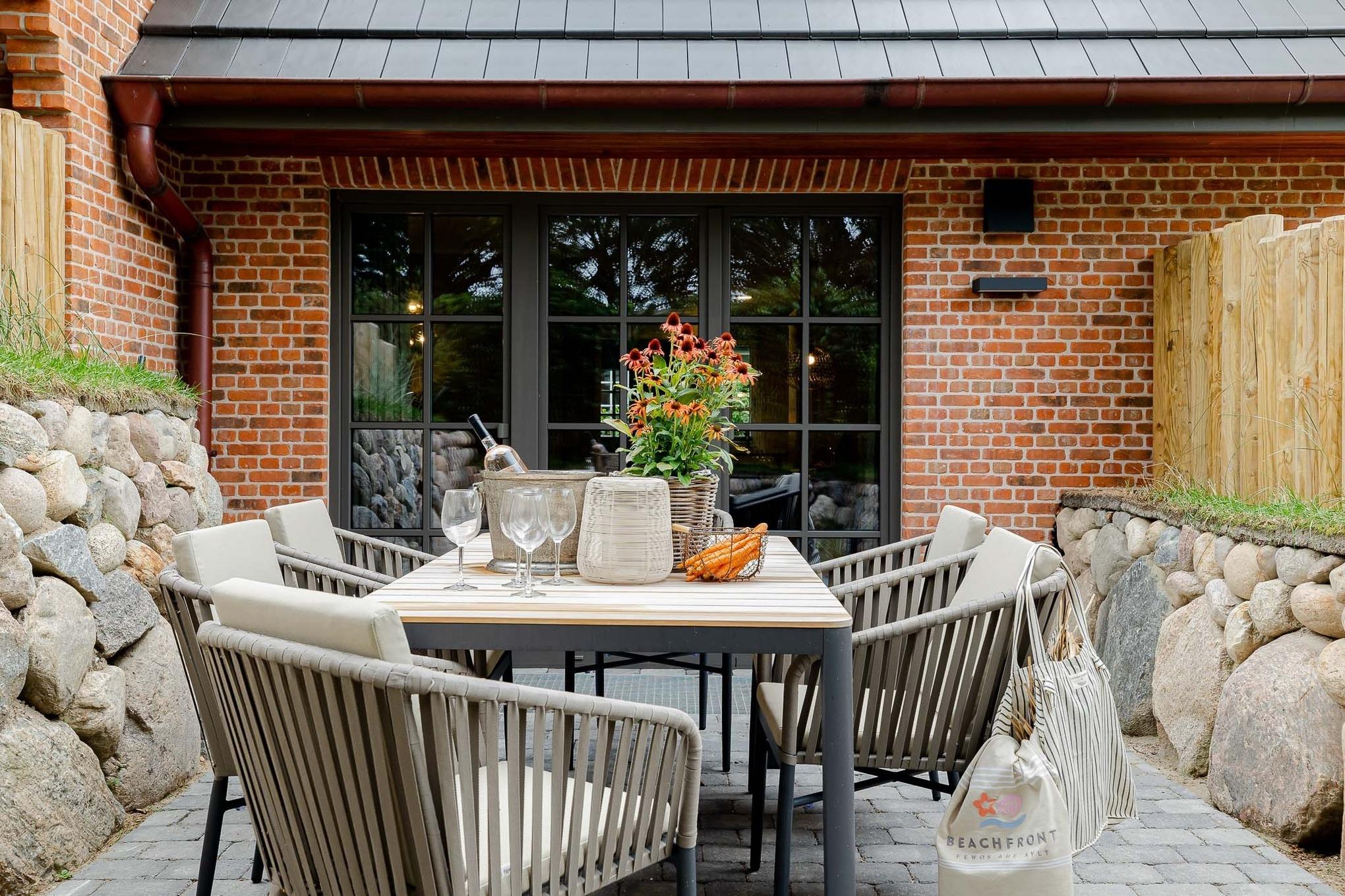 Zur Wohnung gehört eine eigene Terrasse mit modernen Loungemöbeln (Mai–Oktober). Ob Frühstück in der Sonne oder ein Glas Wein am Abend – hier lässt es sich wunderbar entspannen, je nach Wind sogar mit leisem Meeresrauschen.