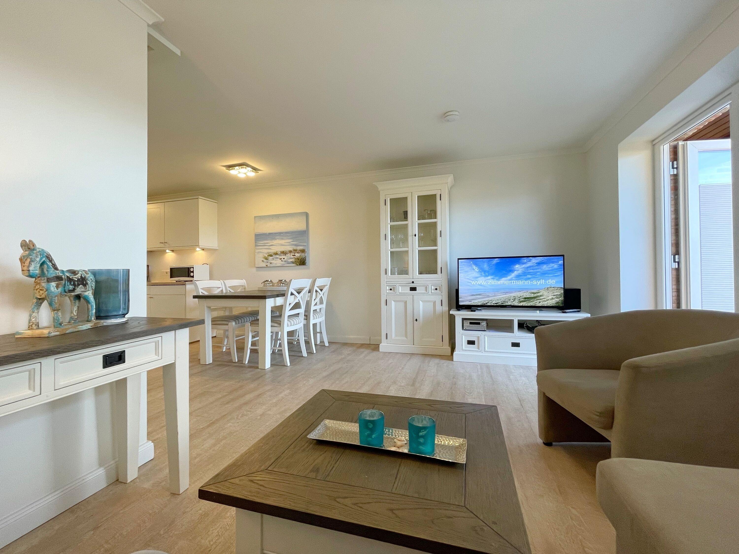 In zentraler Insellage mit Feldblick haben wir diese Mittehausscheibe für Ihren Urlaub auf Sylt im Angebot. Im Erdgeschoss befindet sich der Wohn-Essbereich mit offener Küche, Flur und ein kleines Duschbad.