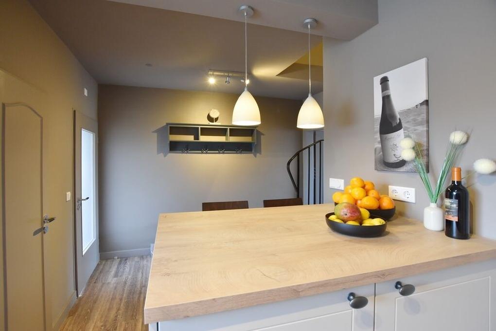 Im unteren Bereich finden Sie eine sehr gut ausgestattete Einbauküche. Hier kann der Koch des Hauses ein leckeres Essen zubereiten, während vom Tresen aus das Ganze mit einem Glas Wein oder einer Tasse Kakao begleitet werden kann. Das Erdgeschoss punktet weiter mit einem großen Wohn-Essbereich. Hier können Sie am großen Holztisch nicht nur gemeinsame Mahlzeiten einnehmen, sondern auch Spiele spielen, arbeiten oder nur mit einer Tasse Tee in den Garten schauen. Der wunderschöne Teakholz-Tisch bildet einen kommunikativen Mittelpunkt im Haus.