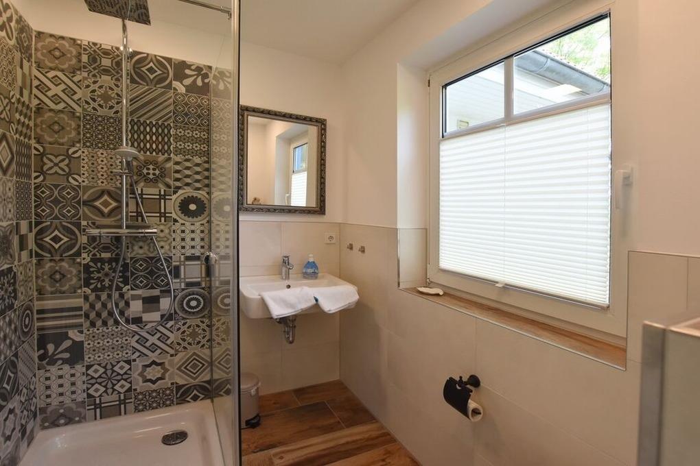 Zweites Badezimmer mit Regendusche und Handbrause , Waschbecken WC und kleiner Abstellraum.