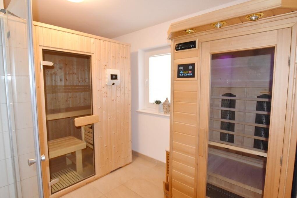 UG: Wellnessbereich mit Sauna und Infrarot-Wärmekabine, Zweites Badezimmer mit Wanne und Dusche, Ruheraum mit Liegemöglichkeit für 2 Personen.