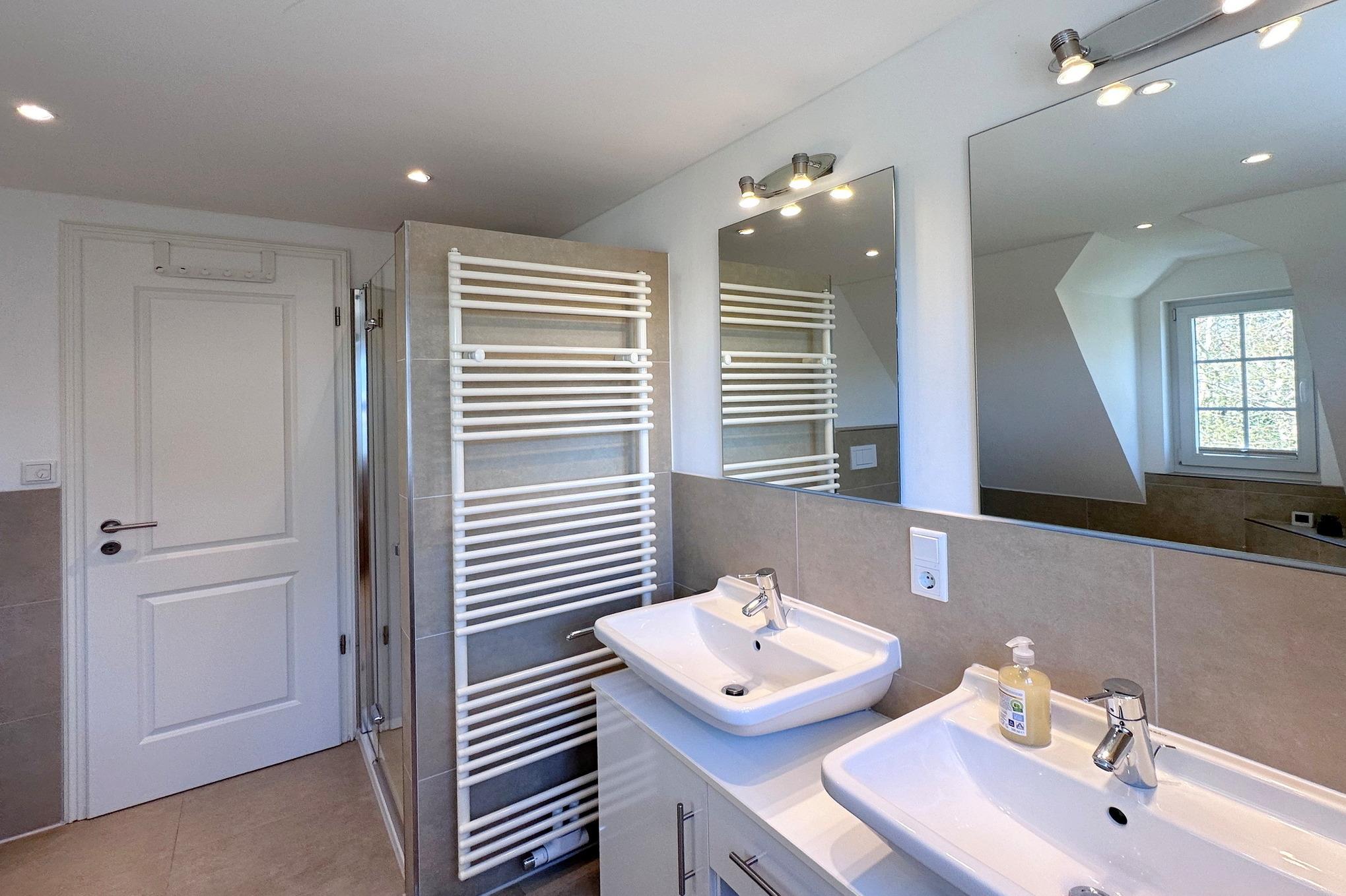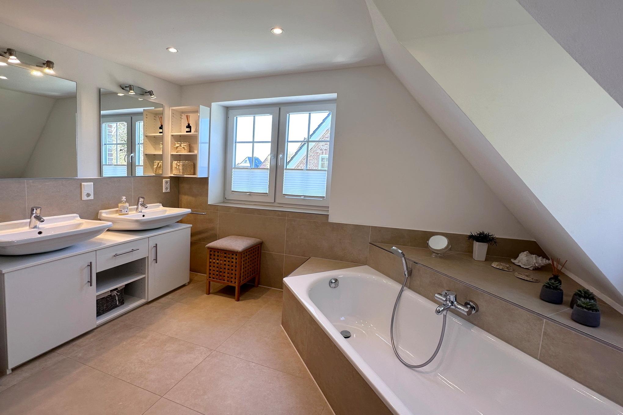 OG: grosses Schlafzimmer mit Doppelbett, Einbauschränken und zusätzlichem TV, kleines Schlafzimmer mit Einzelbett, grosses modernes Badezimmer mit Doppelwaschbecken, Wanne und Dusche,