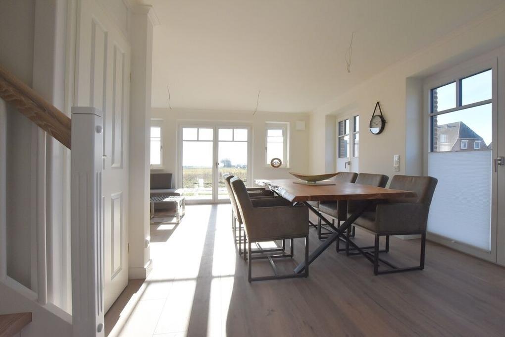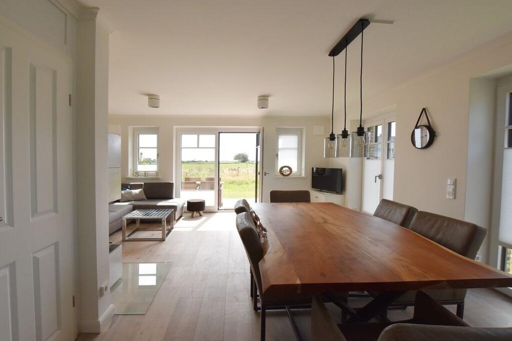 Im Ostertresker 13 ist eine exklusive Doppelhaushälfte für 5 Personen in ruhiger Ortsrandlage entstanden mit freiem Feldblick. Der Wohnbereich mit bodentiefen Fenstern und offener Küche ist modern und hell gestaltet. Echtholzfussböden und ein Kamin sorgen für friesische Gemütlichkeit. Im OG und SB befinden sich 3 Schlafzimmer für insgesamt 5 Personen. Das Haus verfügt über 2 Bäder, Garten und Terrasse in südlicher Ausrichtung und einen PKW-Stellplatz auf dem Grundstück.