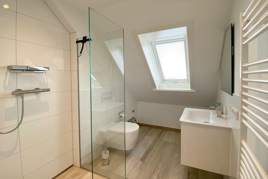 Reihenhaus mit Terrasse nach Süden, Wohnzimmer mit Wintergarten, gemütliche Eßecke und Fernseher, Sitzgruppe, Küche mit Geschirrspüler, Backofen, Mikrowelle, Waschmaschine und Trockner, 3 Schlafzimmer für je 2 Personen, neues Bad mit begehbarer Dusche, WC und Waschbecken, 1 Gäste- WC, im Spitzboden befindet sich ein zusätzlicher Raum mit Doppelbett und einem zweitem Duschbad mit WC.