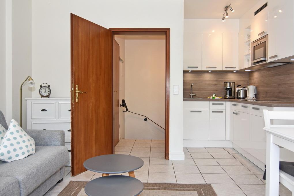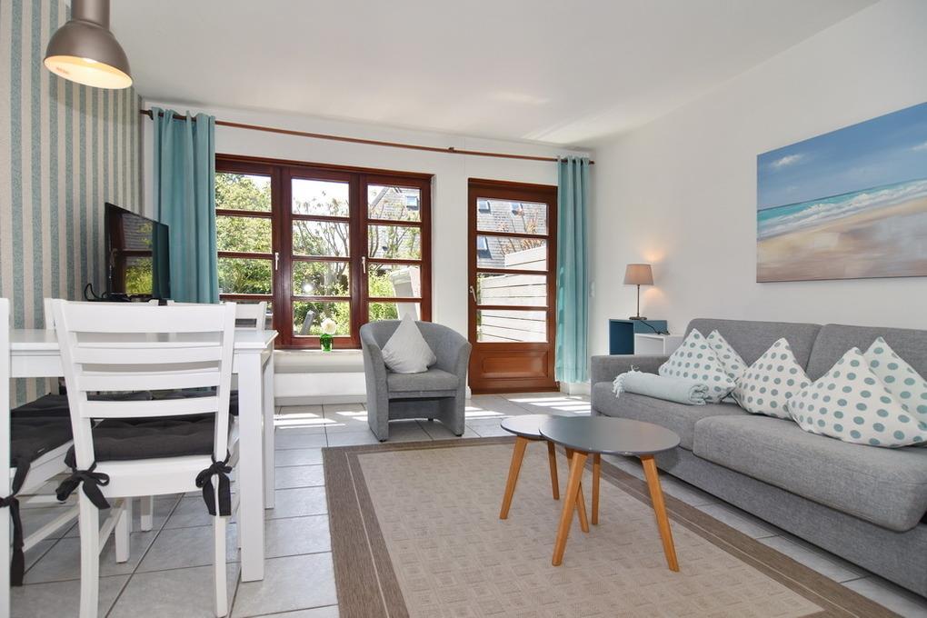 Schöne 2-Zimmer-Maisonettewohnung. Ca. 45 qm. Nichtraucher-Whg.! EG: Wohnzimmer mit sonniger Südterrasse, Strandkorb (Apr.-Okt.), Sitzecke mit Doppelschlafcouch (150x197), Kabel-Farb-TV, Radio, W-Lan (ohne Gewähr), Eßplatz für 4 Personen, Küchenzeile mit Mikrowelle und Geschirrspüler. UG: Schlafzimmer mit Doppelbett (2x90x200), Duschbad/WC. Die Wohnung ist im EG gefliest. Kostenlose Benutzung des hauseigenen Schwimmbades und der Sauna. Waschmaschine und Trockner über Münzautomaten. Bettwäsche und Handtücher sind zur Anreise aufgezogen! Tierhaltung ist nur im EG gestattet. (keine Kampfhunde)
