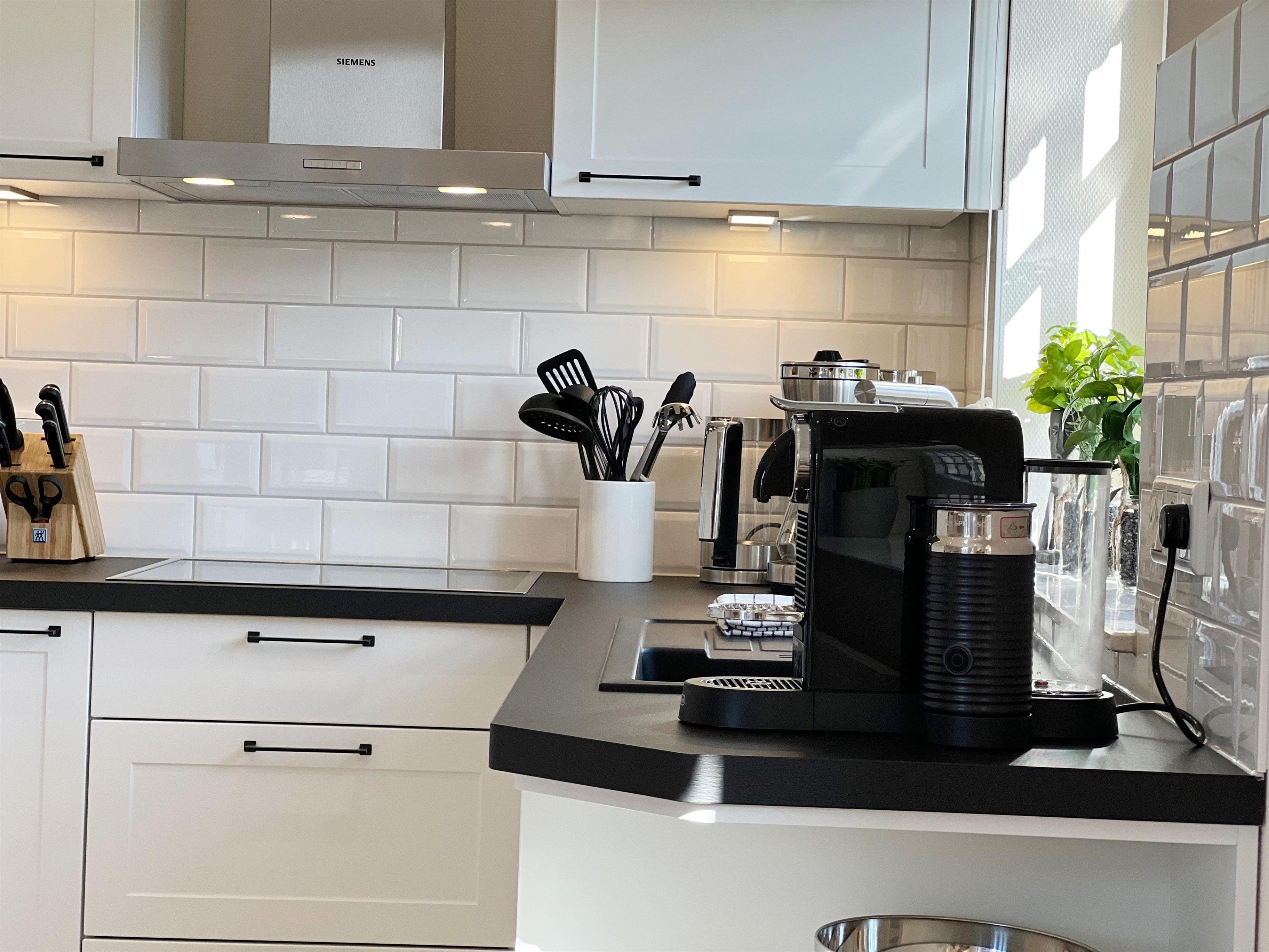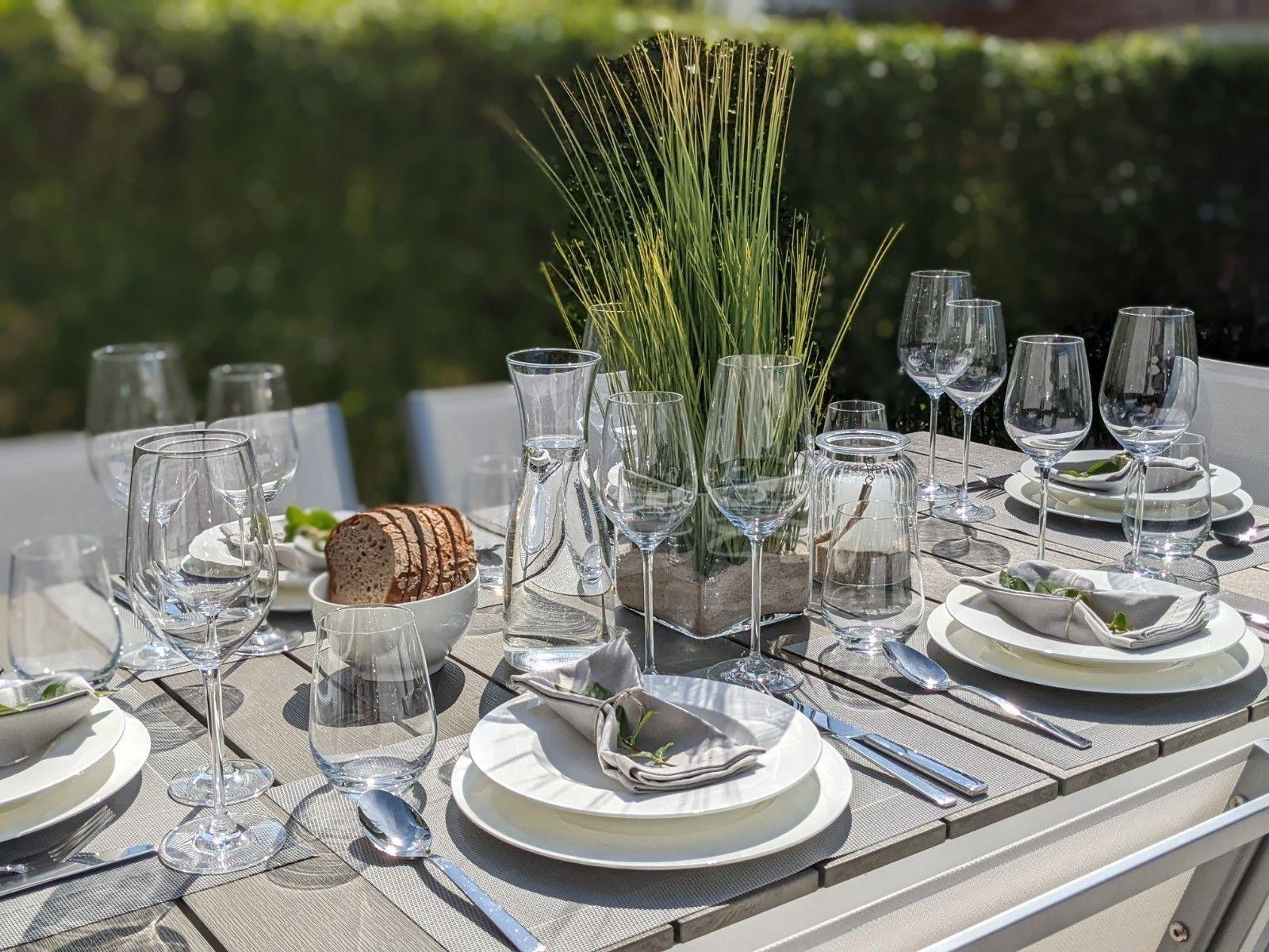 Die angrenzende neue Landhausküche verfügt über einen Siemens-Induktionsherd mit Backofen, einer Geschirrspülmaschine, einer Nespresso-Kapselkaffeemaschine und weiteren hochwertigen WMF-Küchengeräten. Unmittelbar neben der Küche ist der Essbereich mit großem Esstisch und sechs Sitzplätzen.