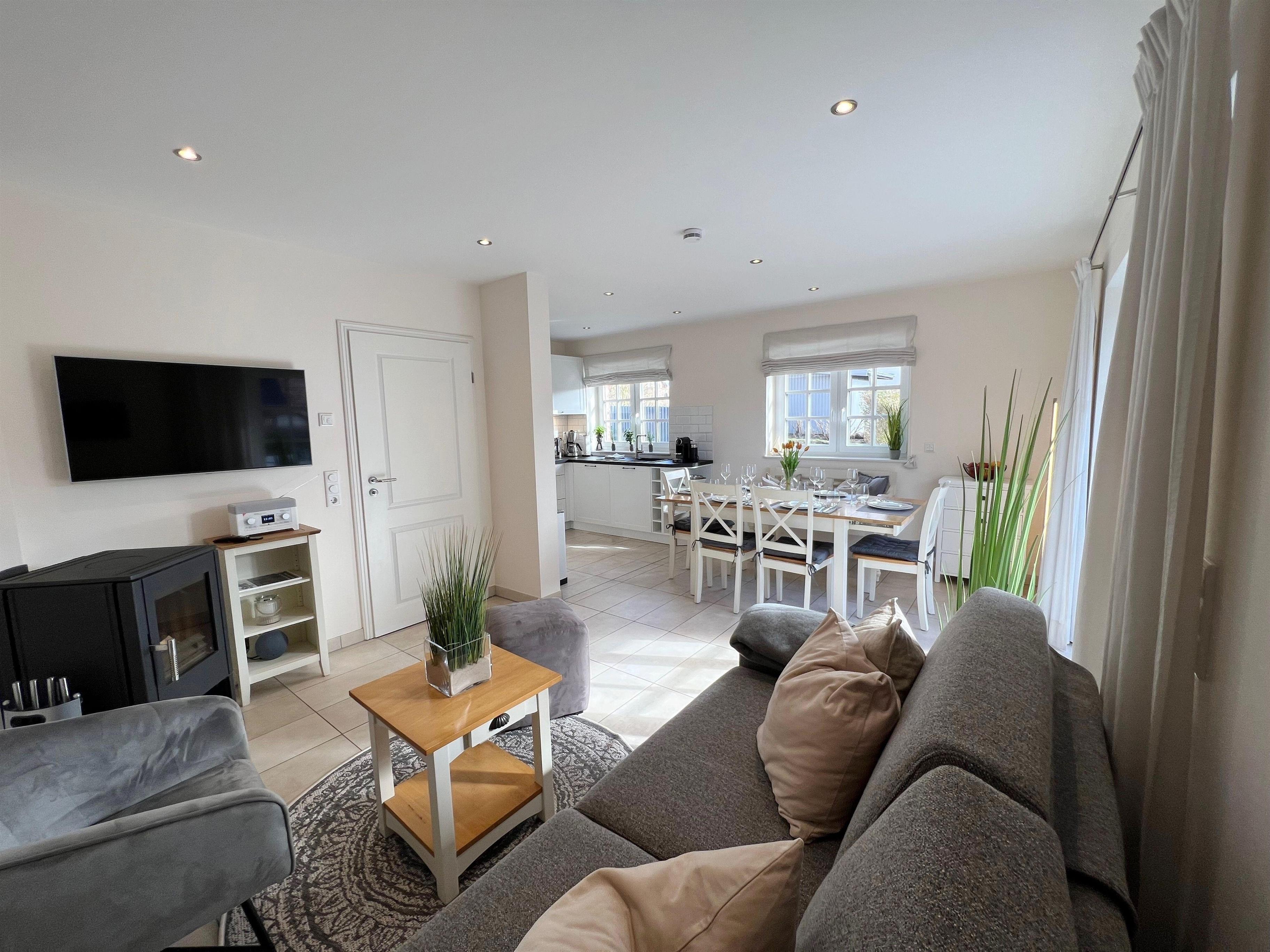 Der Wohnbereich der EG/UG-Wohnung ist mit einem neuen Schlafsofa (160x200cm), einem stimmungsvollen Kaminofen, einem neuen LG Smart-TV (Internet- und Kabelanschluss), einem Teufel Internetradio/Bluetooth-Lautsprecher sowie einem Telekom WLAN-Internetanschluss ausgestattet.