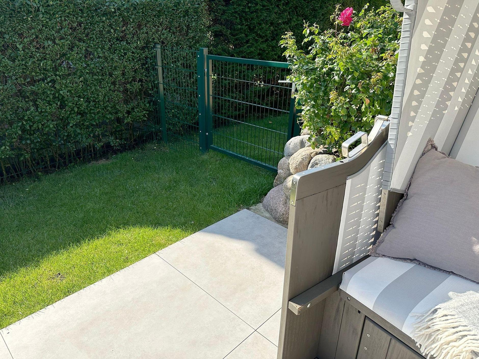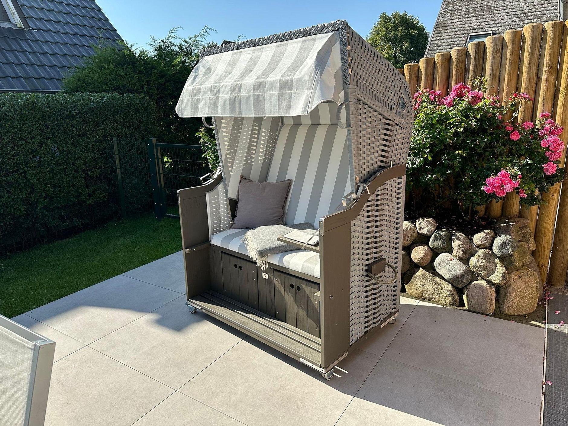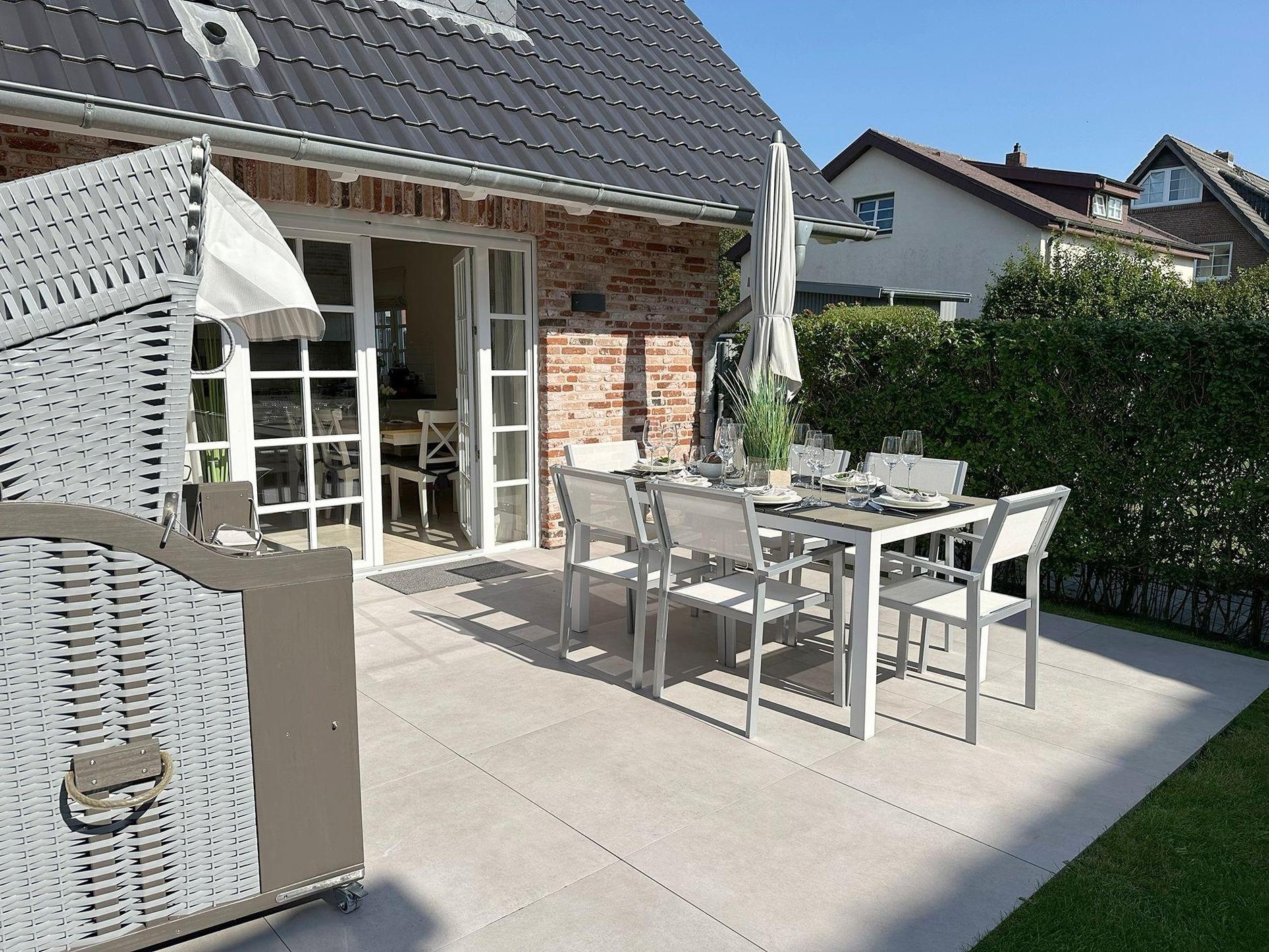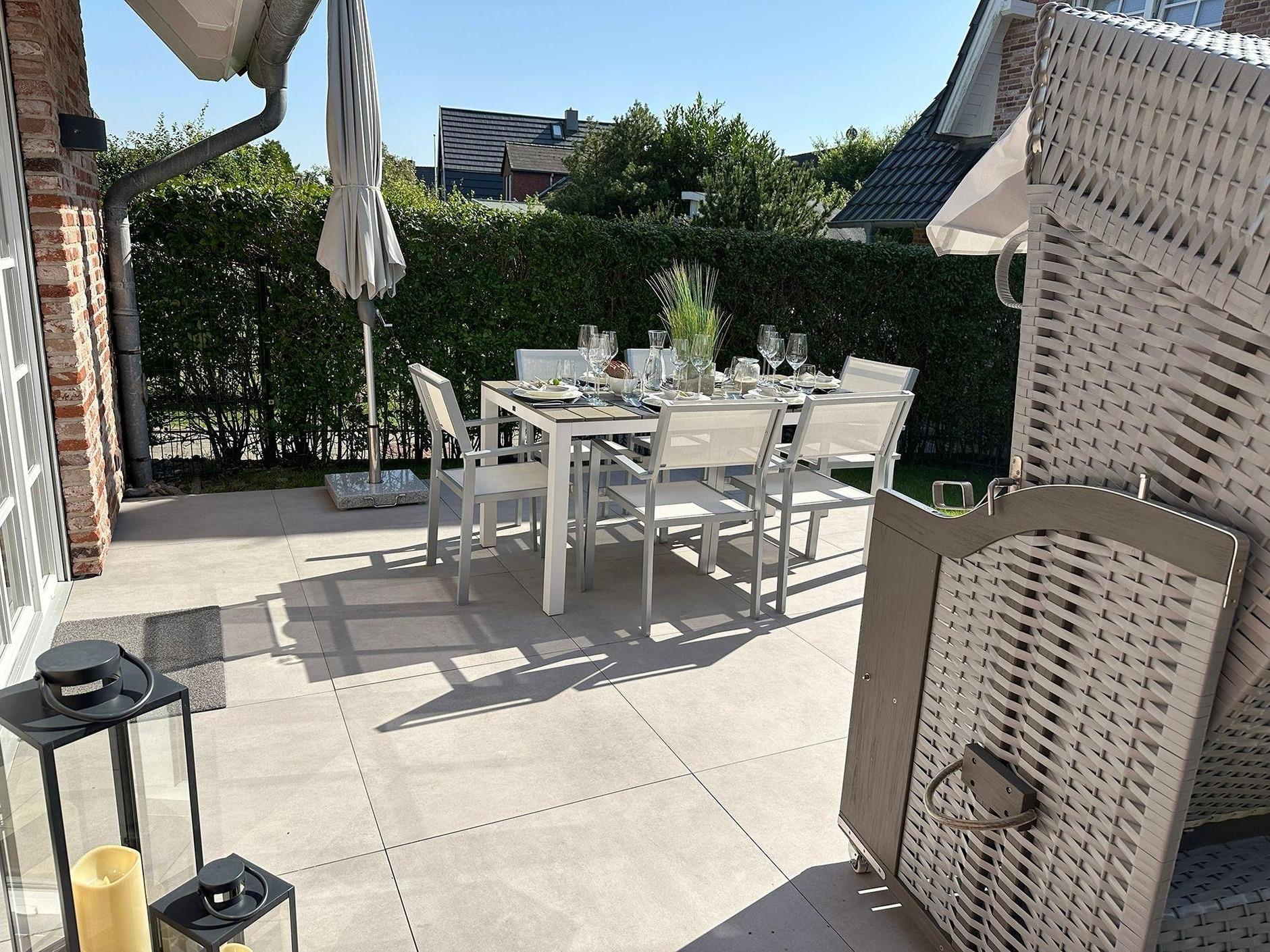 Auf der 20qm großen, perfekt nach Süden ausgerichteten Sonnenterrasse wartet ein großer Gartentisch mit sechs Designerstühlen, ein Sonnenschirm, ein Sylter Strandkorb sowie ein kleiner komplett eingezäunter Garten auf Sie.