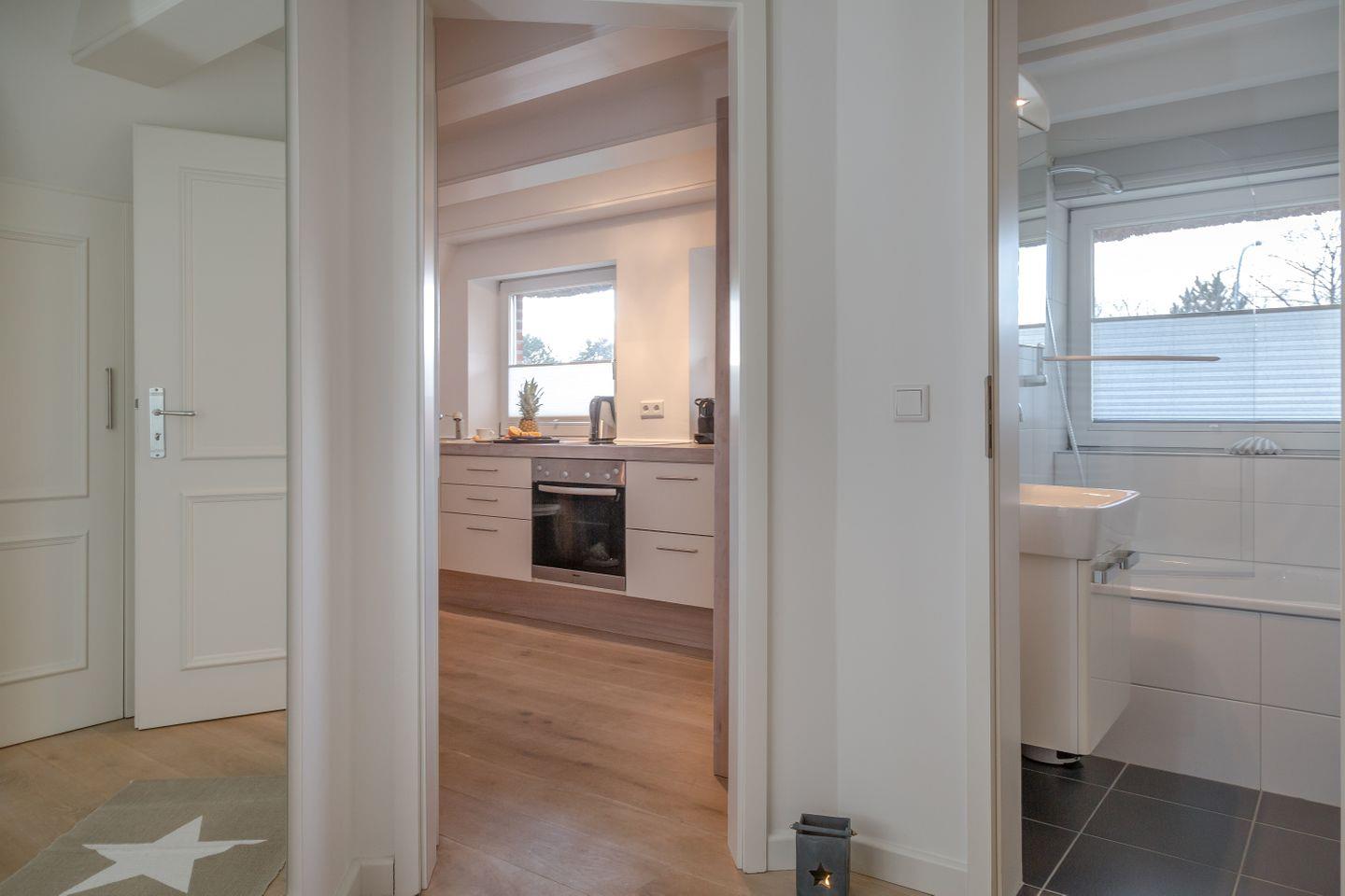 Im lichtdurchfluteten Wohn- und Essbereich erwartet Sie eine gemütliche Sofaecke für entspannte Abende sowie moderne Technik für Ihre Unterhaltung. Die offene, hochwertig ausgestattete Küche lässt keine Wünsche offen und lädt dazu ein, gemeinsam köstliche Urlaubsmahlzeiten zuzubereiten – ob ein ausgedehntes Frühstück oder ein gemütliches Dinner nach einem Tag am Meer.