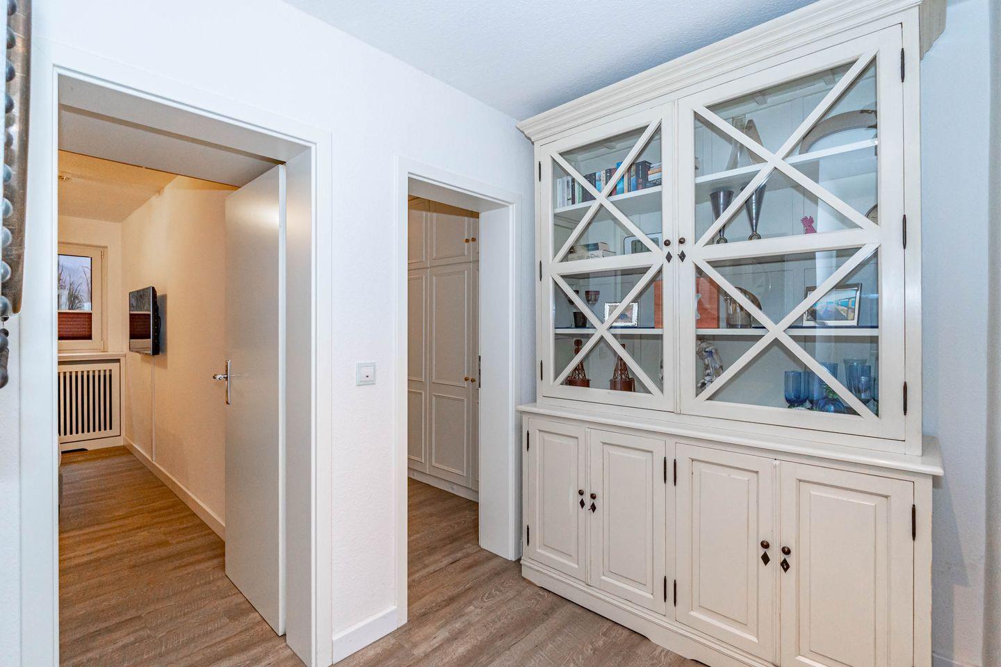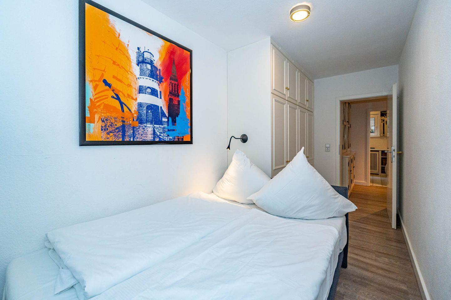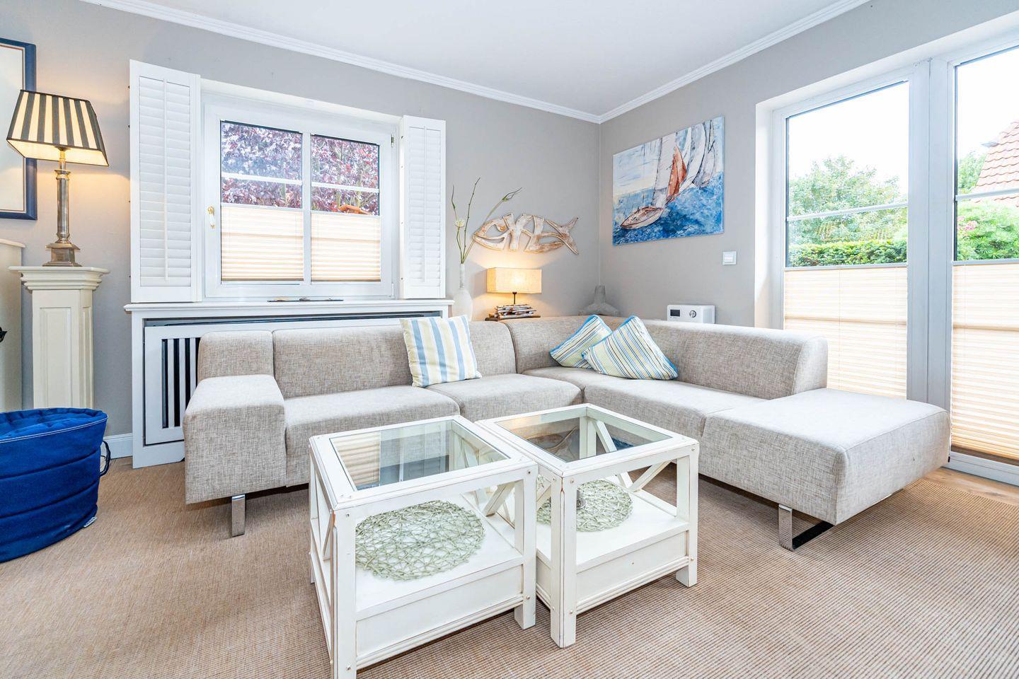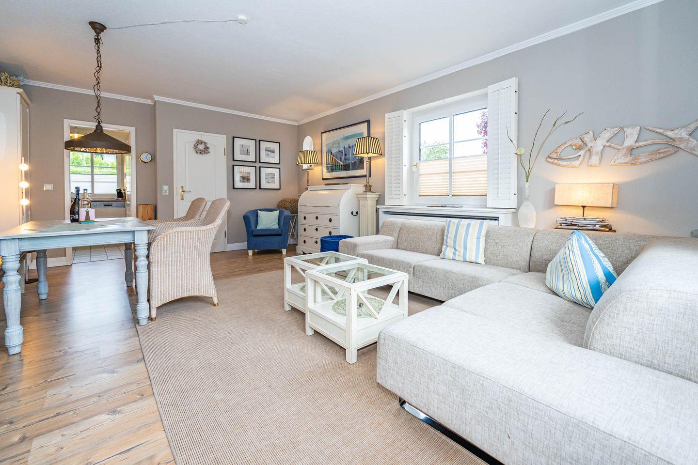 Die 3-Zimmer-Ferienwohnung (ca. 75m²) verteilt sich über zwei Ebenen und befindet sich in ruhiger Lage in Tinnum. Im Erdgeschoss präsentiert sich das helle Wohnzimmer mit Essbereich und großzügiger Sitzlandschaft, TV und Essbereich. Von hier aus gelangen Sie direkt auf die Terrasse mit eigenem, herrlich eingewachsenen Garten mit Sitzgruppe und Sylter Strandkorb. Ebenfalls auf dieser Ebene befindet sich die komplett ausgestattete Küche (Nespresso, Cerankochfeld, Backofen, Geschirrspüler, Kaffeemaschine, Mikrowelle, Kühlschrank). Im Souterrain finden Sie neben den beiden Schlafzimmern mit jeweils einem Boxspringbett und Einbauschrank mit viel Stauraum, Fernseher, auch das Badezimmer mit Dusche und WC. Ein kleiner zusätzlicher Raum mit Waschtisch dient z. B. als Ankleidezimmer. Zwischen Westerland und Keitum gelegen, in Mitte der schönen Insel, bietet Tinnum eine Menge Abwechslung und alle umliegenden Orte der Insel sind schnell zu erreichen. Bitte beachten Sie, dass diese Ferienwohnung eine Nichtraucherwohnung ist und die Haustierhaltung nicht gestattet ist. Ein Pkw-Stellplatz ist direkt am Haus verfügbar.