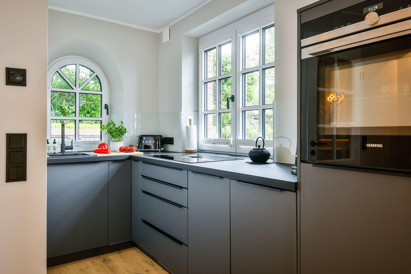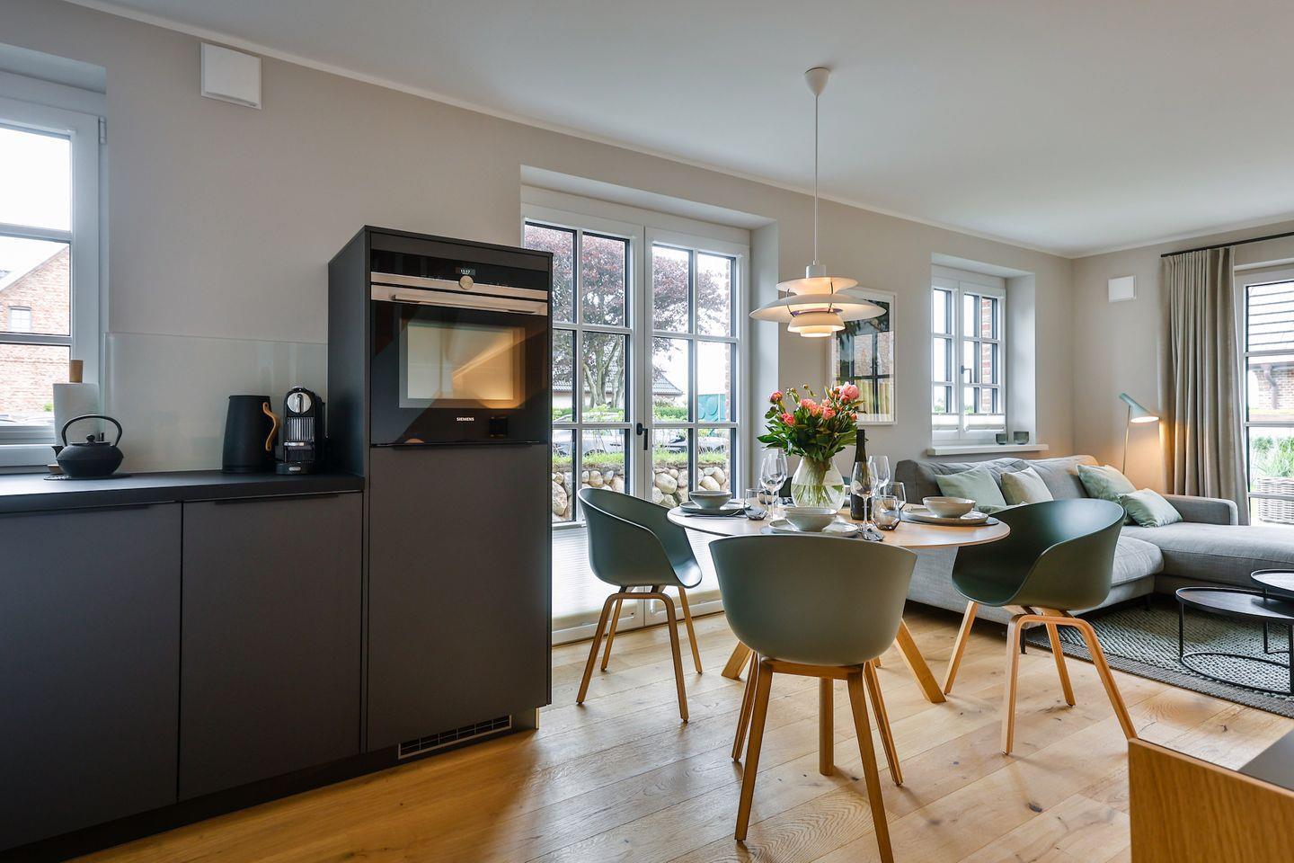 Die offene Küche verfügt über Siemens Markeneinbaugeräte mit Backofen und Mikrowelle, Spülmaschine, Kühl-Gefrierkombi, Bora Induktionsherd, SMEG Toaster und Wasserkocher, Nespresso-Kaffeemaschine sowie ein umfangreiches Angebot an Koch- und Backutensilien. Im Hauswirtschaftsraum steht zusätzlich ein hochwertiger Weinkühlschrank zur Verfügung – ideal temperierte Getränke für genussvolle Abende sind damit garantiert.