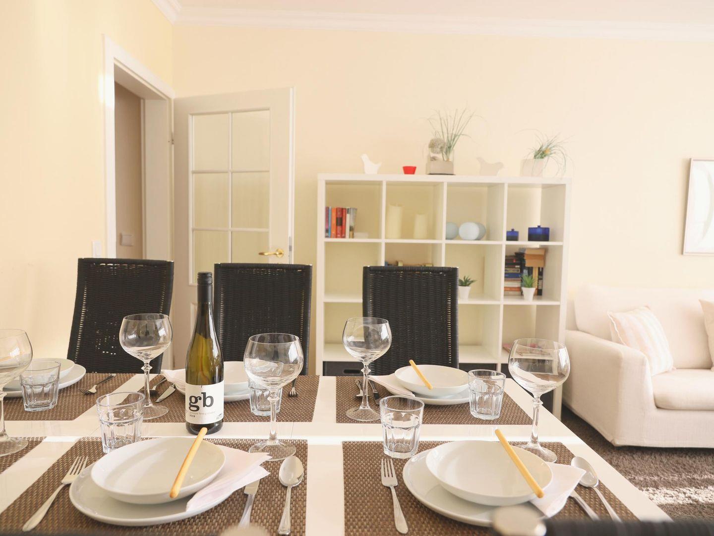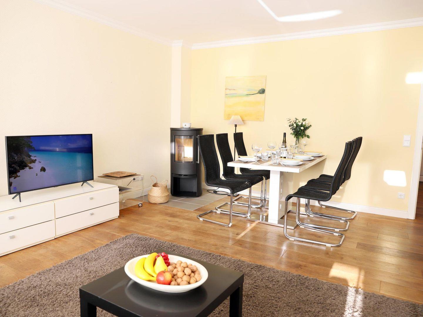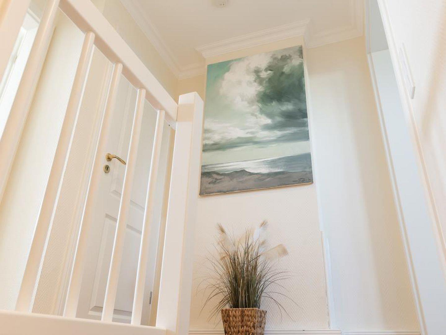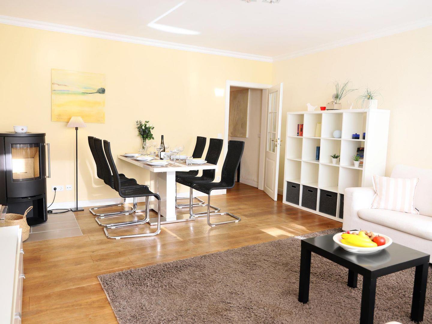Dieses gemütliche Reiheneckhaus (ca. 118 m²) in Tinnum, Sylt, bietet Platz für bis zu 6 Personen und liegt fernab vom Trubel, jedoch zentral und mit herrlichem Blick auf die Tinnumer Wiesen. Es bietet ländliche Idylle ohne Lärm und Durchgangsverkehr, mit direkten Spazier- und Radwegen vor der Haustür. Der Strand ist ebenfalls nicht weit entfernt, ideal für entspannte Spaziergänge. Im Erdgeschoss befinden sich eine moderne, separate Küche sowie ein Wohnzimmer mit gemütlicher Sitz- und Essecke. Zur Ausstattung gehören ein TV-Flachbildschirm, eine Stereoanlage mit DVD-Player und ein Gäste-WC im Eingangsbereich. Vom Wohnzimmer gelangt man auf die Südterrasse mit großem Garten, Tisch und Stühlen, die zum Sonnenbaden einlädt. Im Obergeschoss gibt es zwei Schlafzimmer mit Doppelbett (180 x 200 cm) und ein Duschbad mit WC und Fenster. Ein weiteres Schlafzimmer mit Doppelbett (180 x 200 cm) befindet sich im Dachgeschoss und verfügt über ein kleines Duschbad mit WC. Zur Ausstattung gehören außerdem eine Waschmaschine in der Garage und ein kostenfreier Stellplatz. Ein Fahrradraum ist nicht vorhanden. Haustiere sind willkommen.