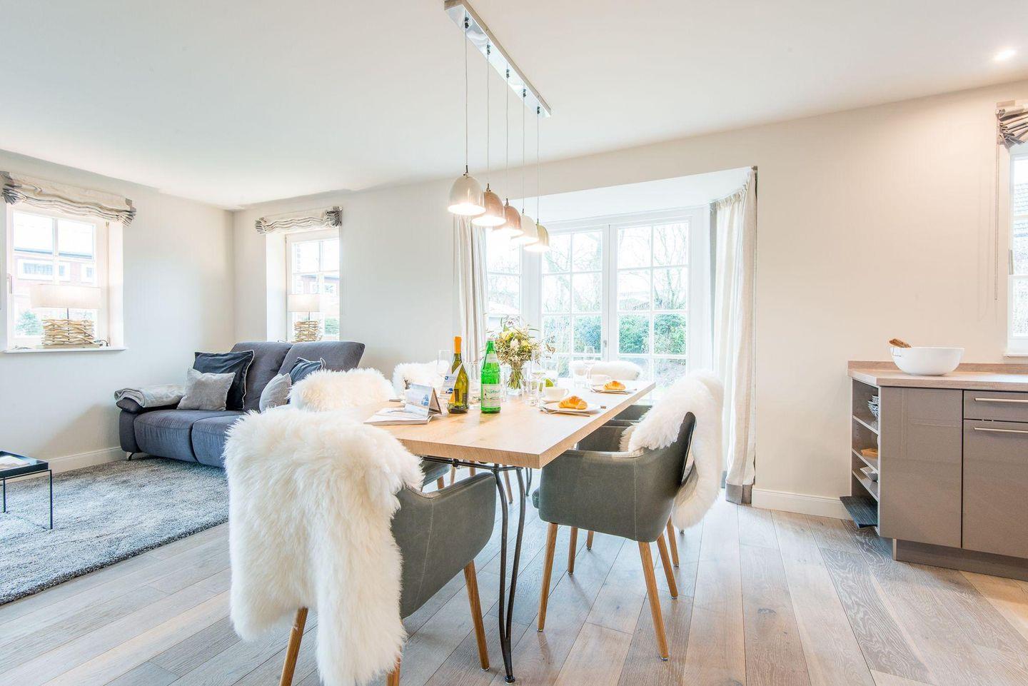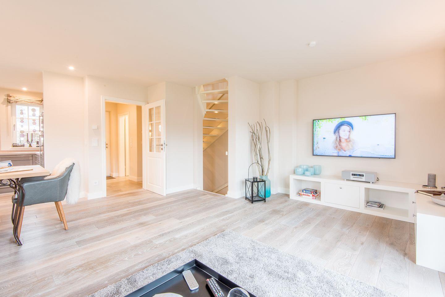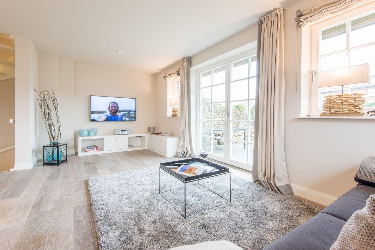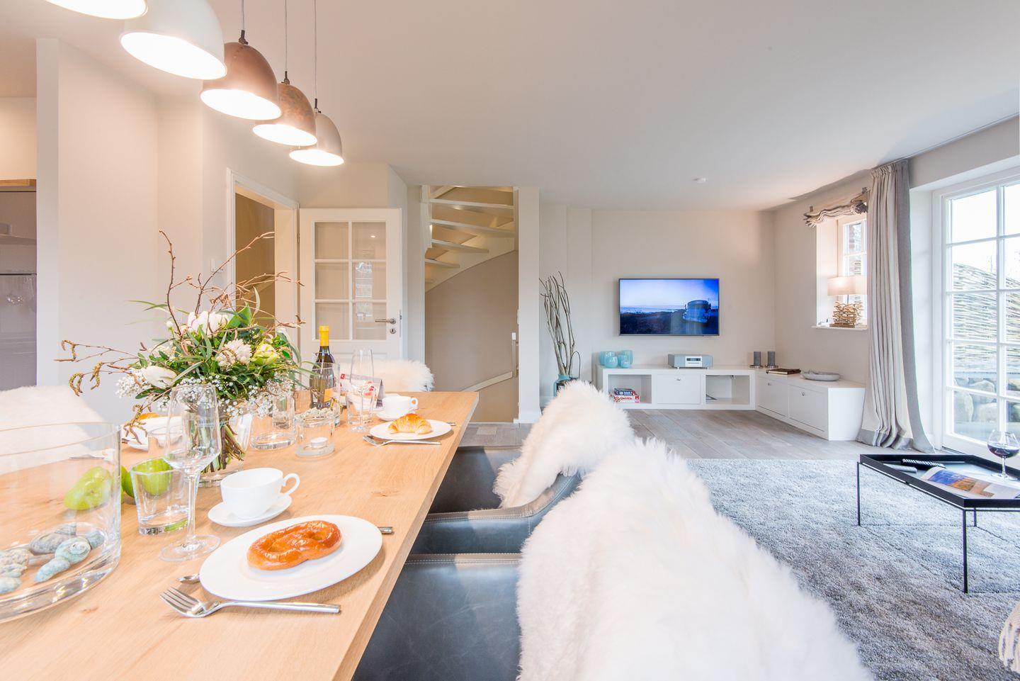 Das lichtdurchflutete Wohn- und Esszimmer ist komfortabel mit einem großen Sofa, Esstisch und TV ausgestattet und führt direkt auf die Westterrasse sowie in den Garten. Hier können Sie entspannte Stunden verbringen und die Sylter Sonne genießen – perfekt für erholsame Tage und Abende im Freien.