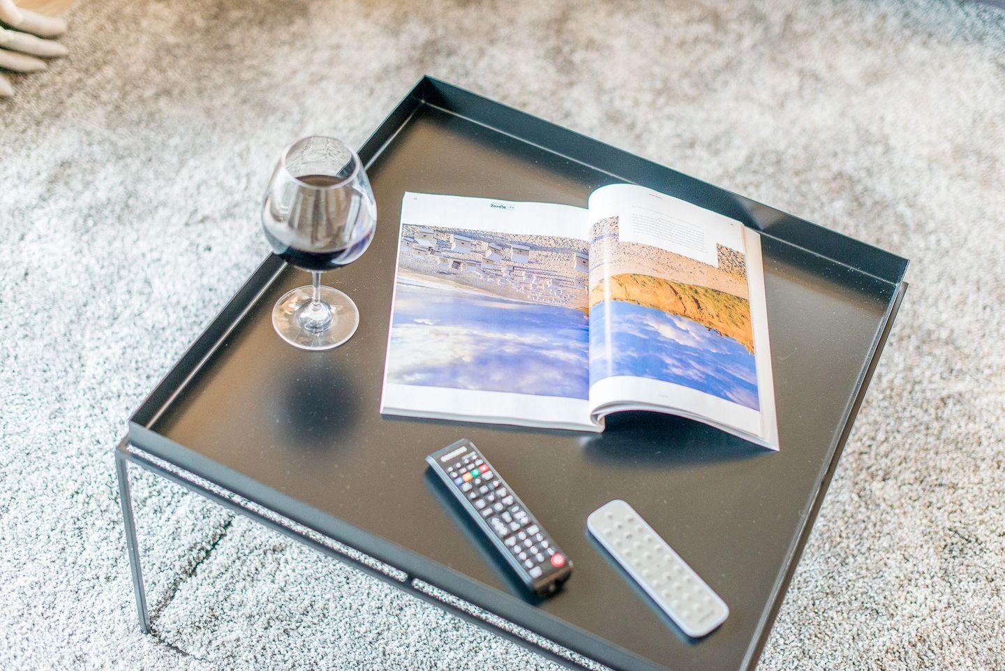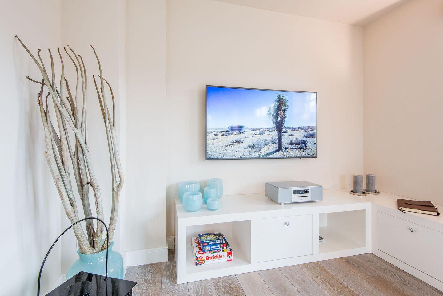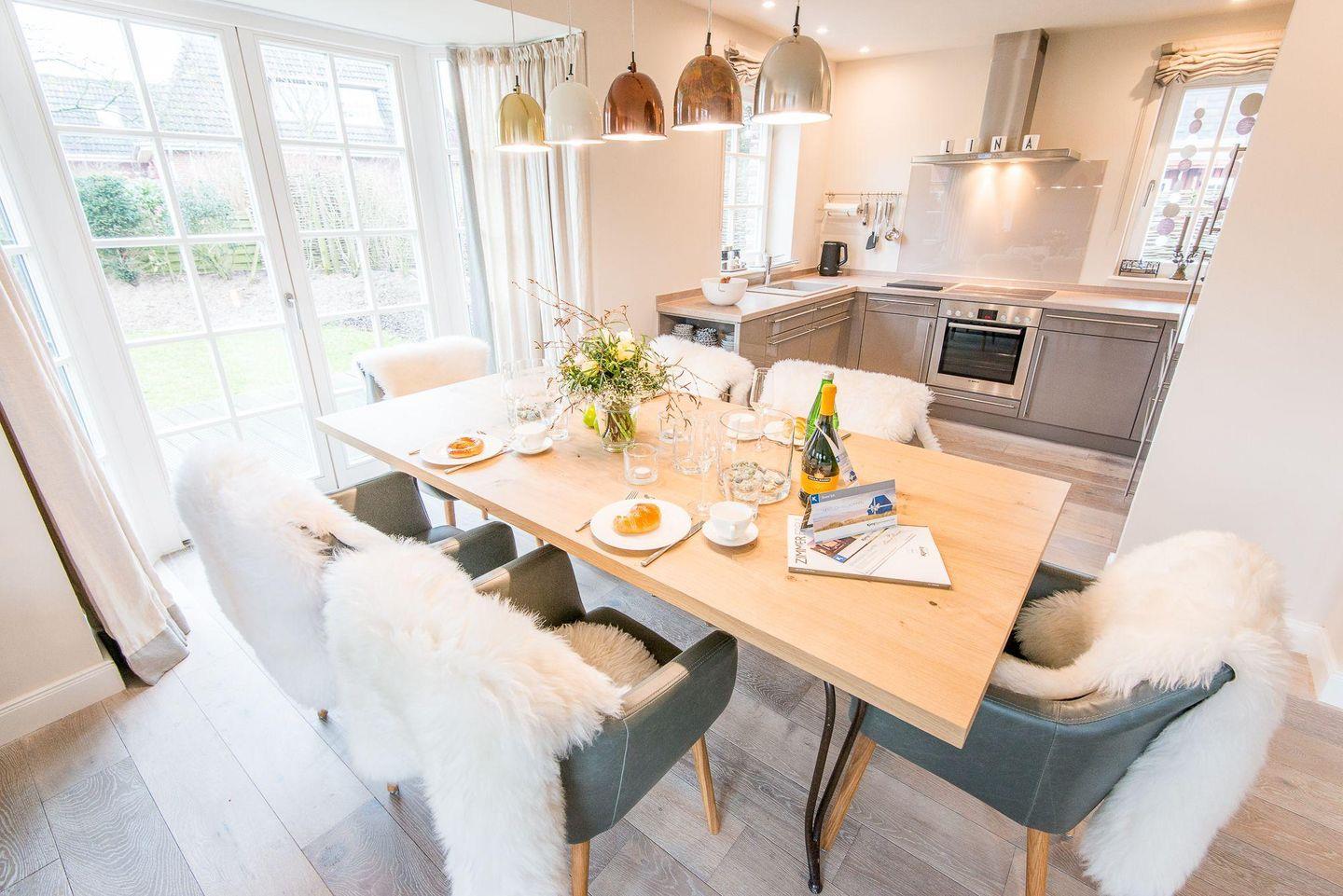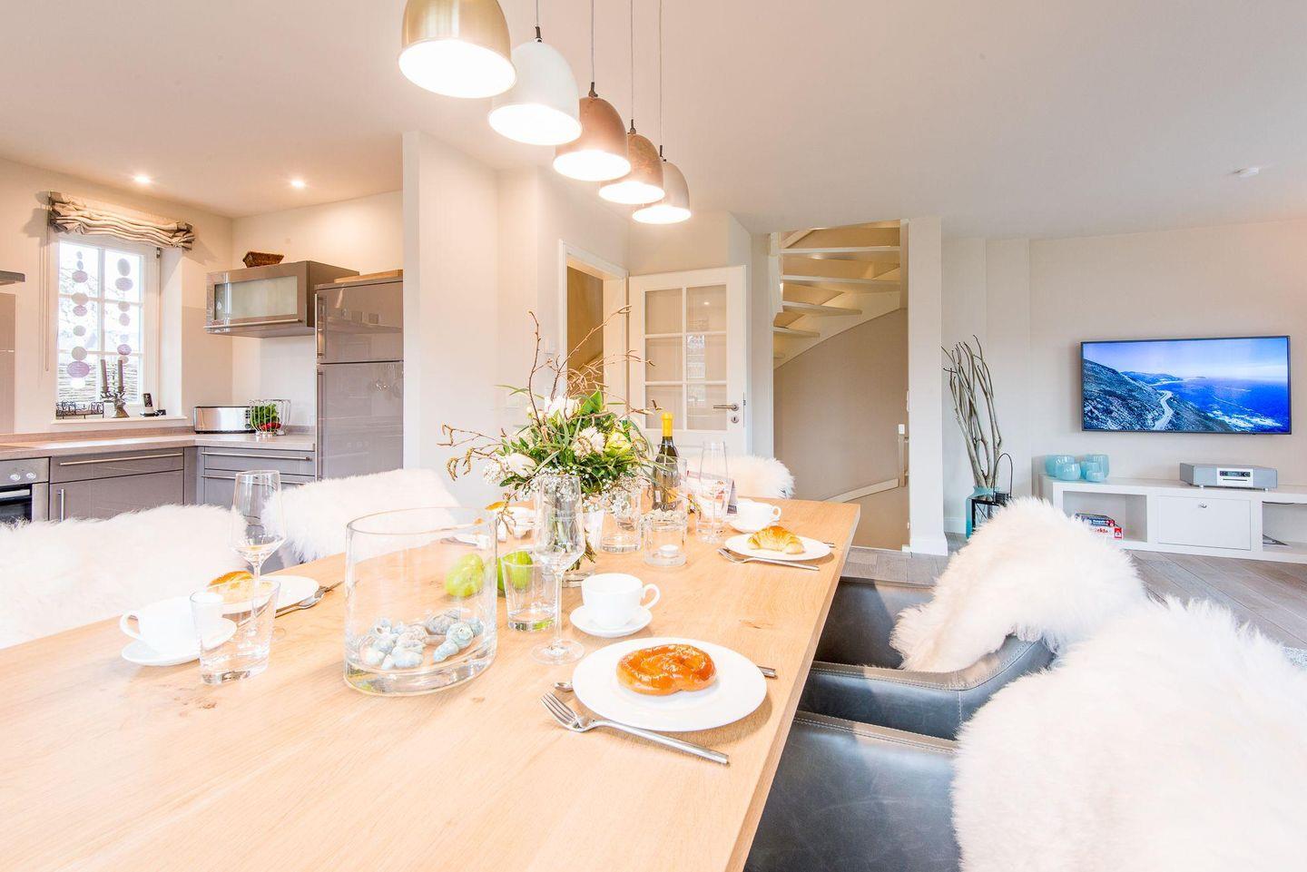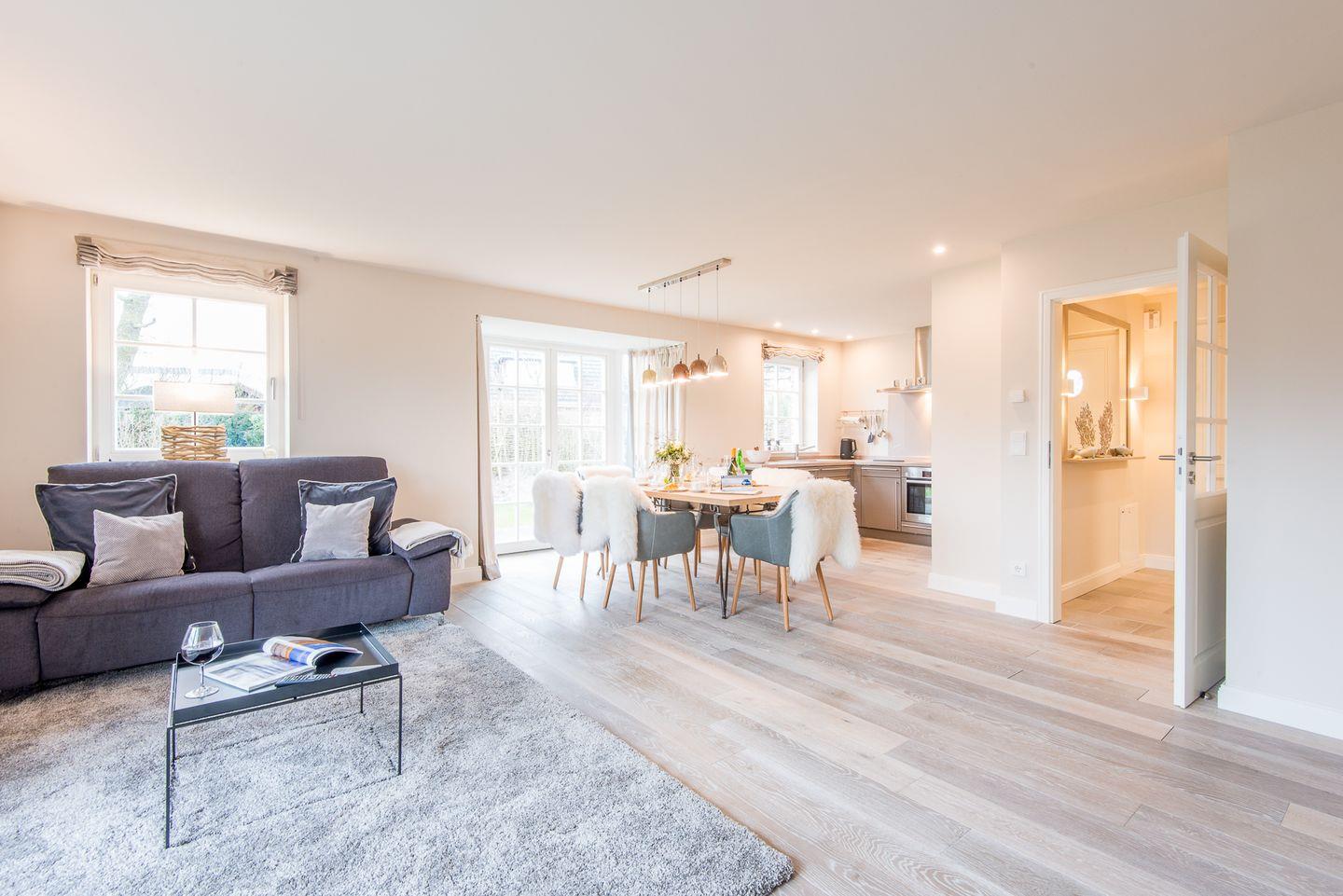 Das lichtdurchflutete Wohn- und Esszimmer ist komfortabel mit einem großen Sofa, Esstisch und TV ausgestattet und führt direkt auf die Westterrasse sowie in den Garten. Hier können Sie entspannte Stunden verbringen und die Sylter Sonne genießen – perfekt für erholsame Tage und Abende im Freien.