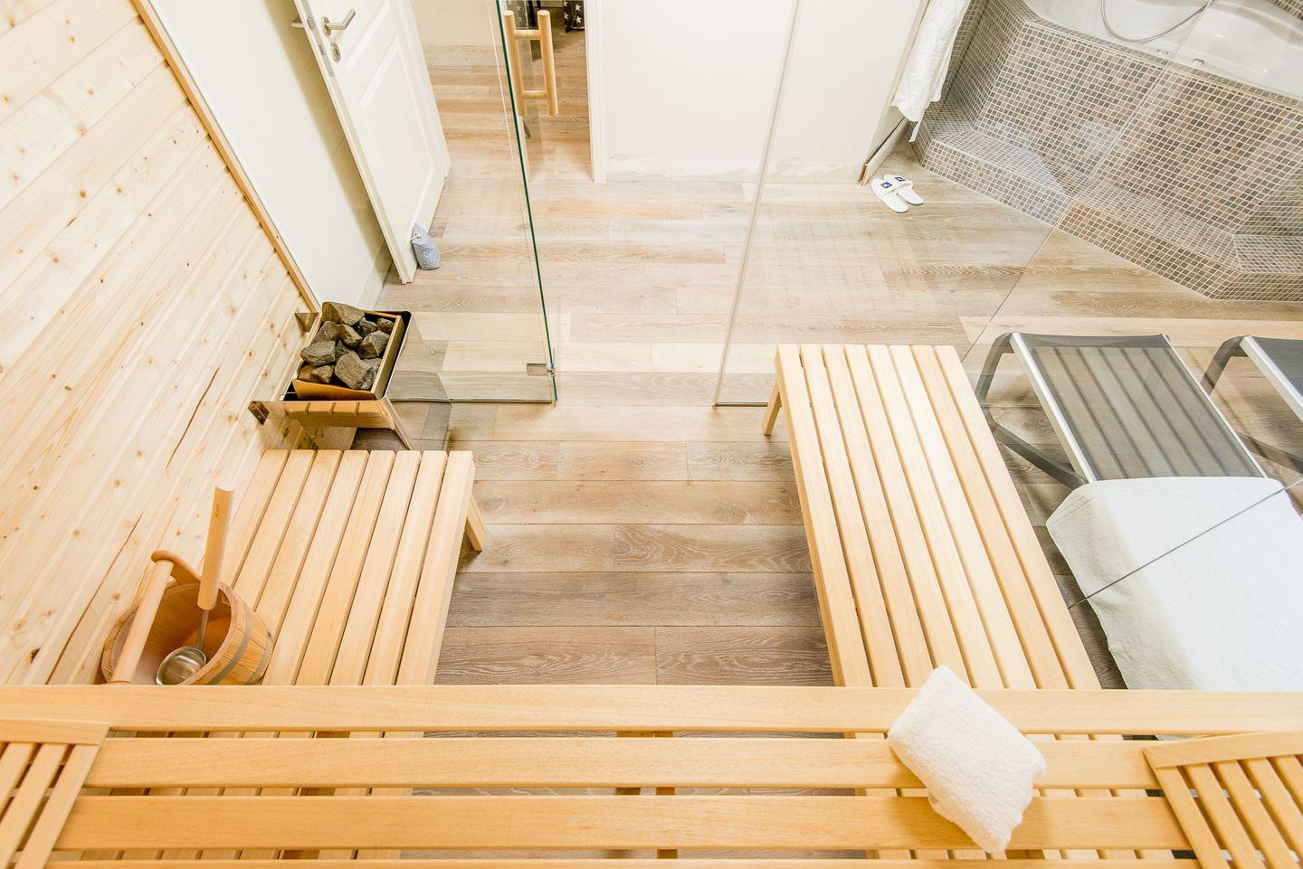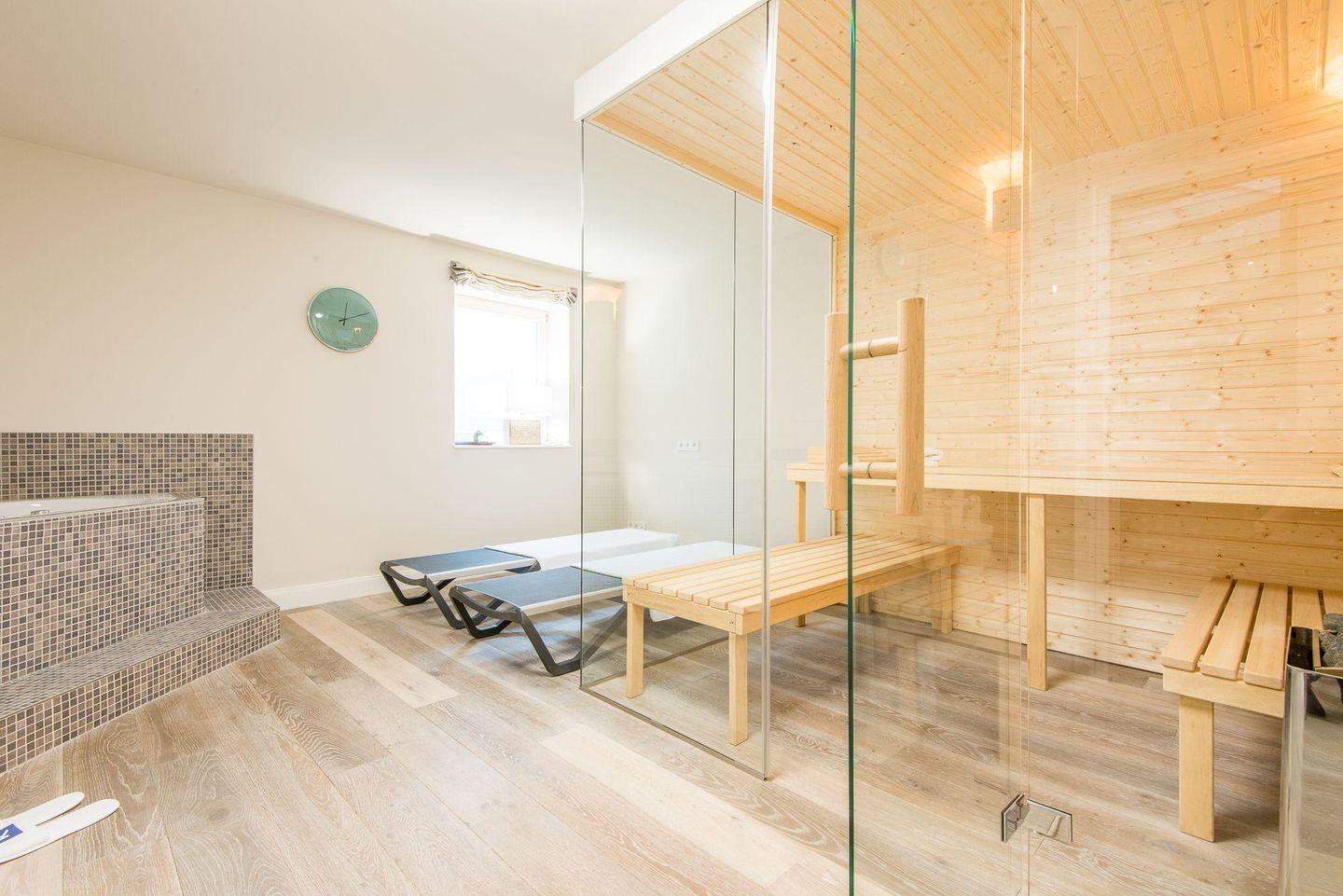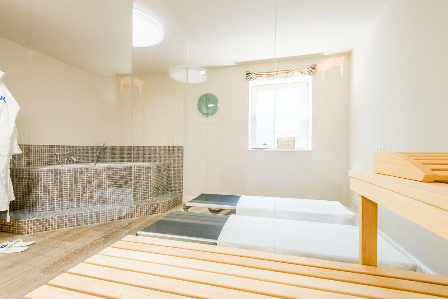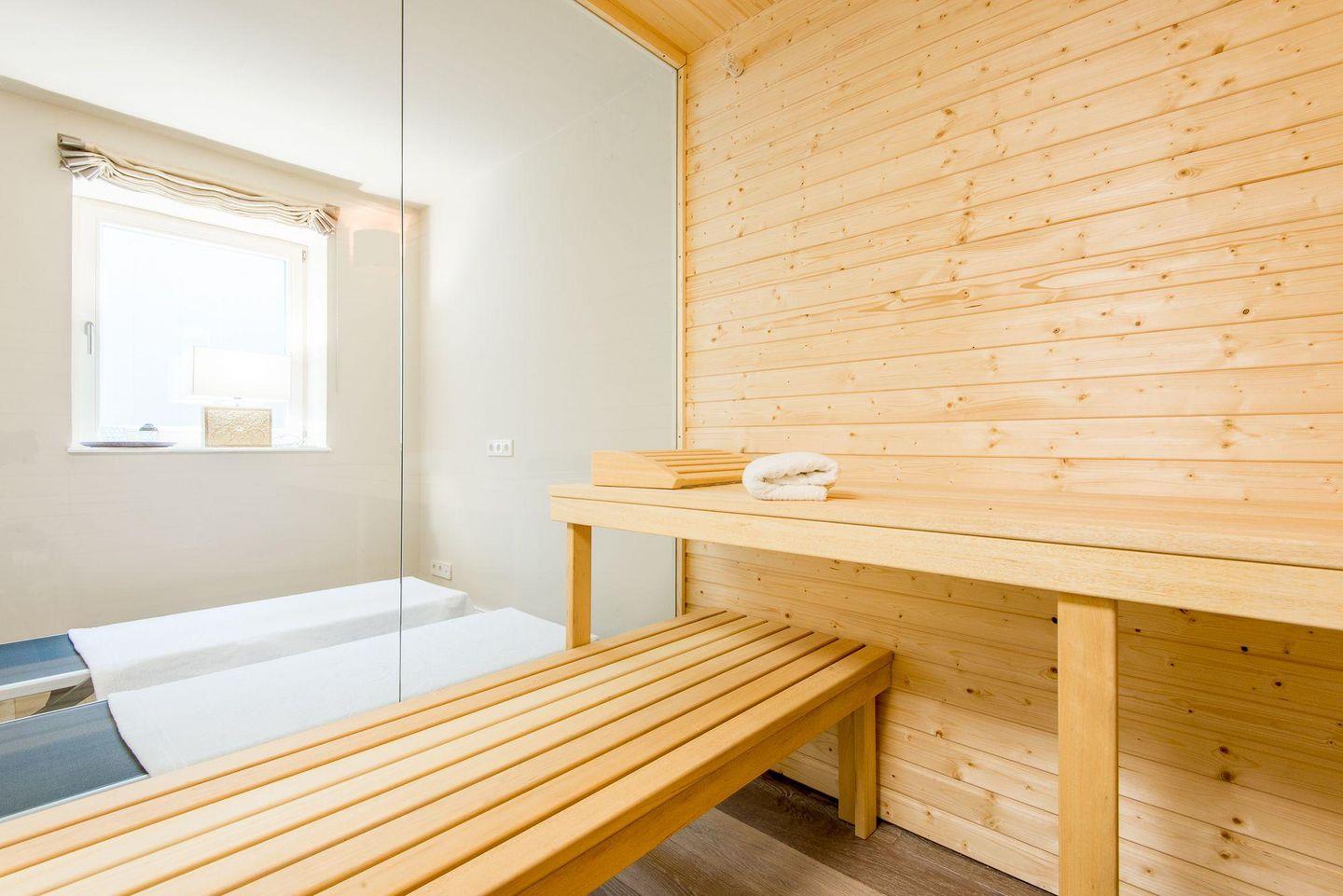 Für höchsten Komfort sorgen zwei moderne Badezimmer mit ebenerdigen Duschen, Doppelwaschbecken, Handtuchwärmern und Tageslicht sowie ein zusätzliches Gäste-WC im Erdgeschoss. Im Wellnessbereich des Hauses befindet sich eine große, private Sauna und ein Ruheraum, der nach einem Tag voller Erlebnisse zur Entspannung einlädt.