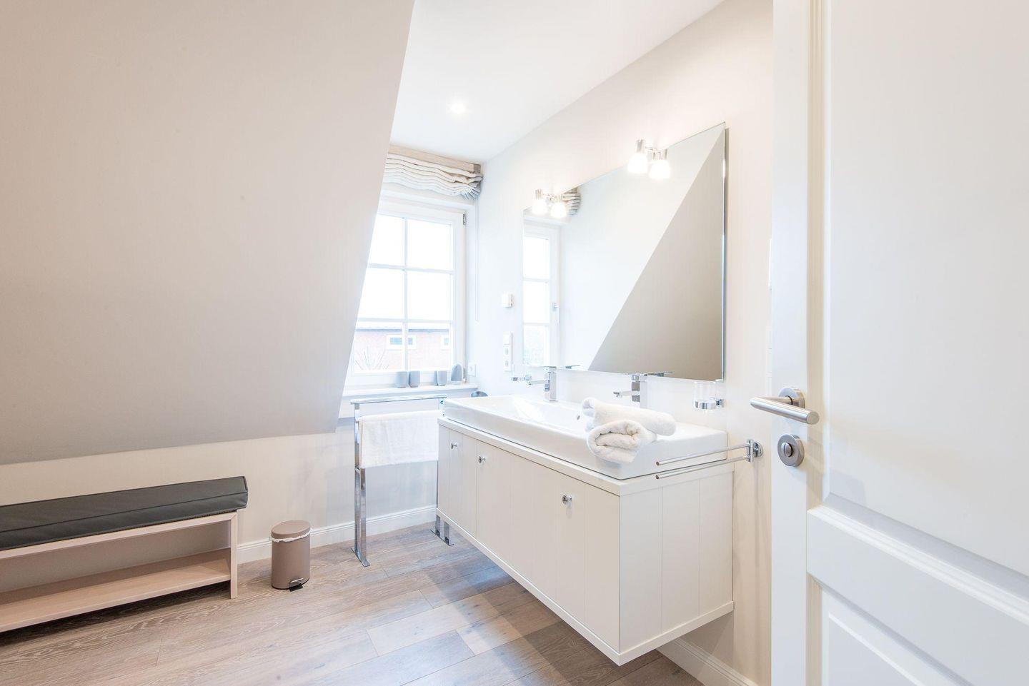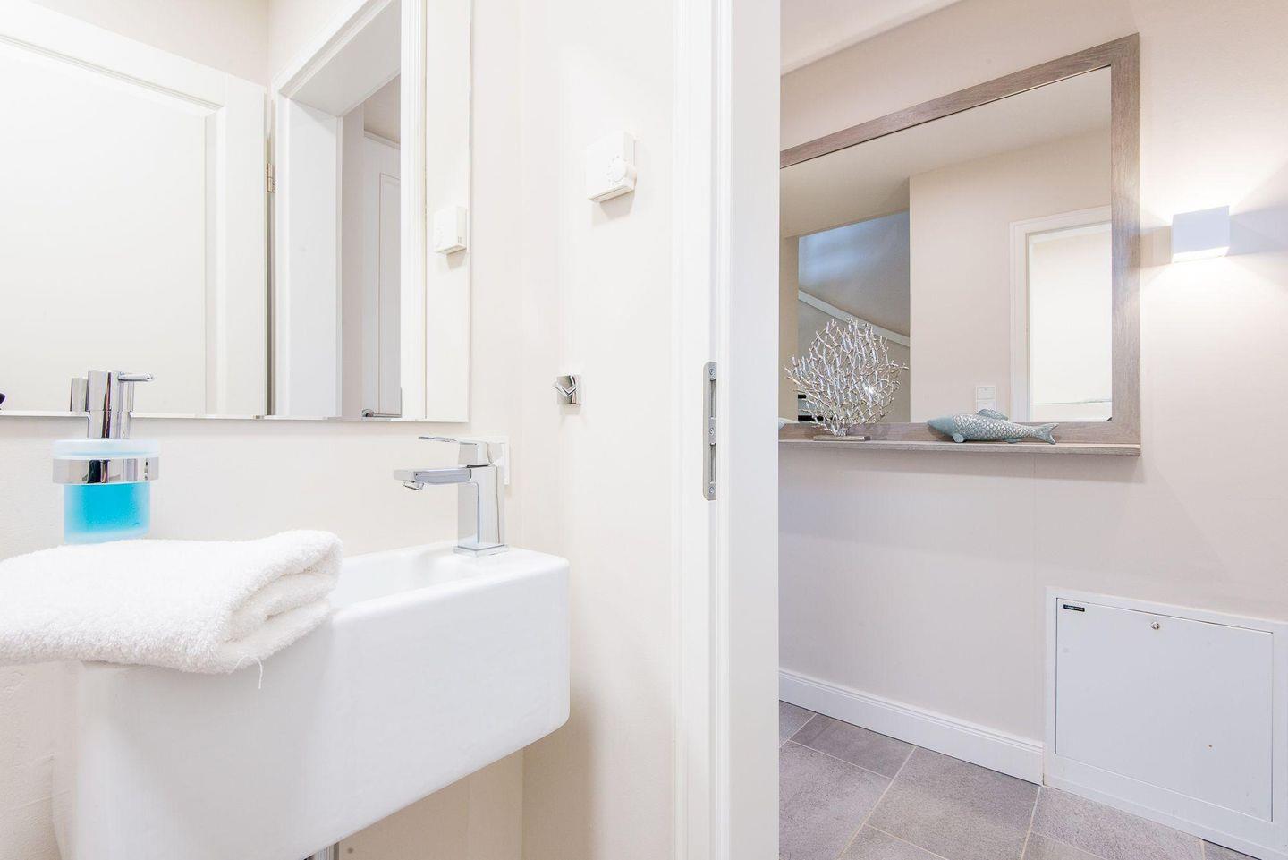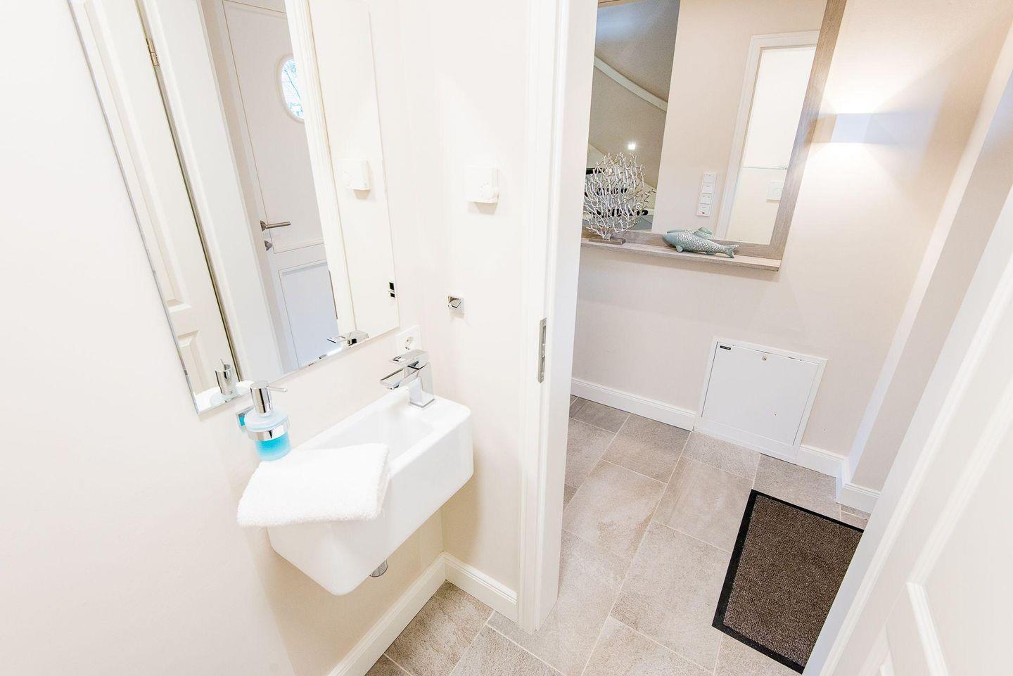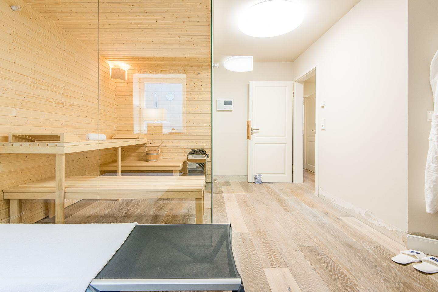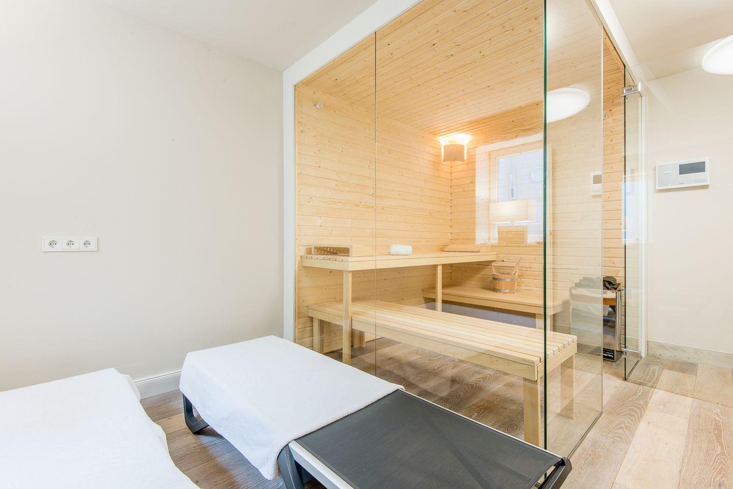 Für höchsten Komfort sorgen zwei moderne Badezimmer mit ebenerdigen Duschen, Doppelwaschbecken, Handtuchwärmern und Tageslicht sowie ein zusätzliches Gäste-WC im Erdgeschoss. Im Wellnessbereich des Hauses befindet sich eine große, private Sauna und ein Ruheraum, der nach einem Tag voller Erlebnisse zur Entspannung einlädt.