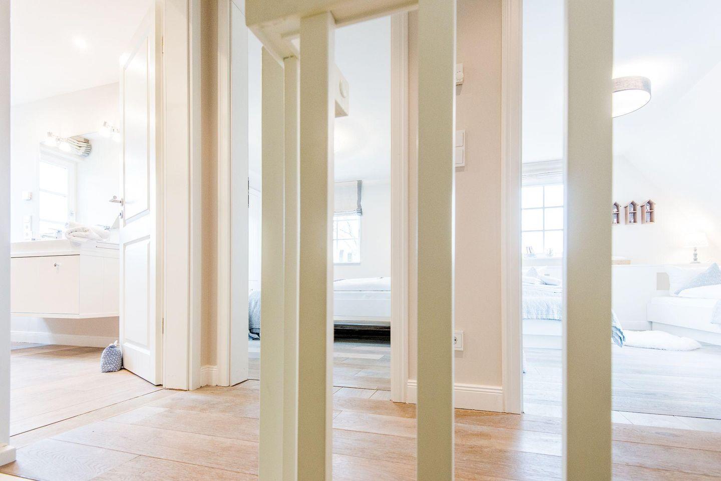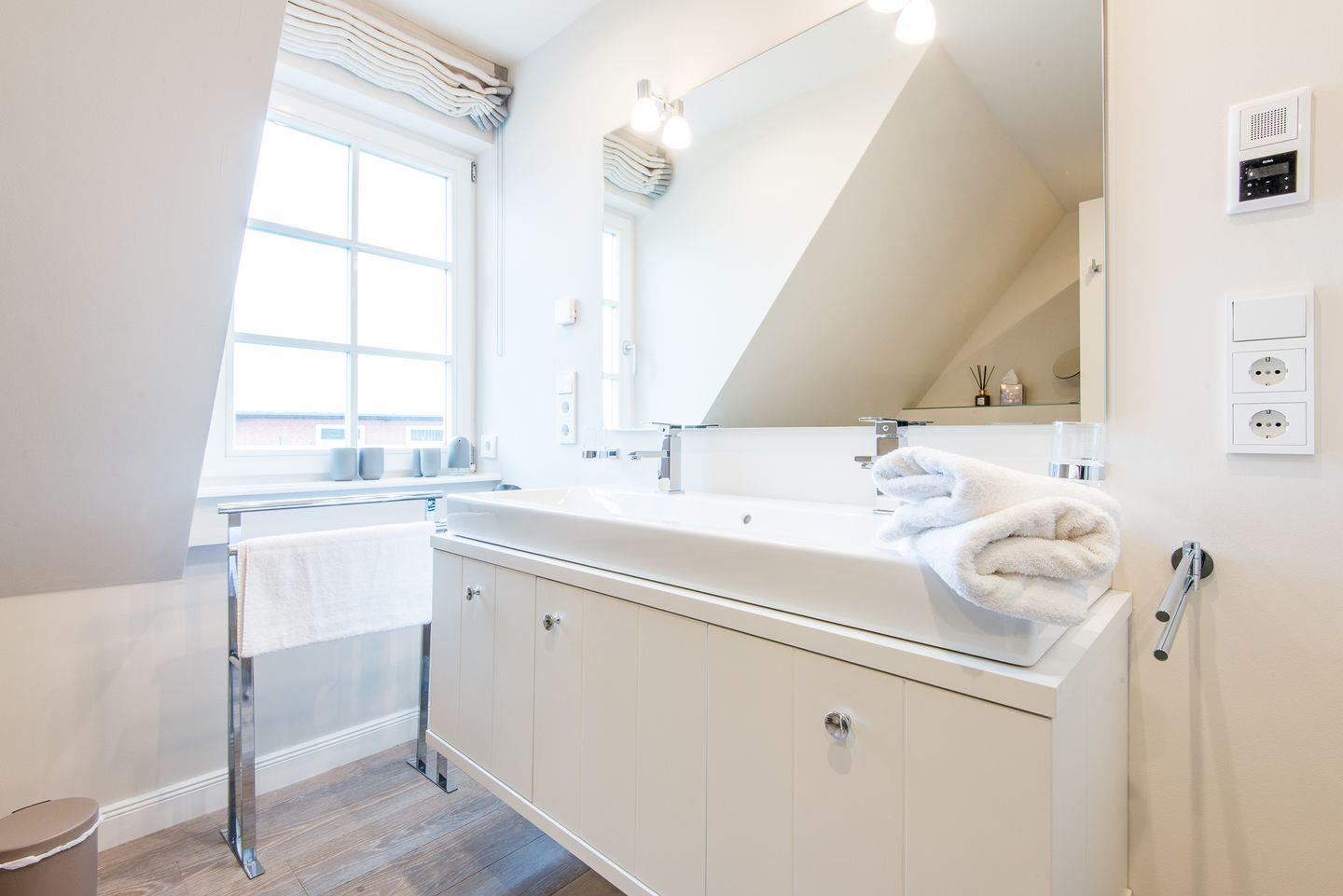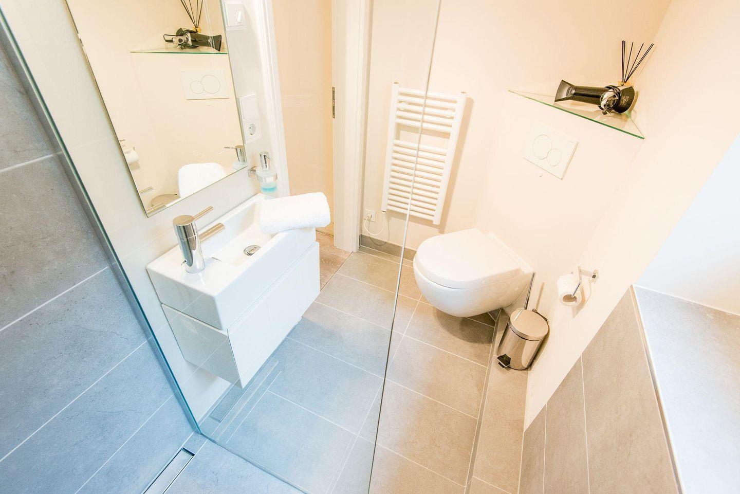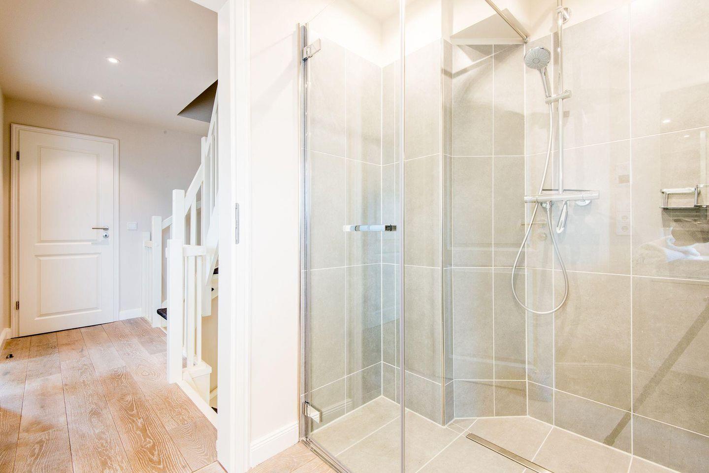 Für höchsten Komfort sorgen zwei moderne Badezimmer mit ebenerdigen Duschen, Doppelwaschbecken, Handtuchwärmern und Tageslicht sowie ein zusätzliches Gäste-WC im Erdgeschoss. Im Wellnessbereich des Hauses befindet sich eine große, private Sauna und ein Ruheraum, der nach einem Tag voller Erlebnisse zur Entspannung einlädt.
