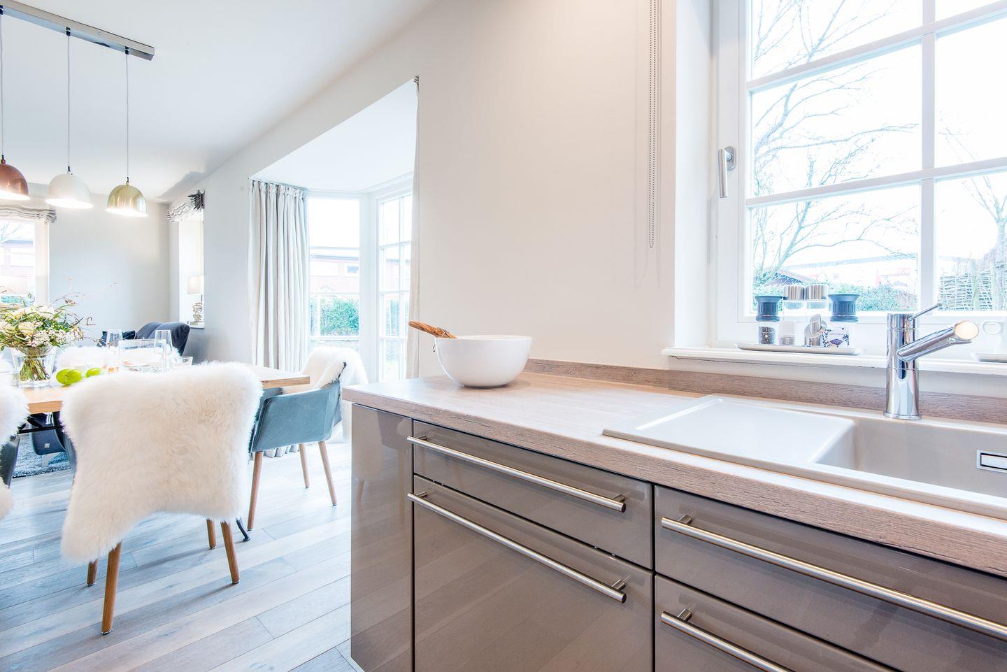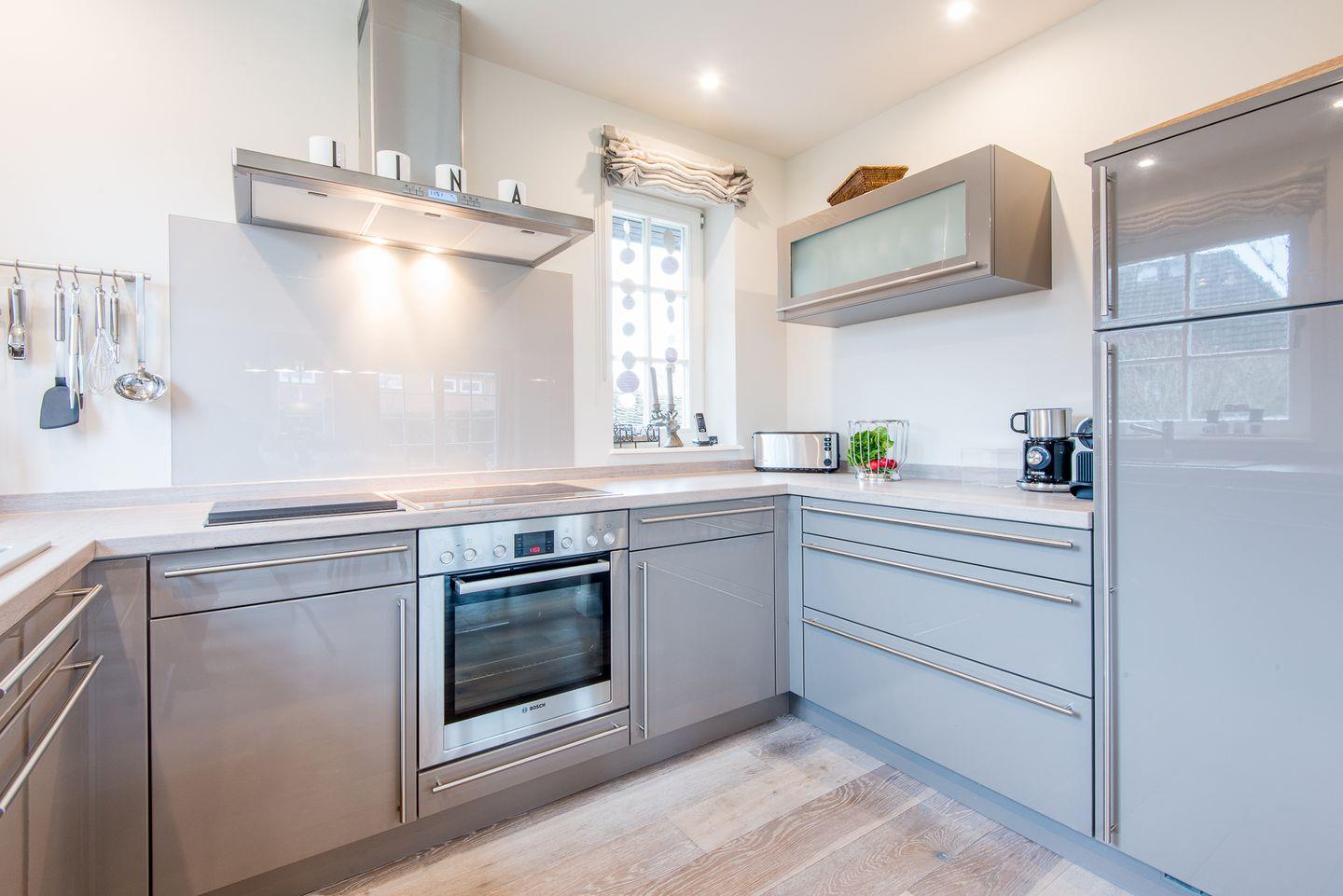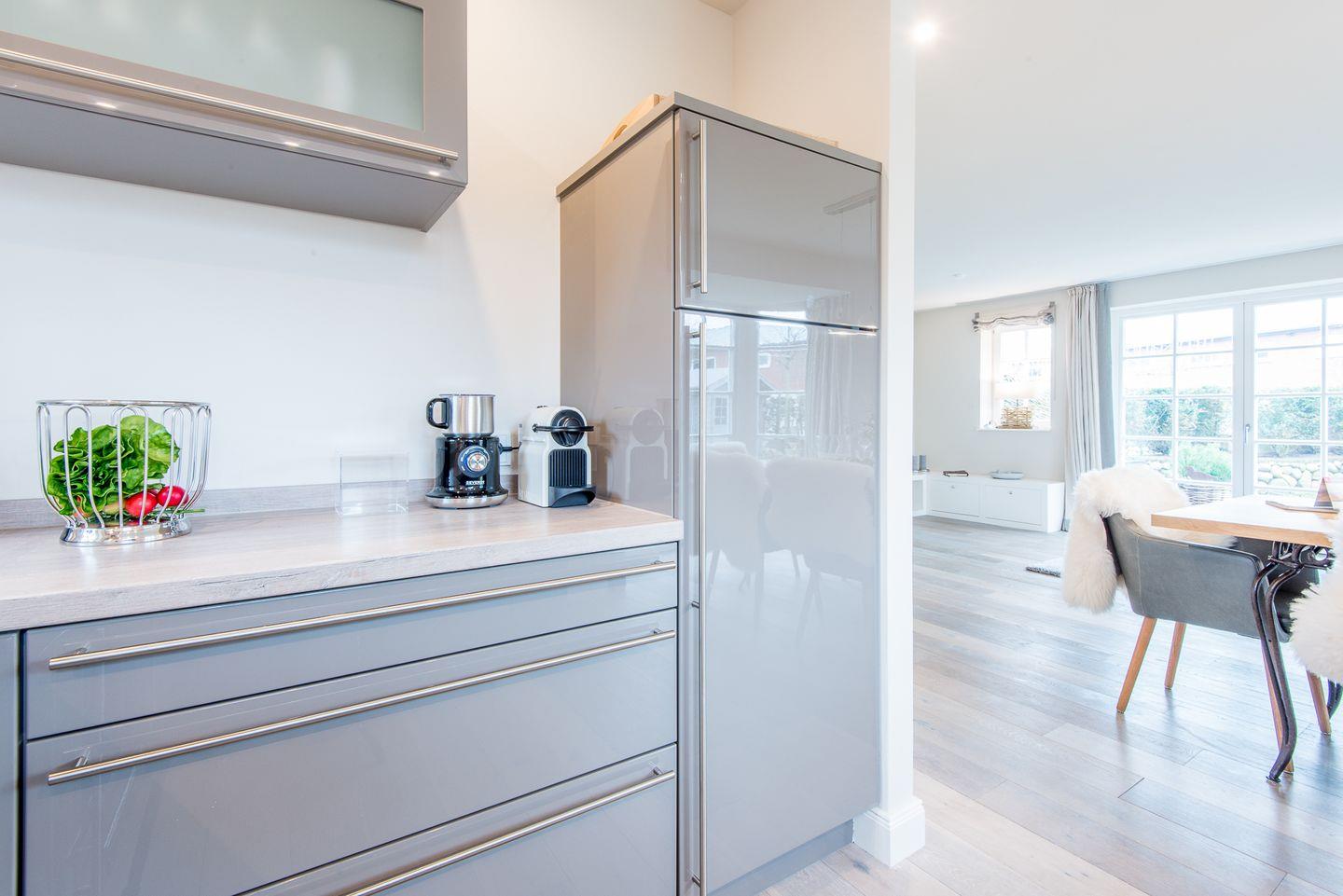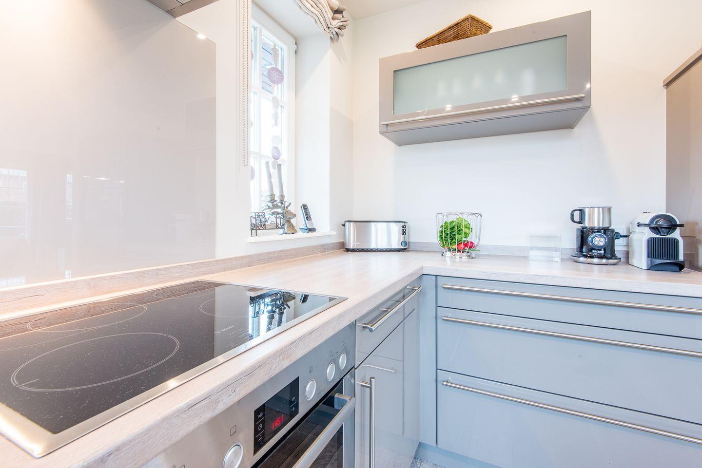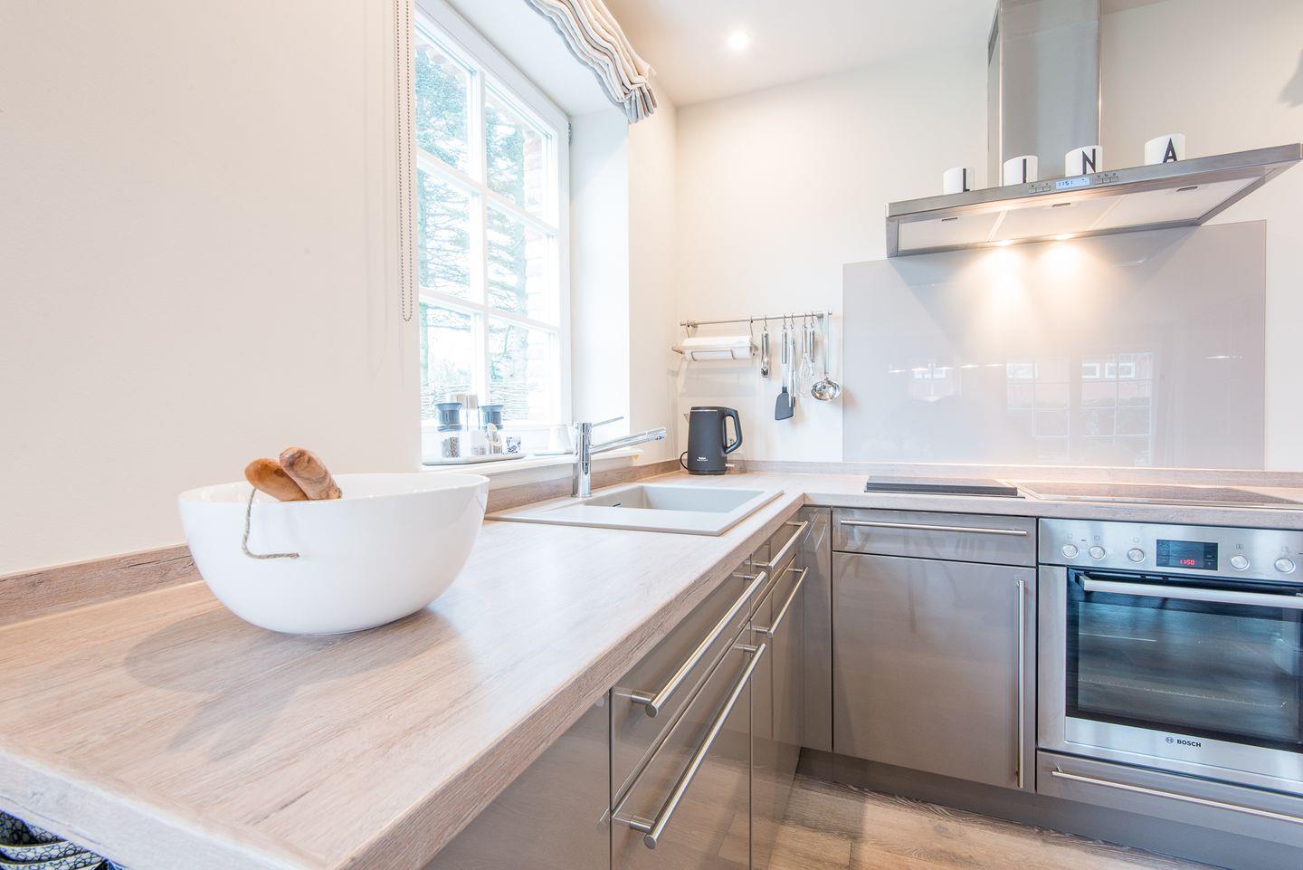 Die angrenzende Küche lässt keine Wünsche offen. Sie verfügt über einen Geschirrspüler, Backofen, Filterkaffeemaschine, Nespresso-Maschine und Cerankochfeld – ideal für gemeinsames Kochen und gesellige Abende.